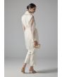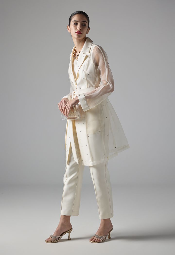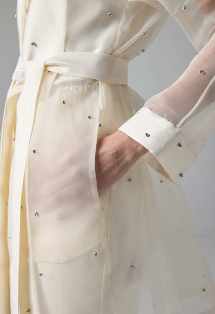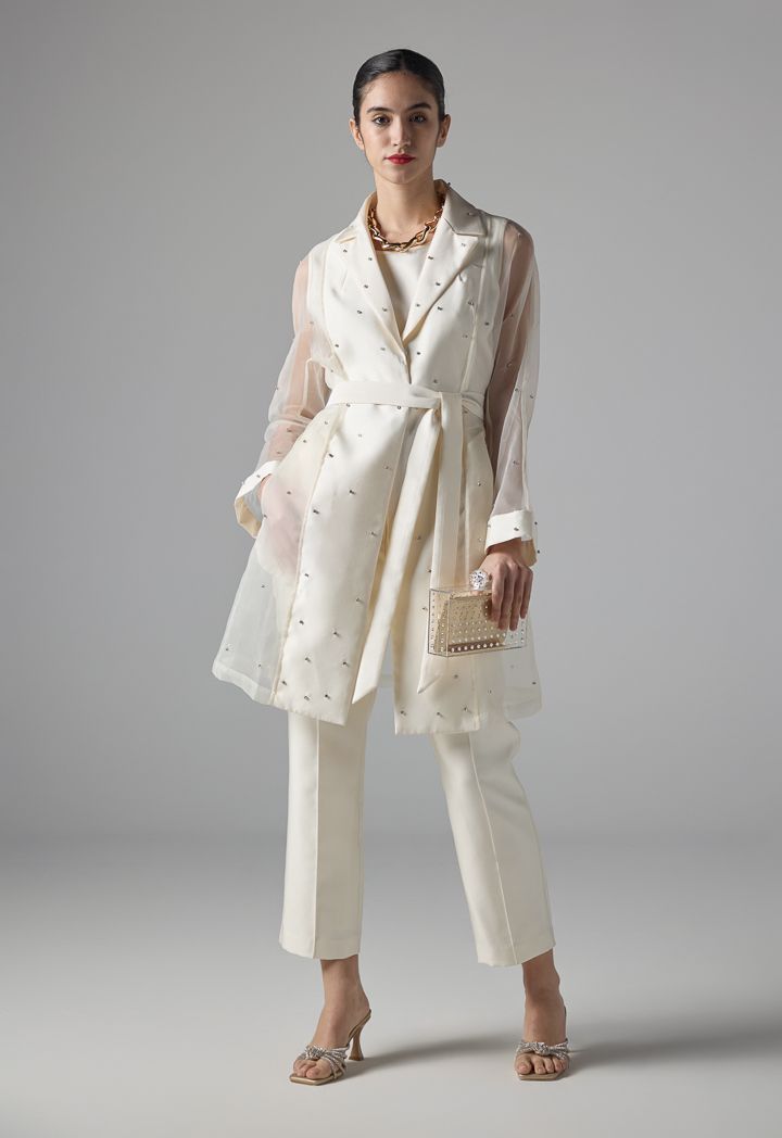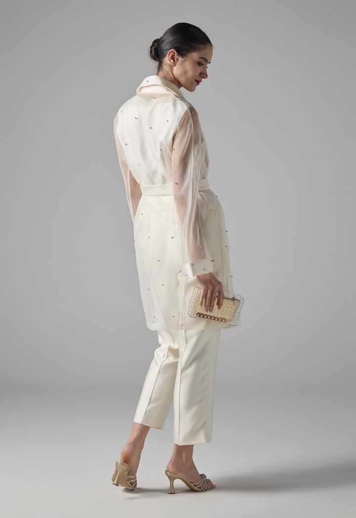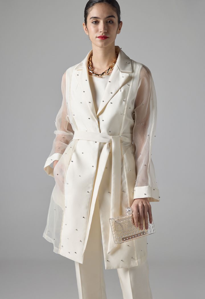 Design: Solid, Organza, Embellished, Rhinestones, Pockets, Self Fabric Belt, Double Breasted