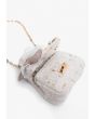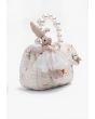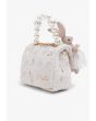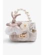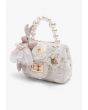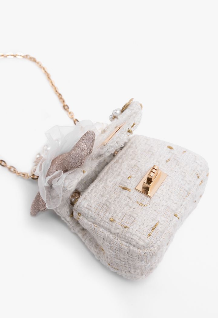 A crossbody bag that features a crystal and faux pearls embellished tweed design and a shoulder chain.