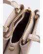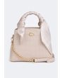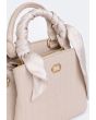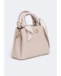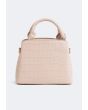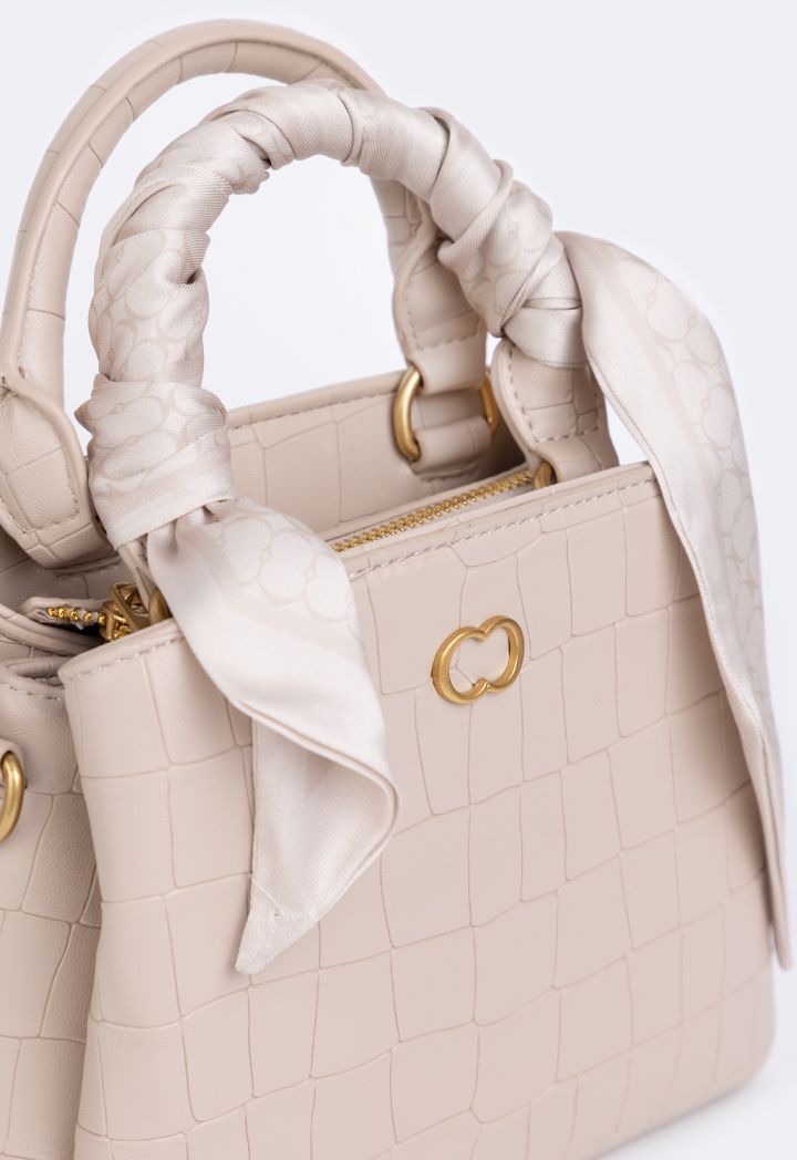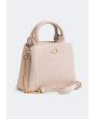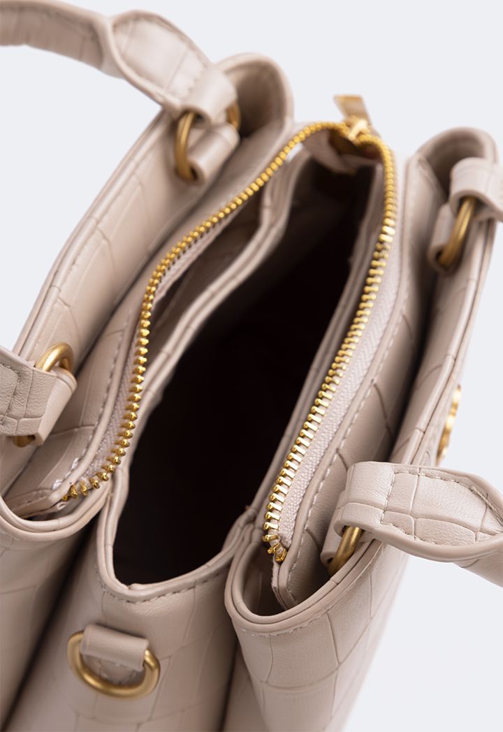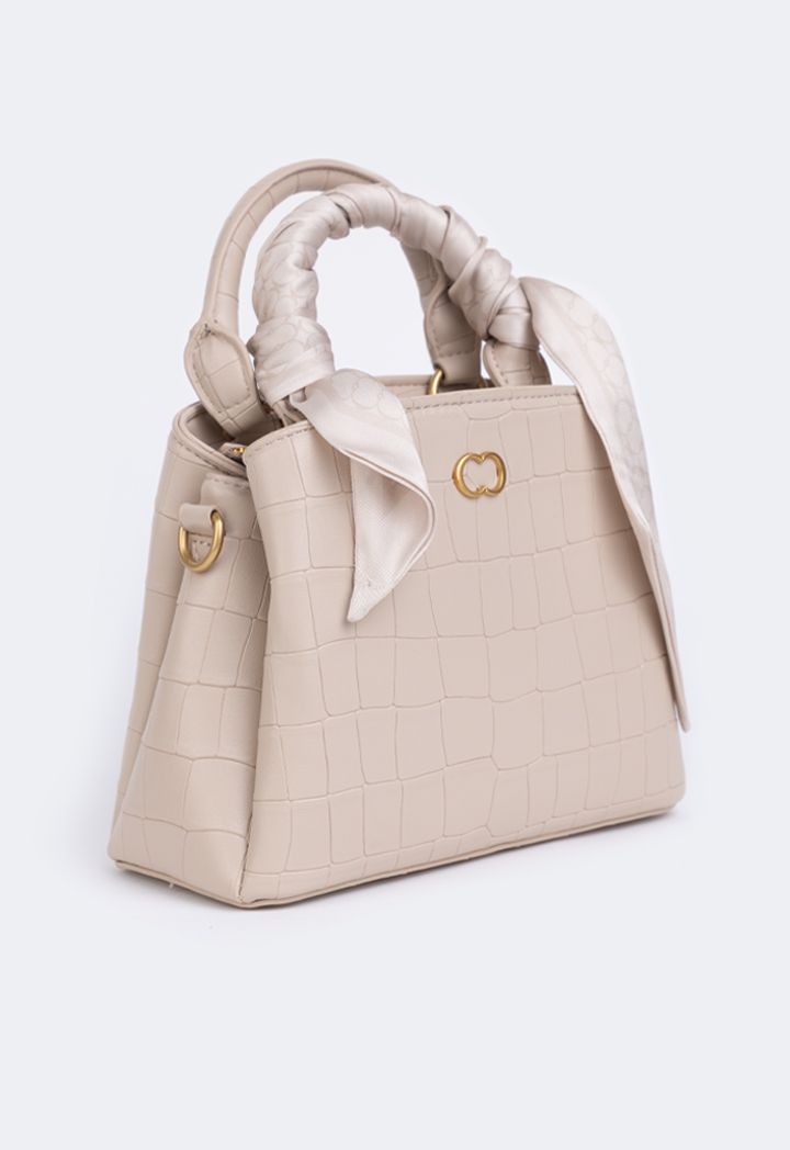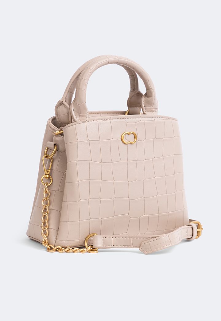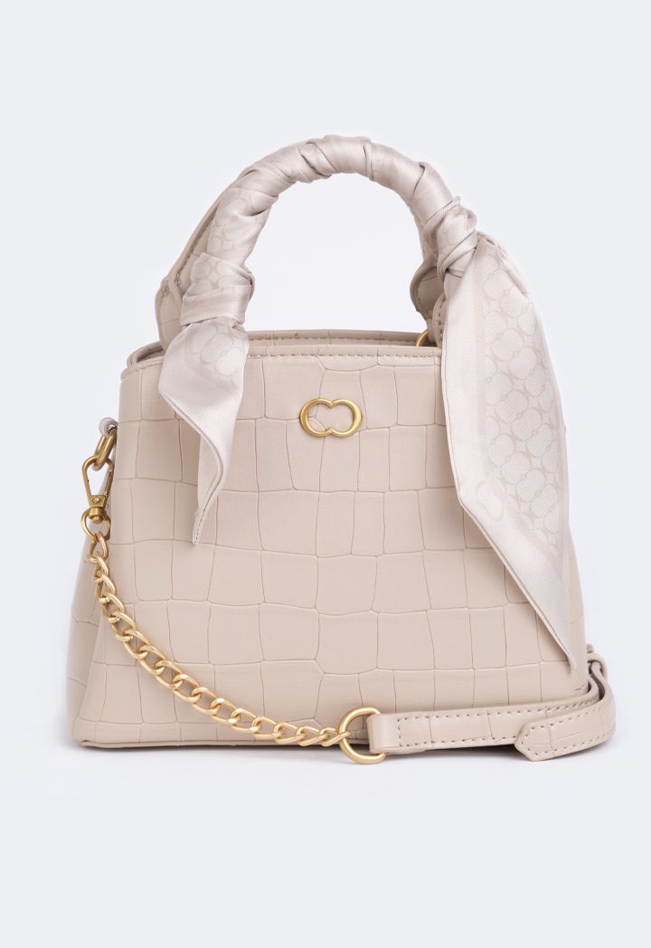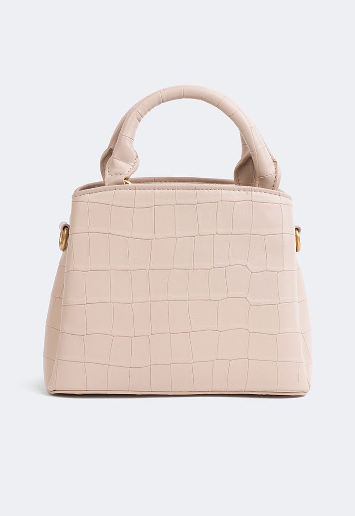 A modern handbag featuring a solid outline, embossed croc design and a metallic emblem.