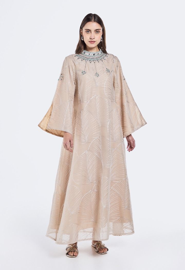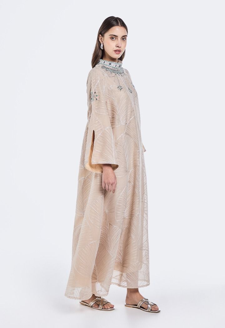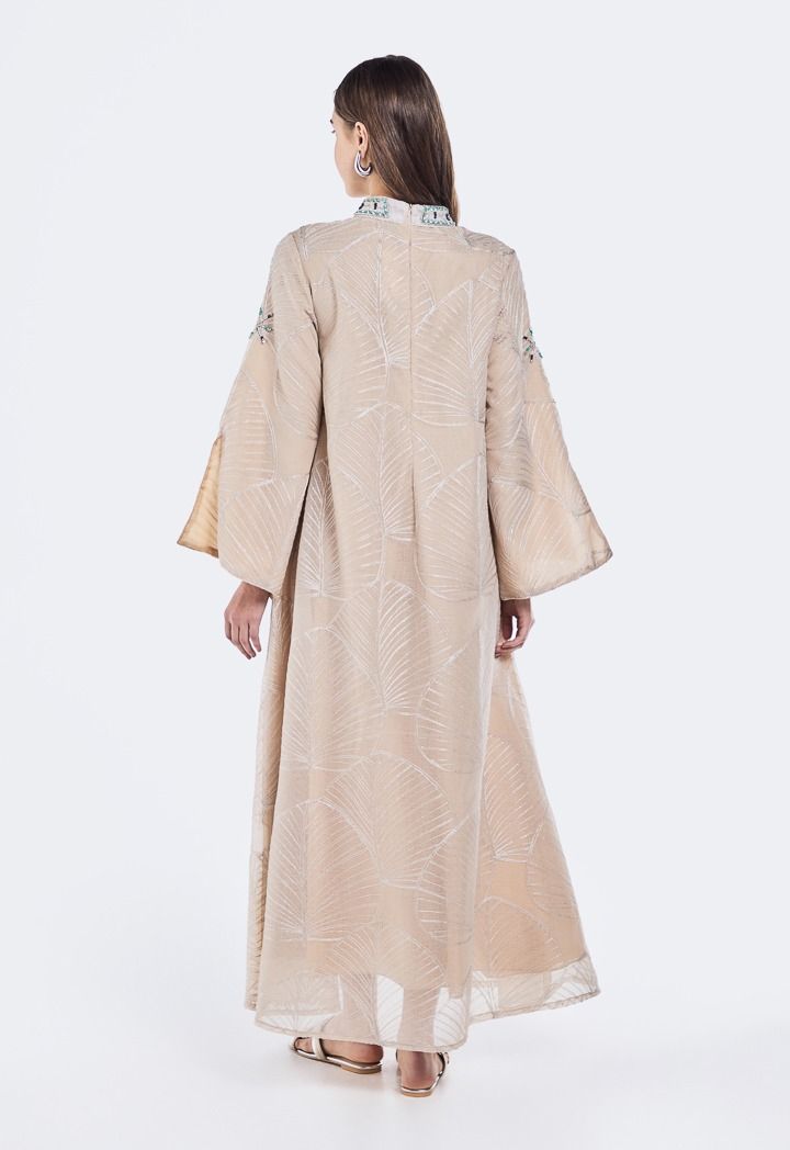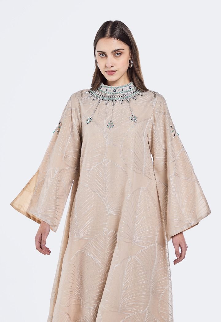 Stand out with simple elegance in an abaya adorned with crystals and beads, a luxurious design that adds a touch of opulence and completes your look with exquisite details.