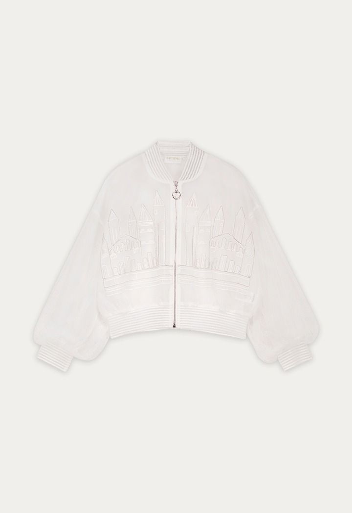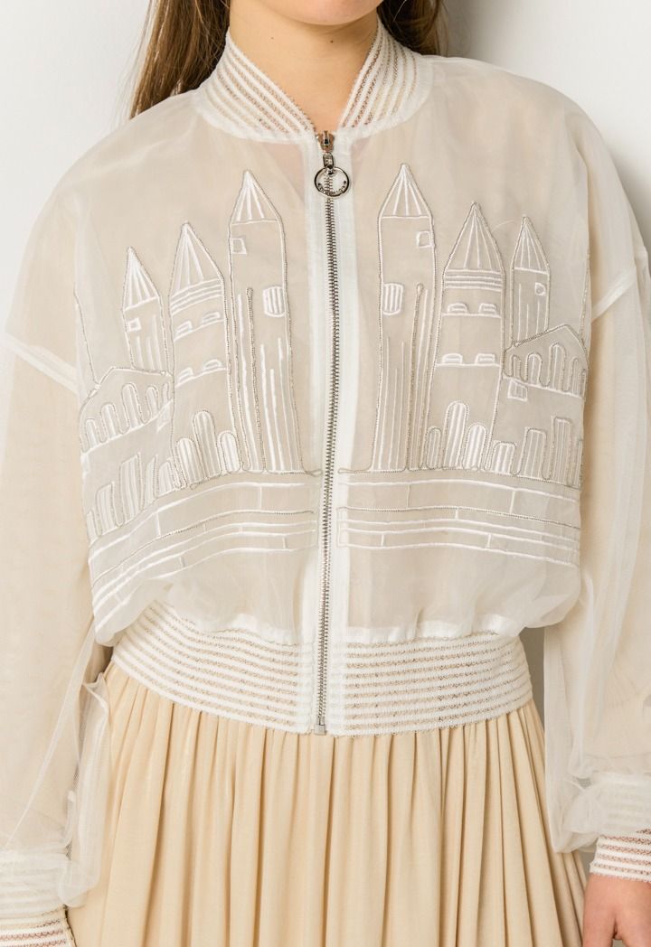 Embroidered organza bomber jacket that adds a light, modern shimmer to any look.