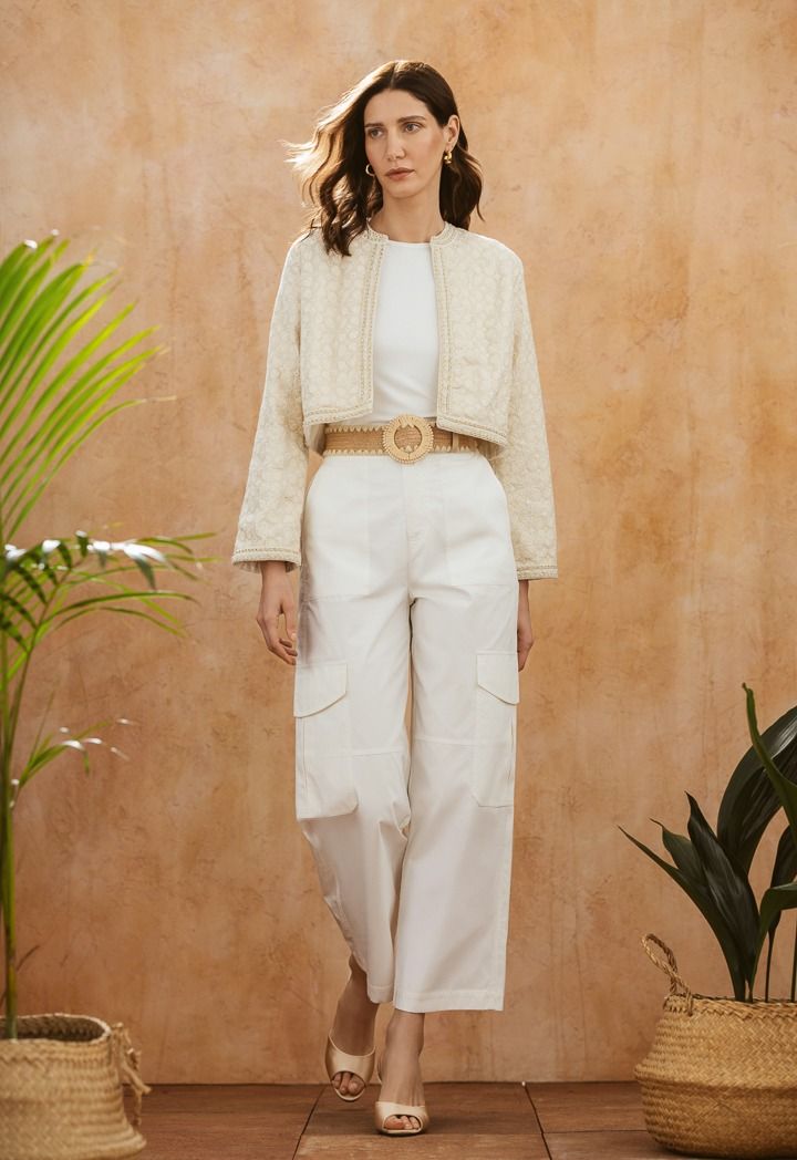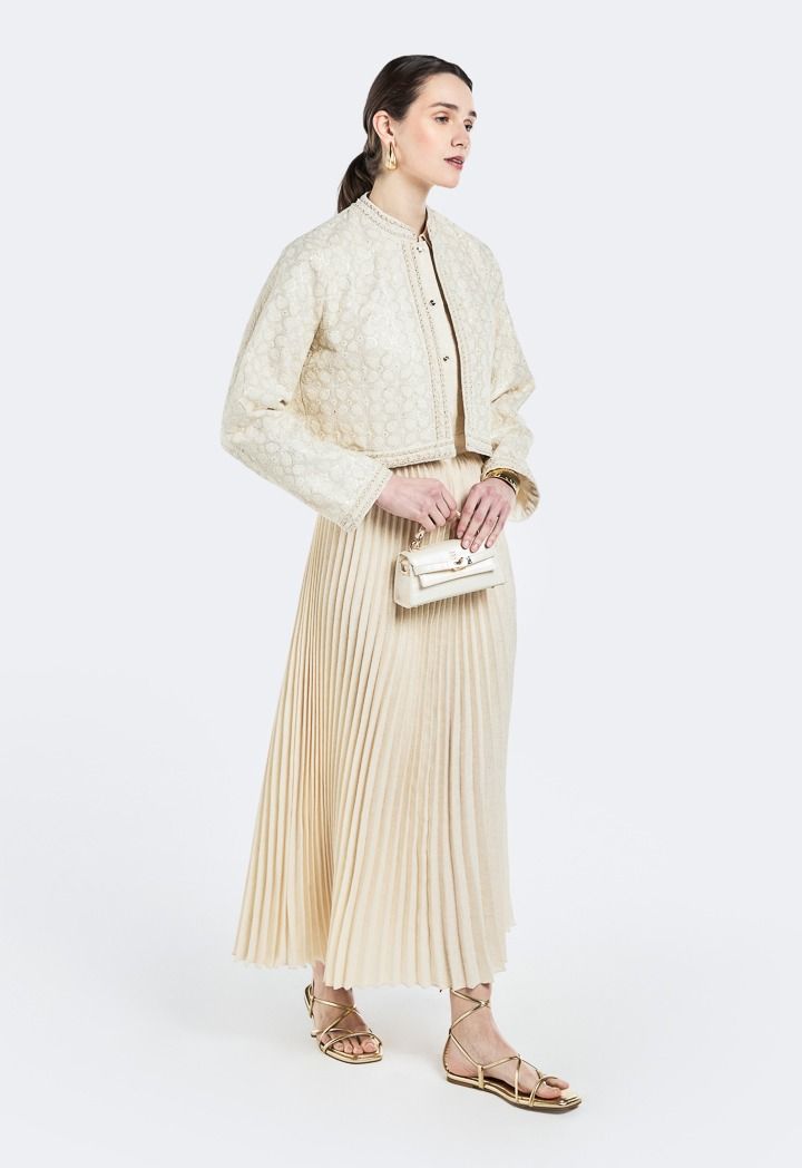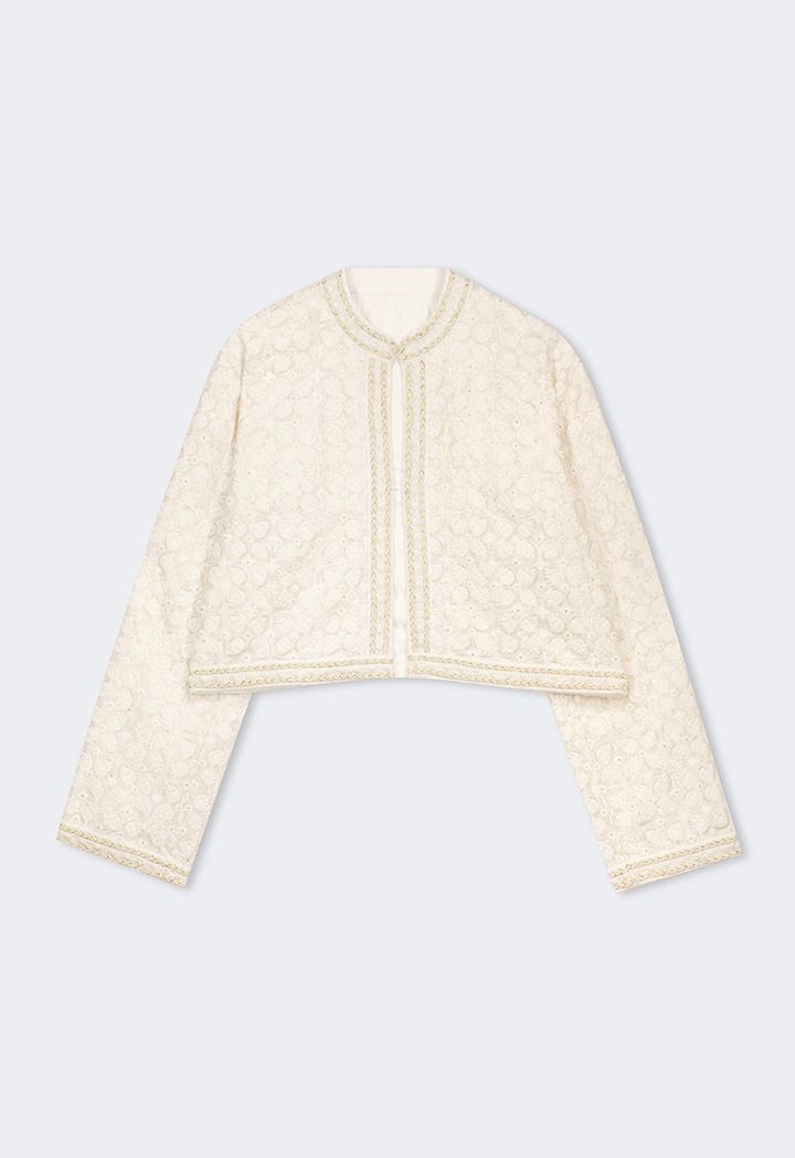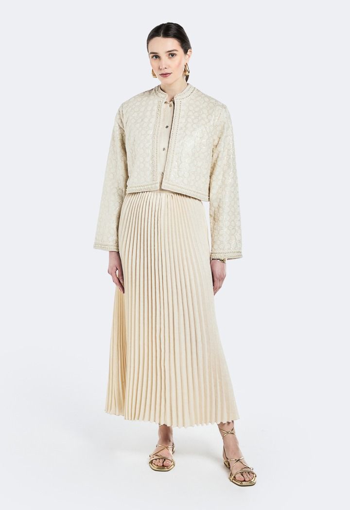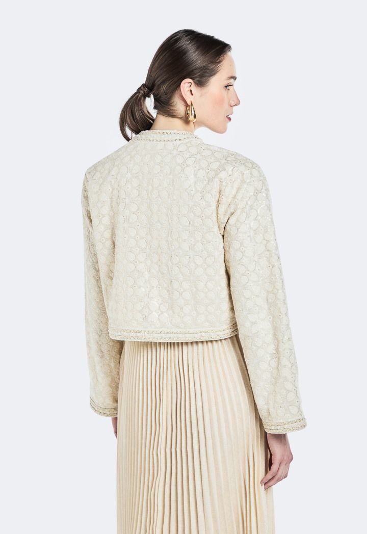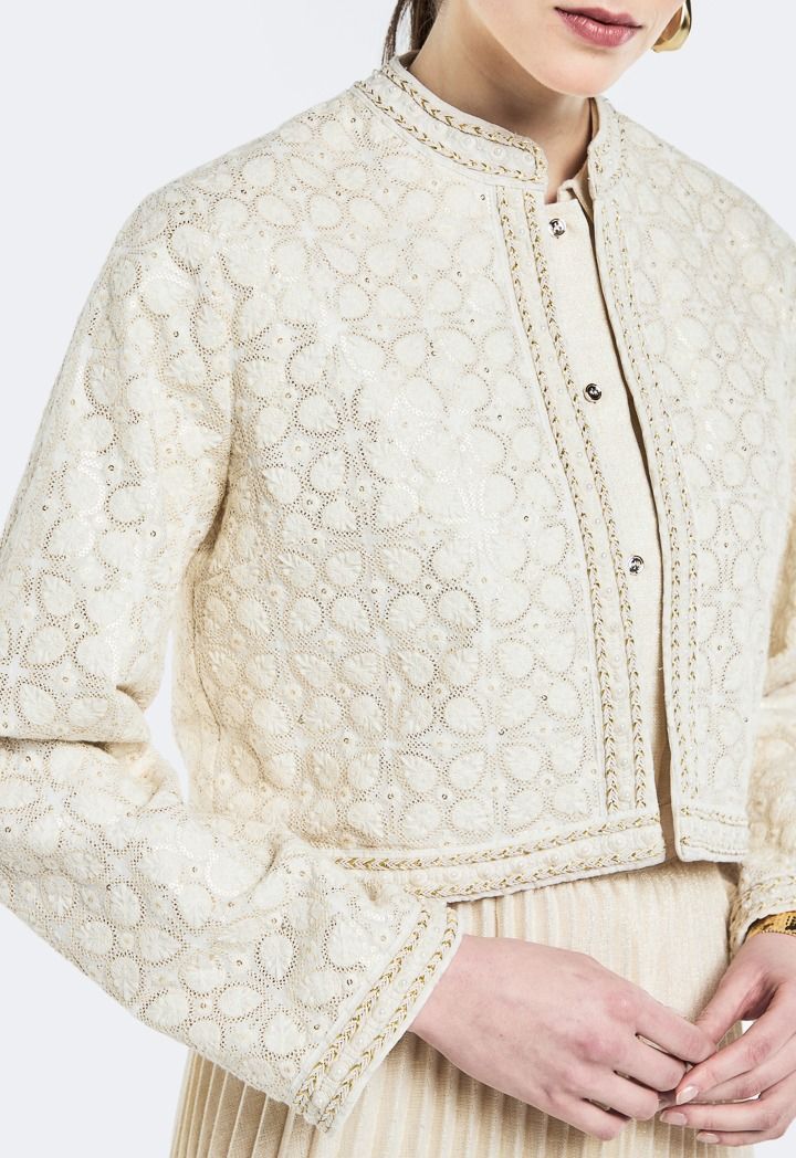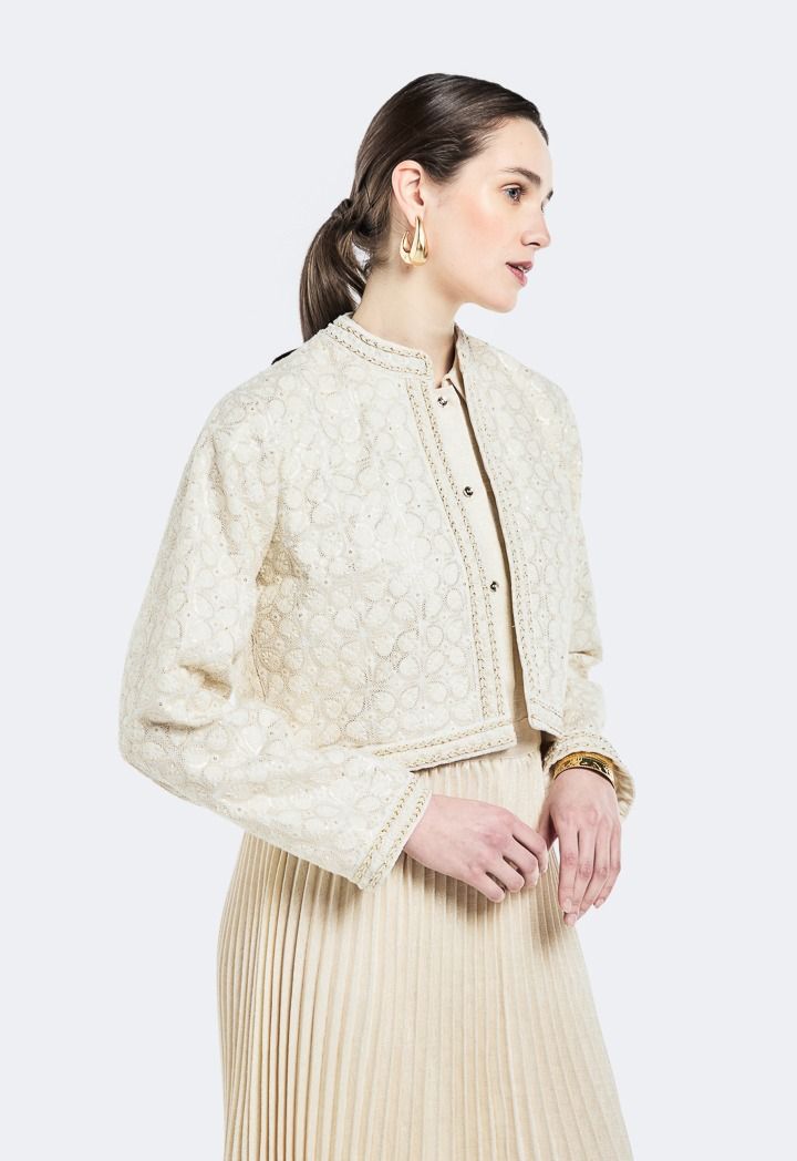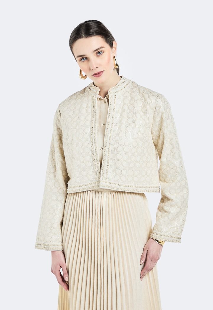 Experience modern glamour with the embroidered jacket, a stunning blend of classic and contemporary styles. For a polished look, layer it over a simple dress and add statement heels for a touch of drama.