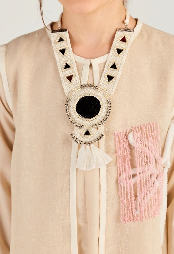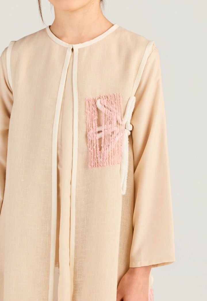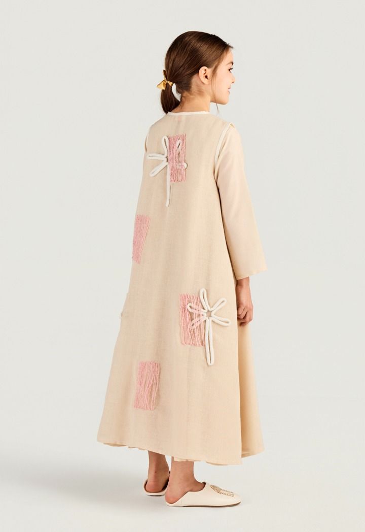 Raised rope and thread patches add a subtle artsy twist to this light, easy abaya