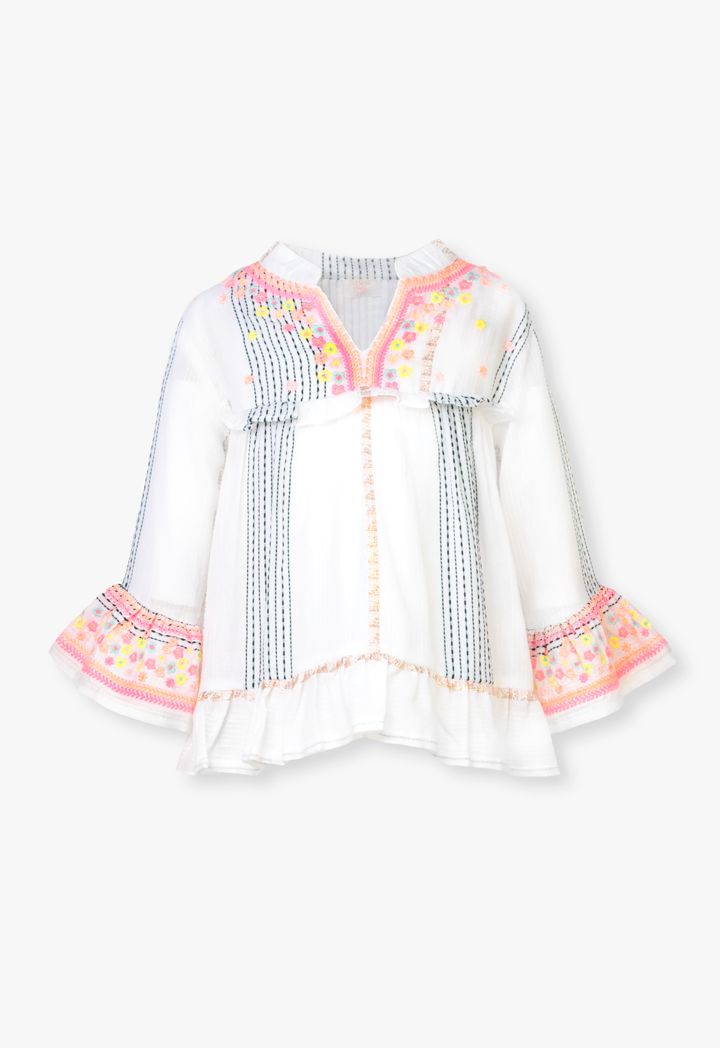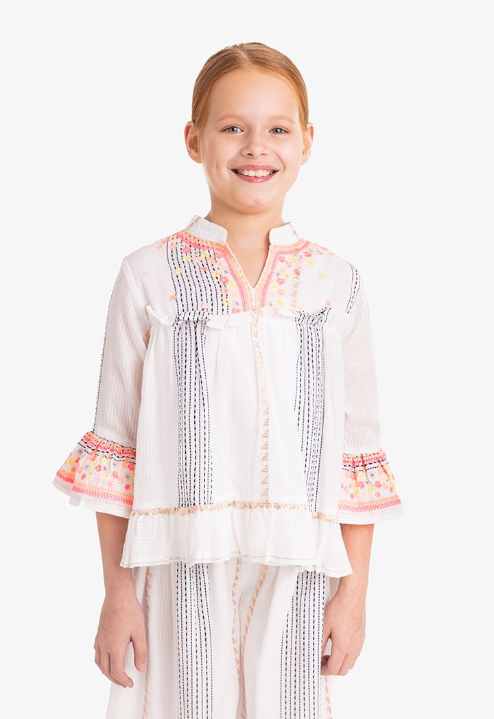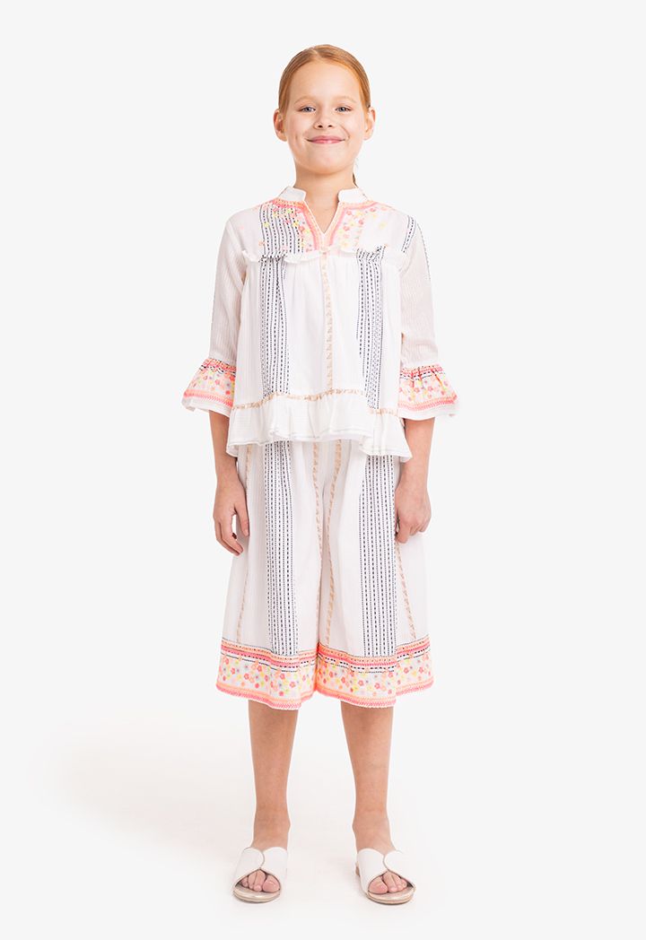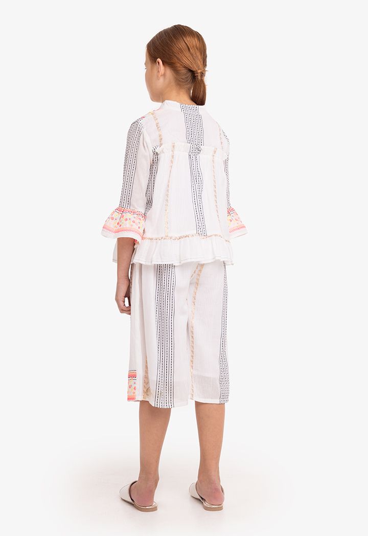 Your daughter's closet will get an update when you include this Striped embroidered Set. The Blouse features a V-Neck and three Quarter Sleeves. It comes with an Elastic Waistband Trouser.