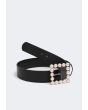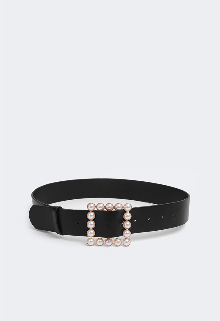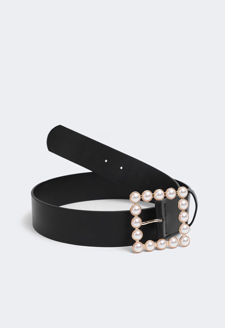 A unique belt that features a square buckle that is embellished with faux pearls.