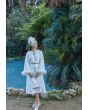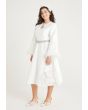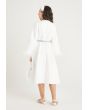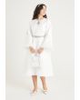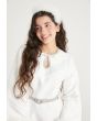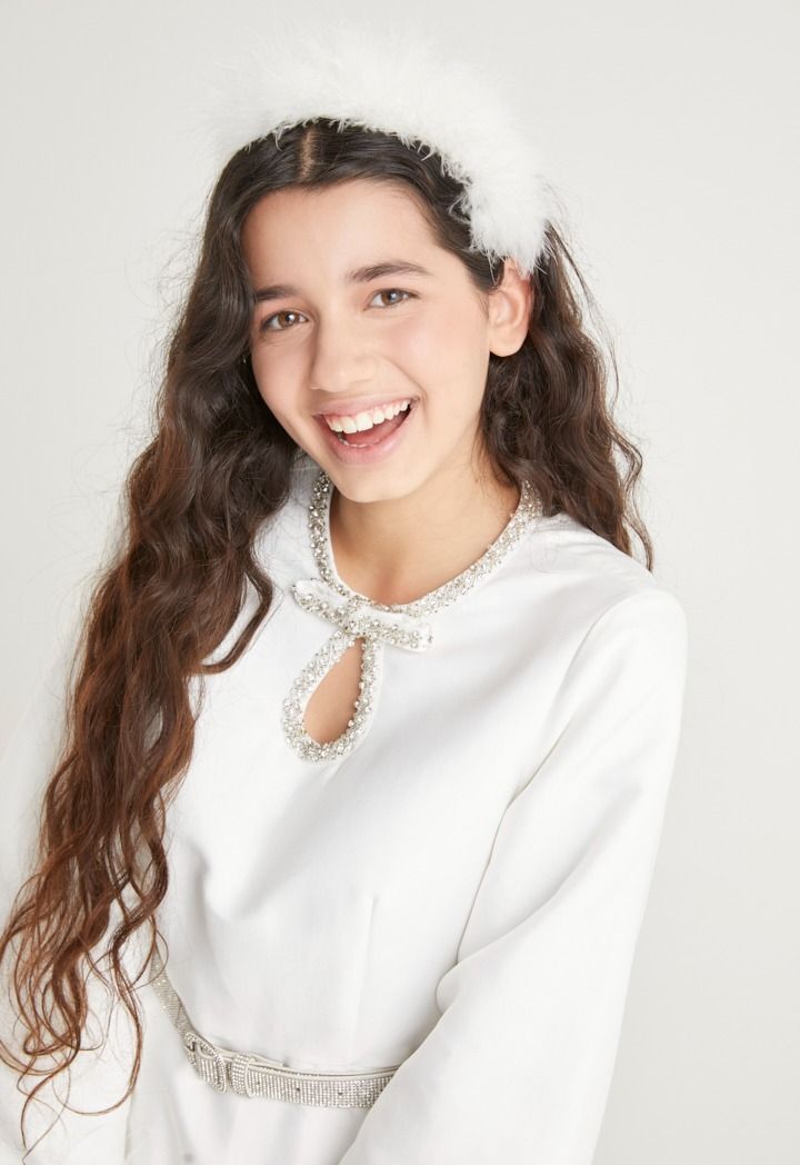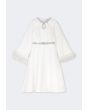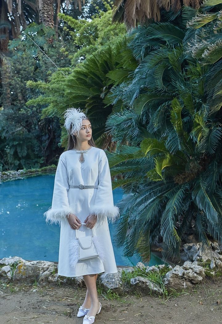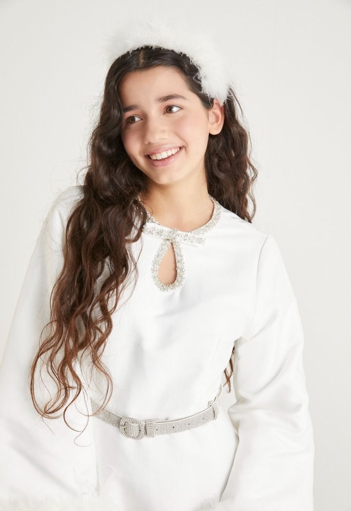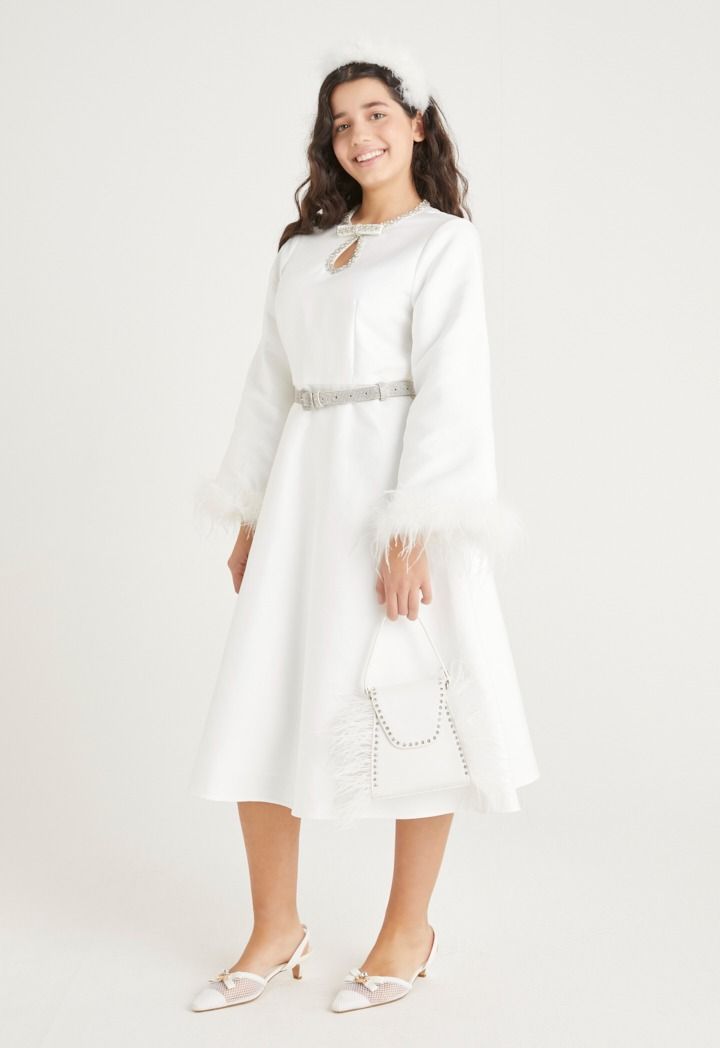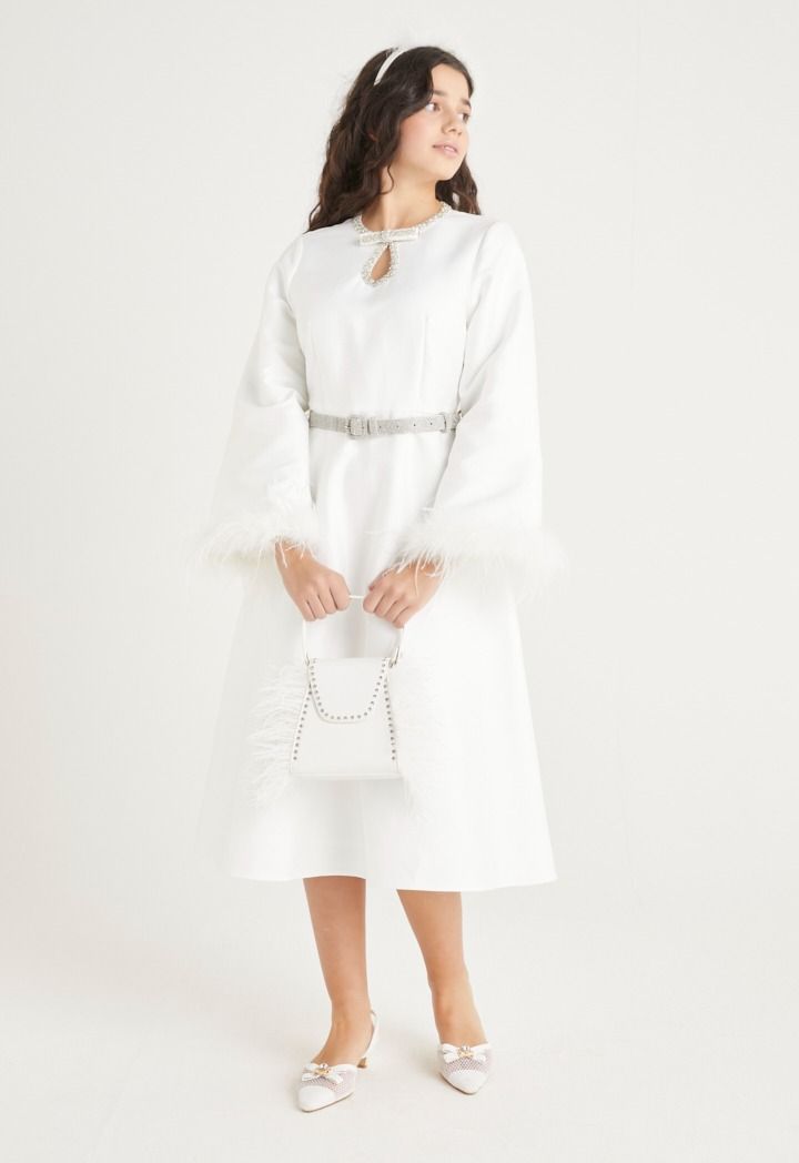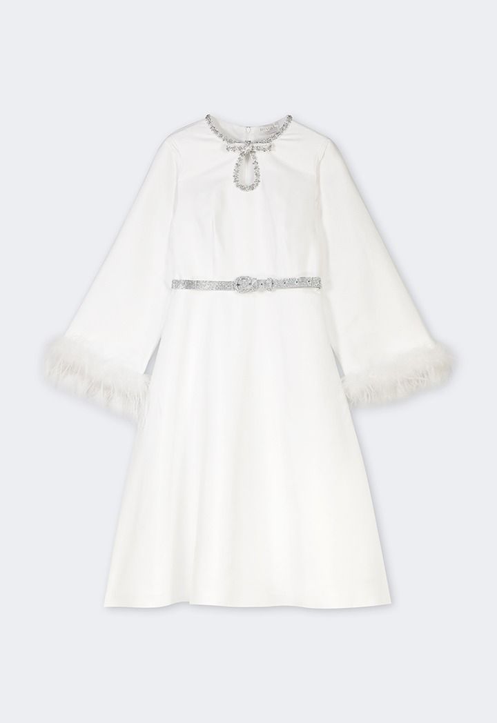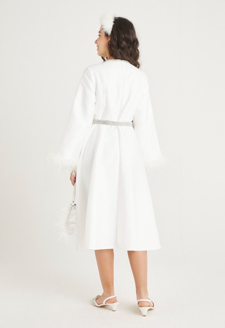 An out of the ordinary dress featuring a beaded neck and faux feather embellished sleeves.