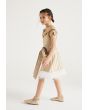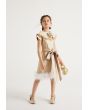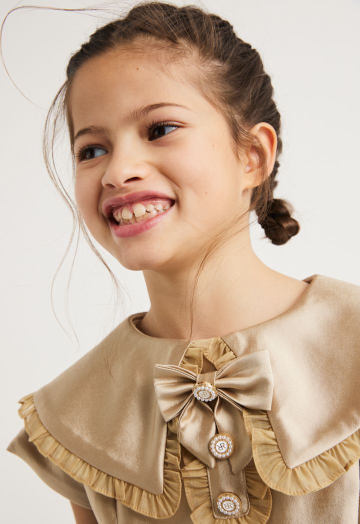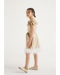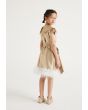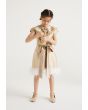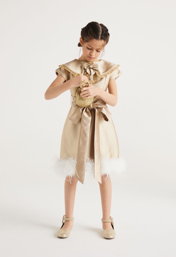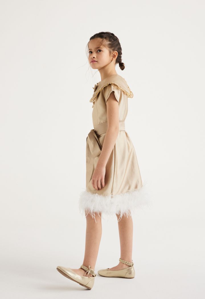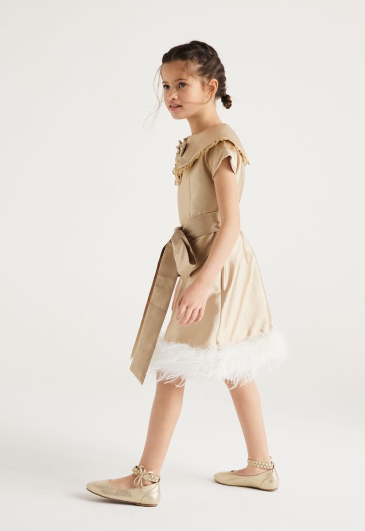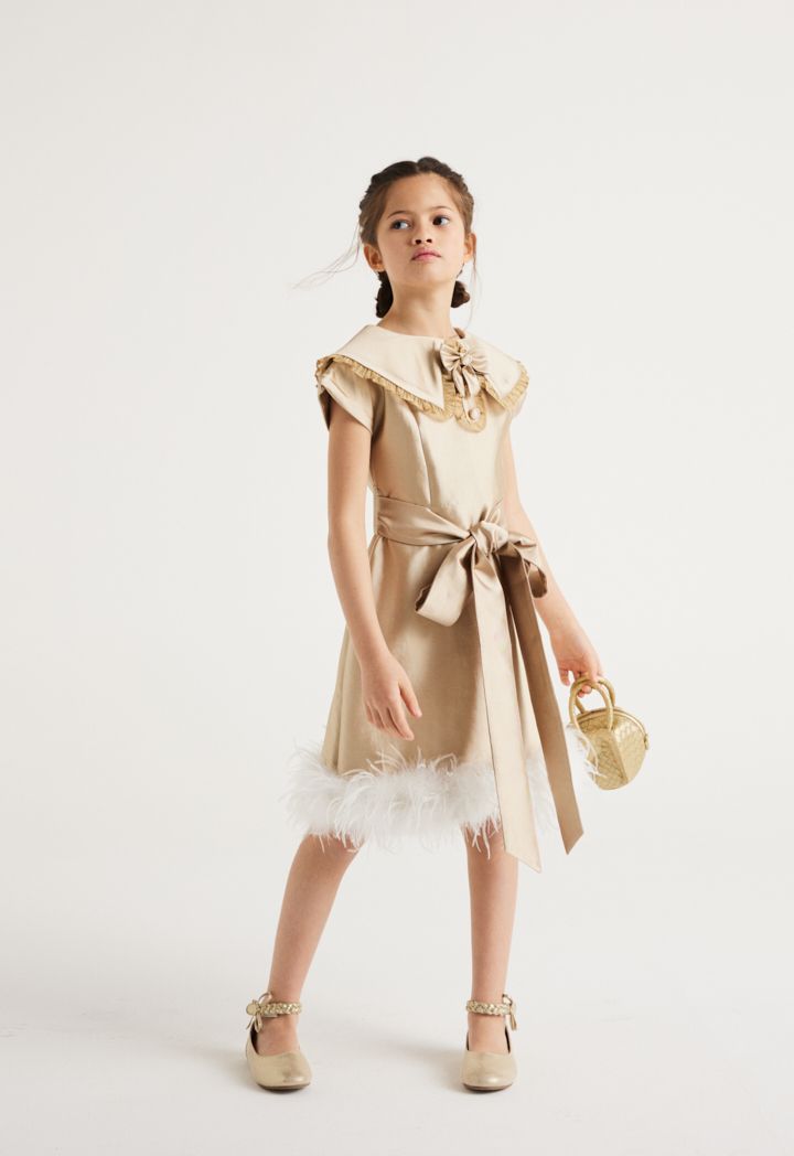 Fashionable Knee Long Dress. Featuring Winged Collar, Cap Sleeves, self Fabric Belt and Feather Hem Details. Attached Lining.