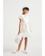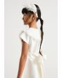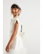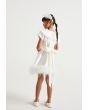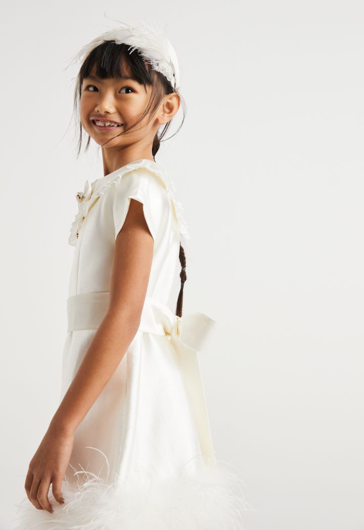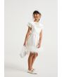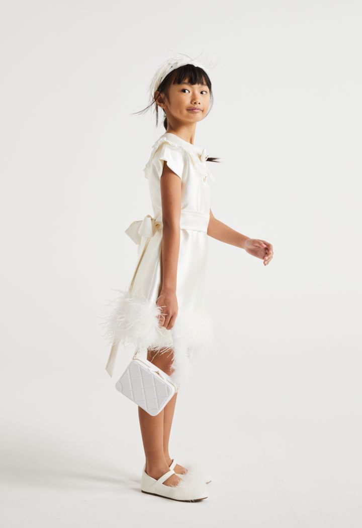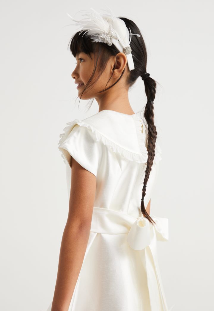 Fashionable Knee Long Dress. Featuring Winged Collar, Cap Sleeves, self Fabric Belt and Feather Hem Details. Attached Lining.