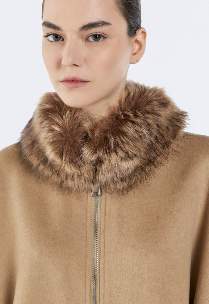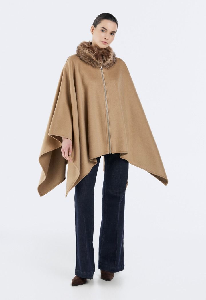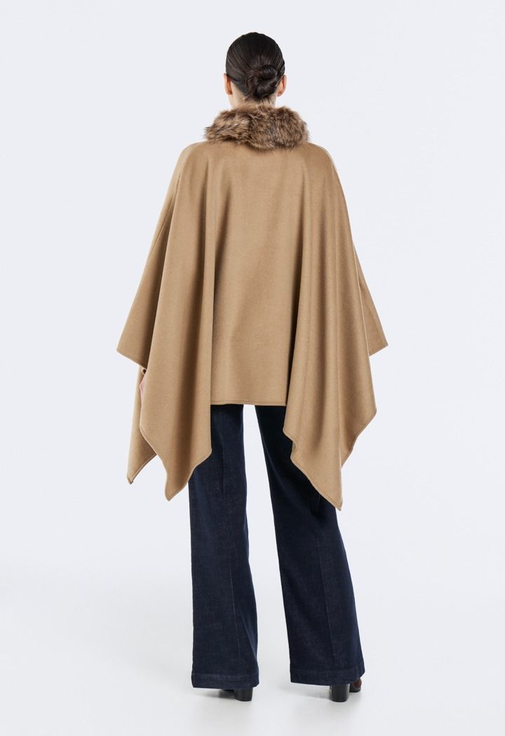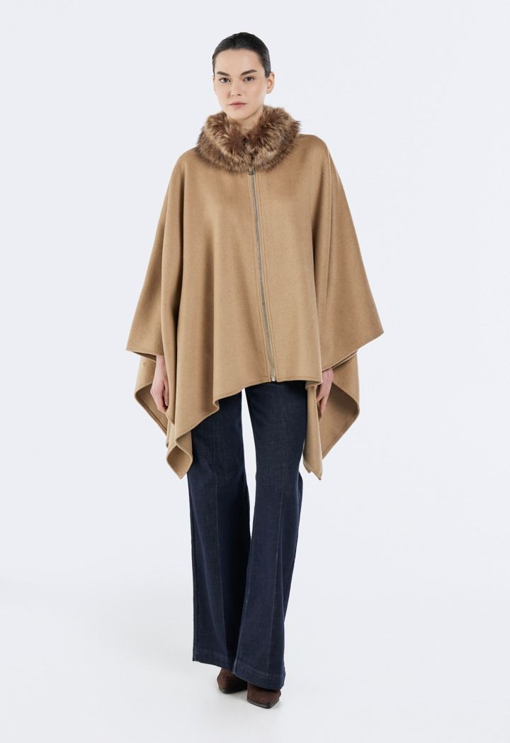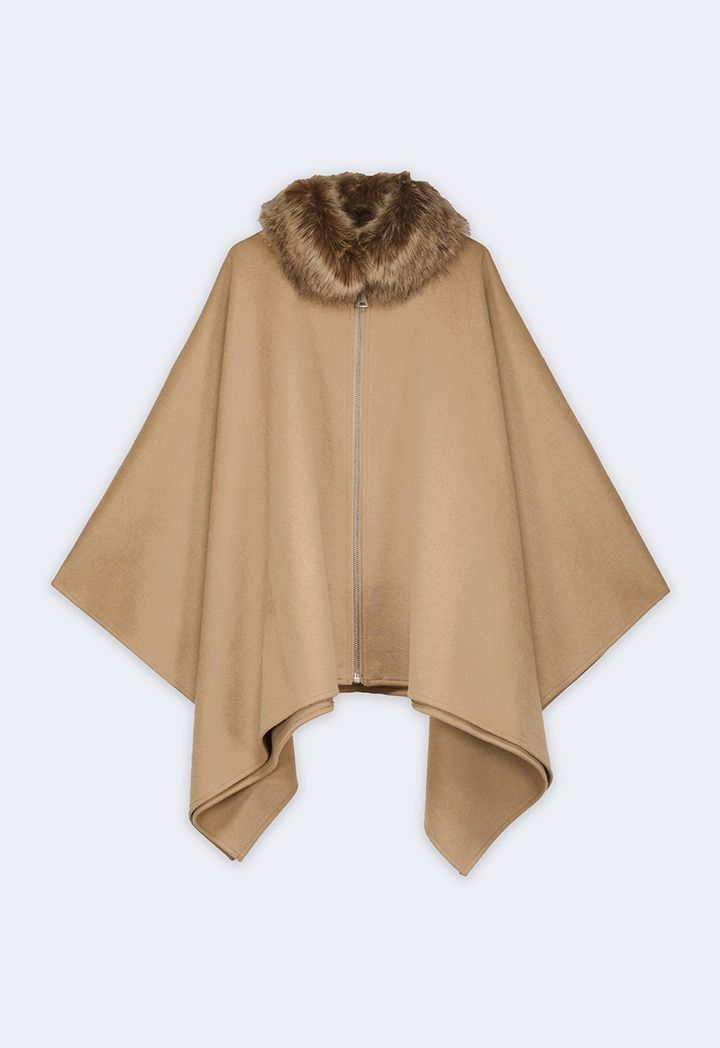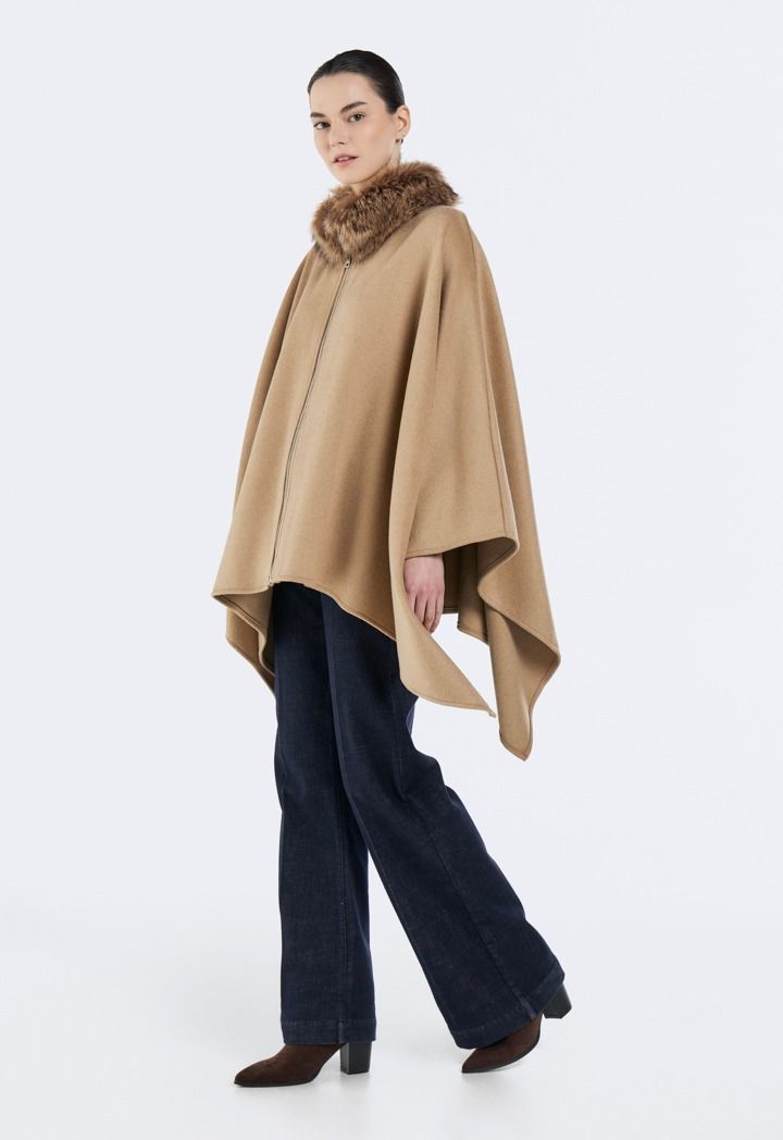 Iconic poncho with a faux fur embellished collar and a front zipper for perfect warmth.