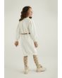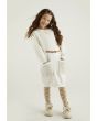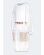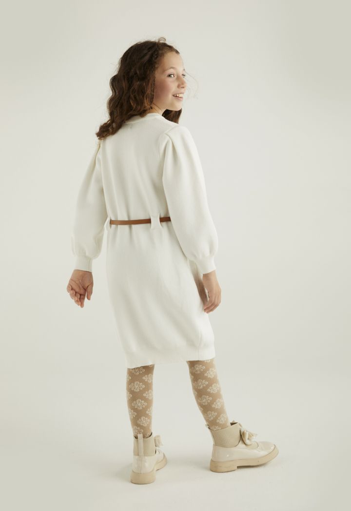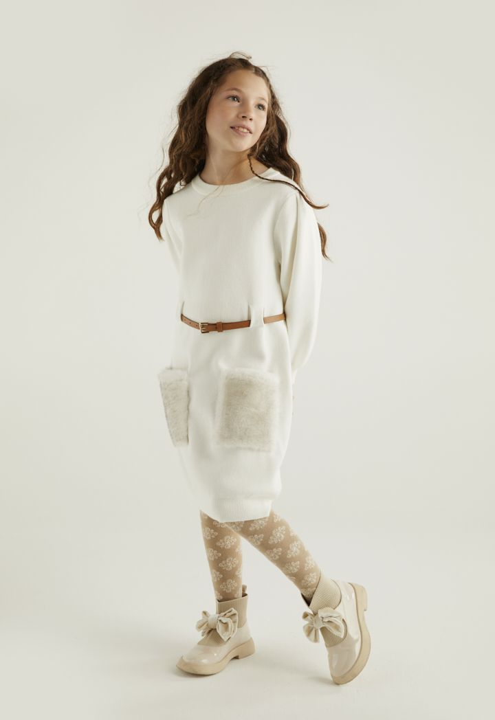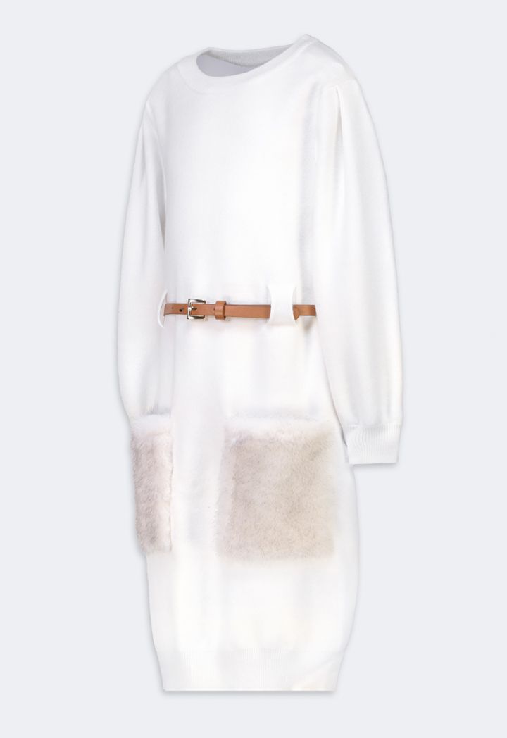 A warm sweater dress that features a solid design, belt and faux fur touches.