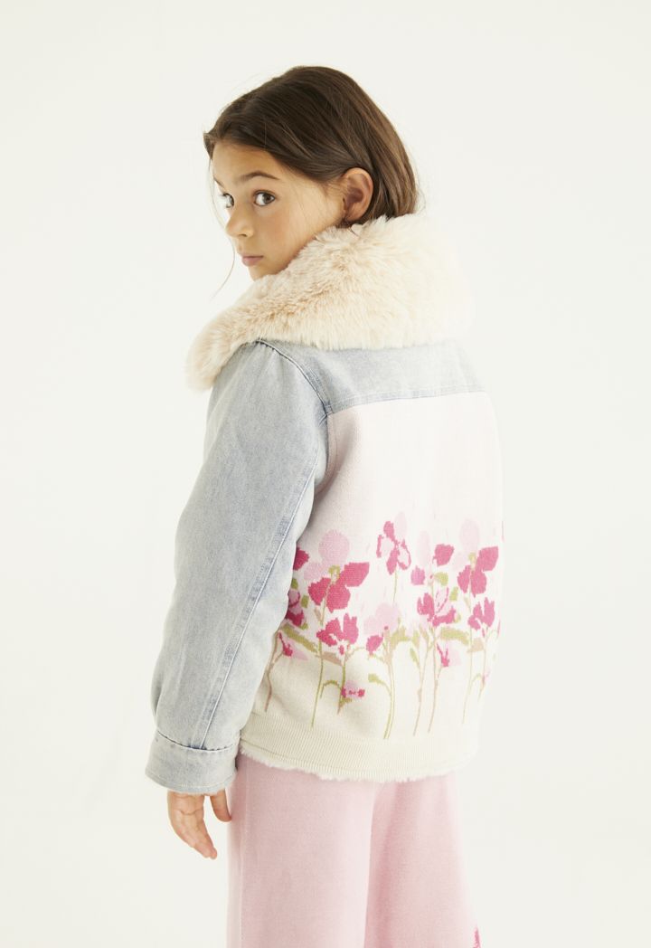 a unique denim jacket that features a faux fur embellished and quilted design.