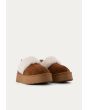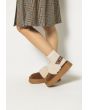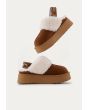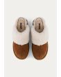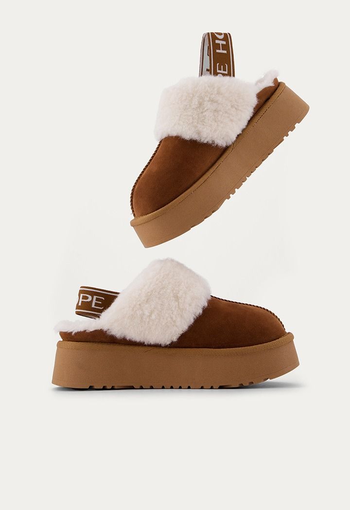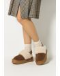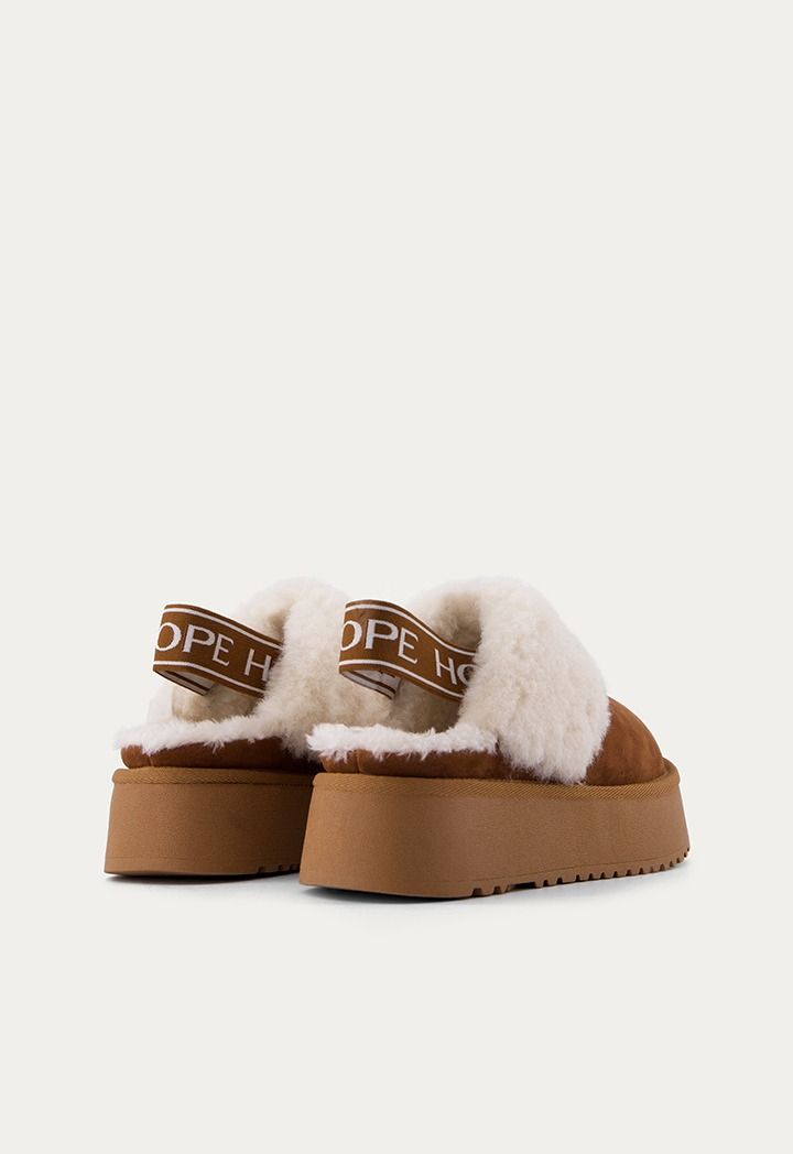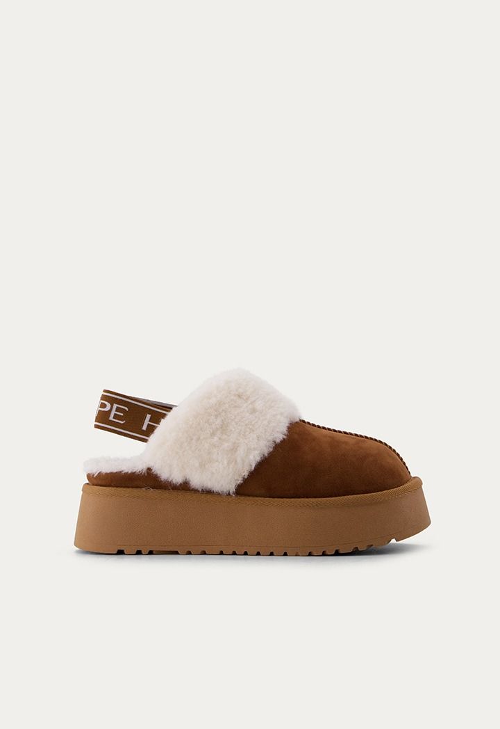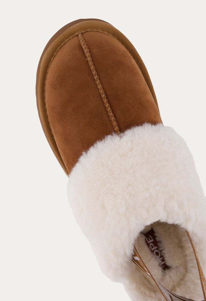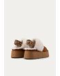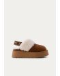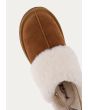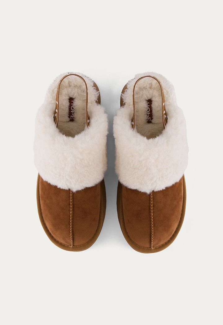 A pair of comfortable Faux Fur Embellished Suede Slippers with an Elastic Monogram Ankle Strap.