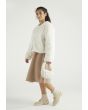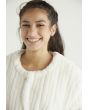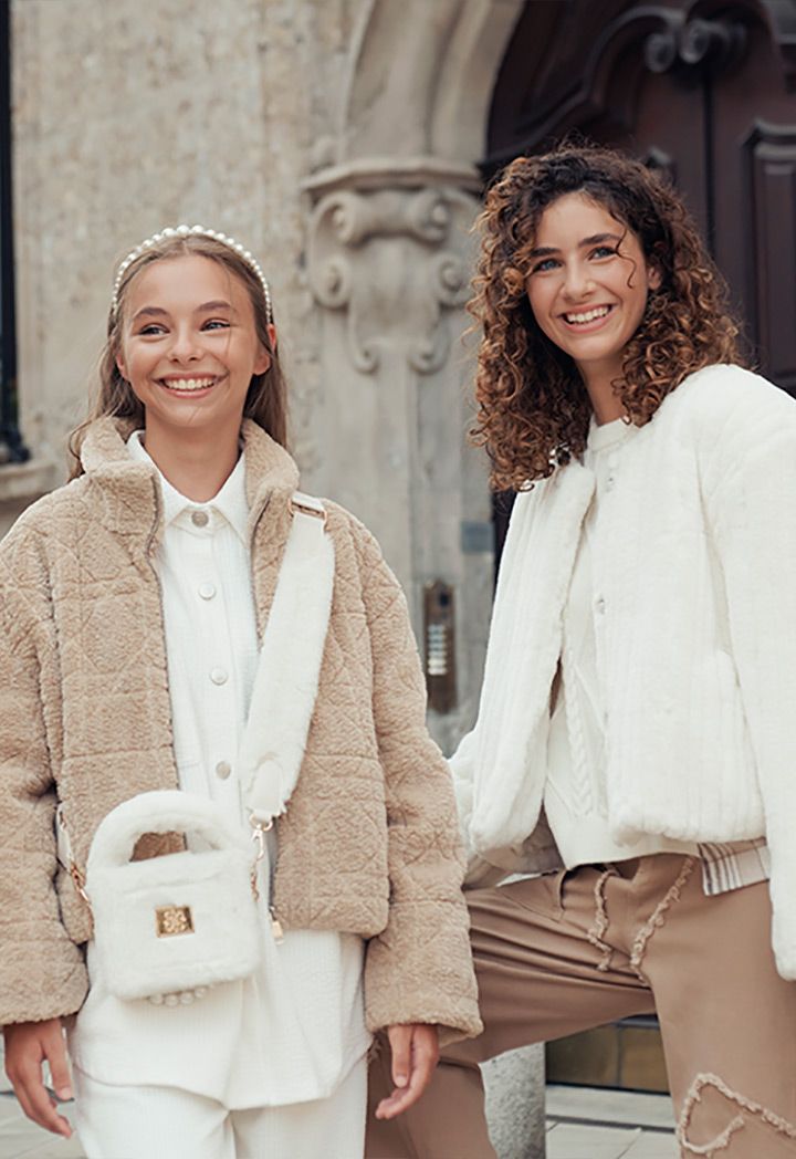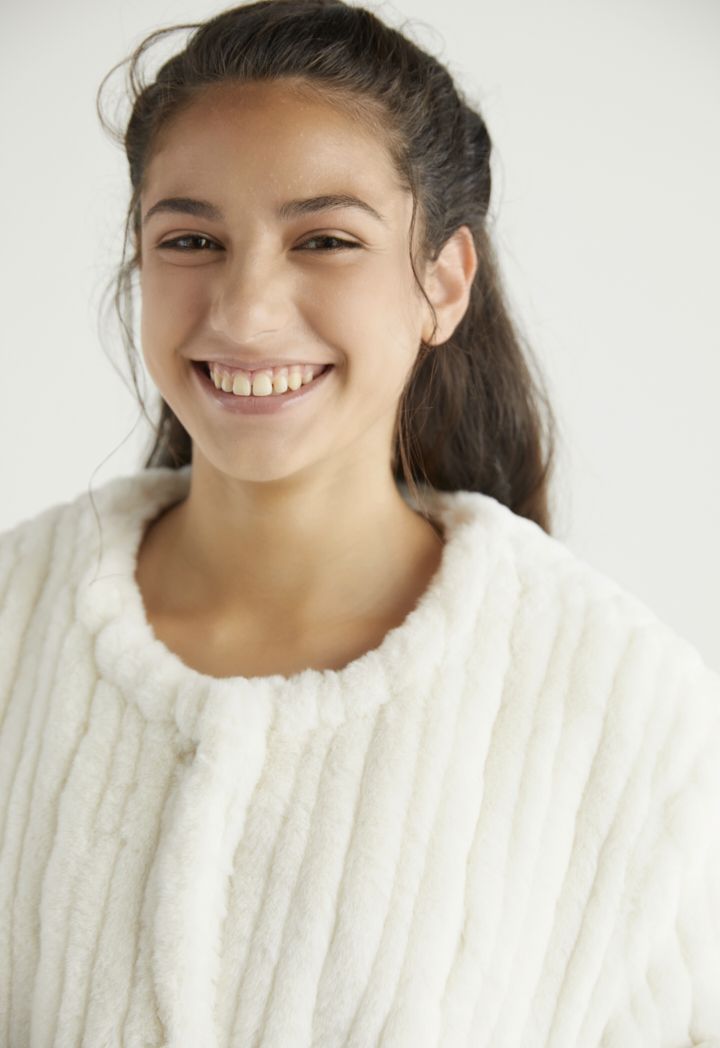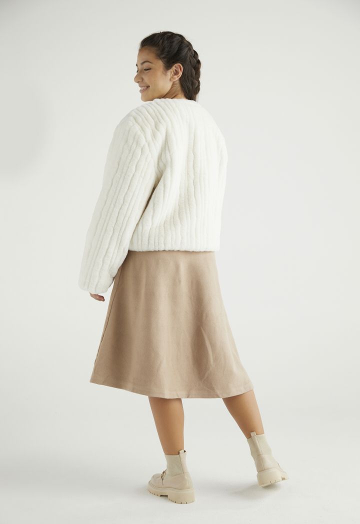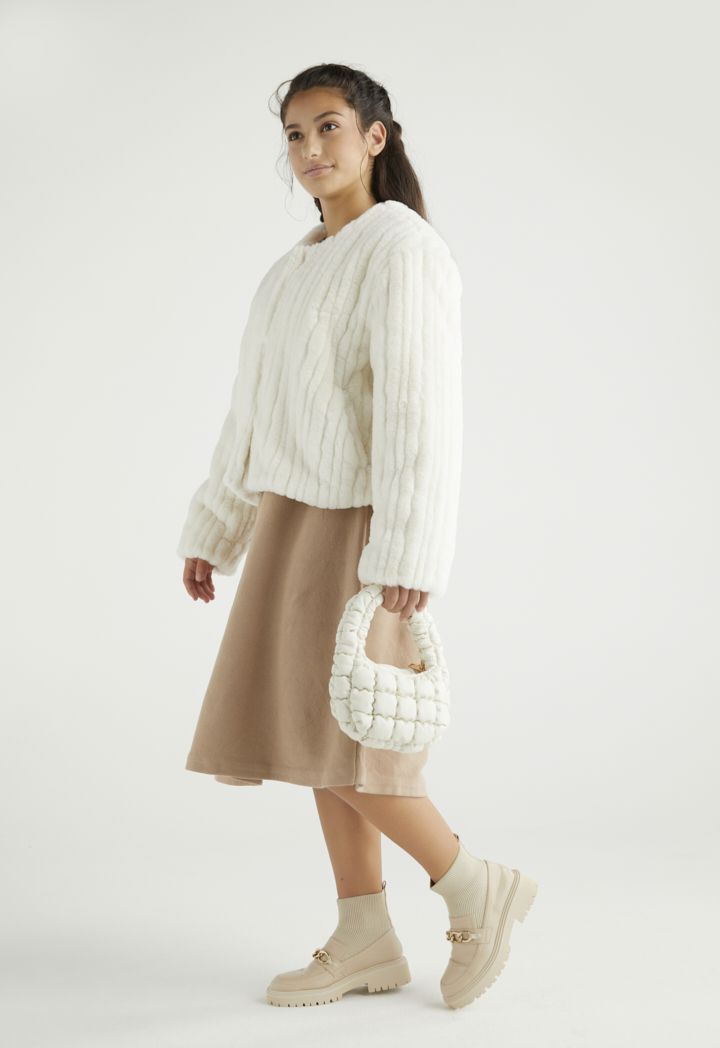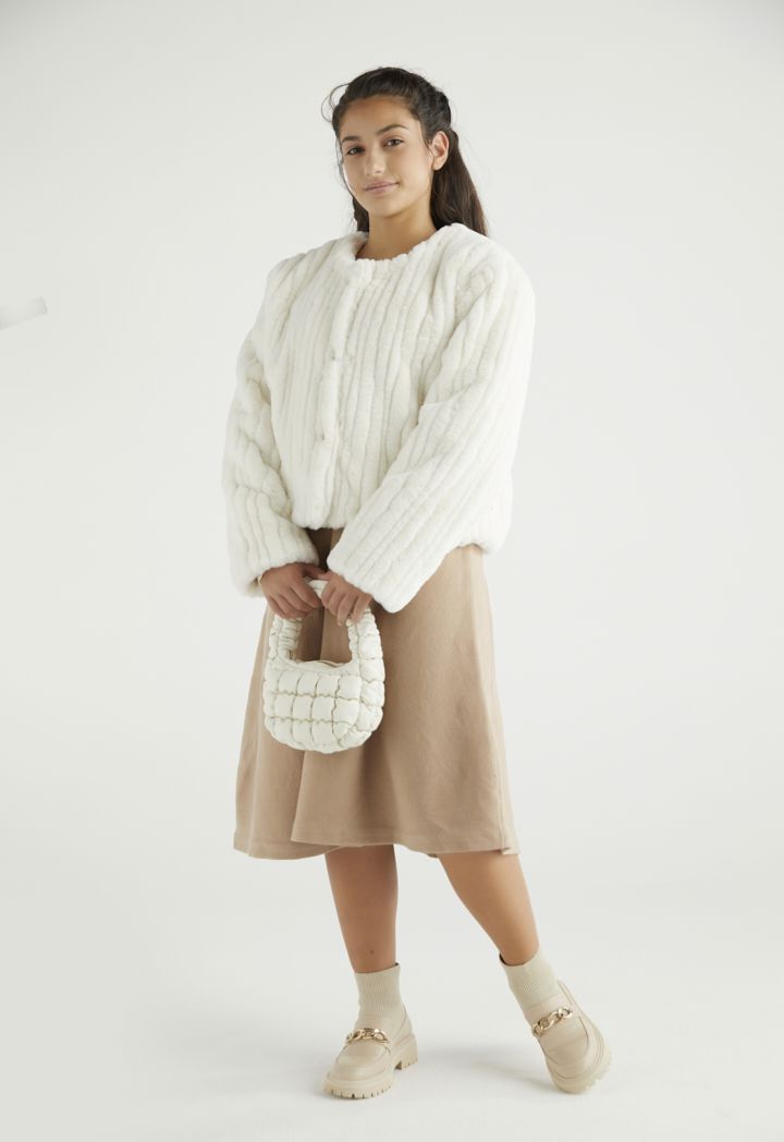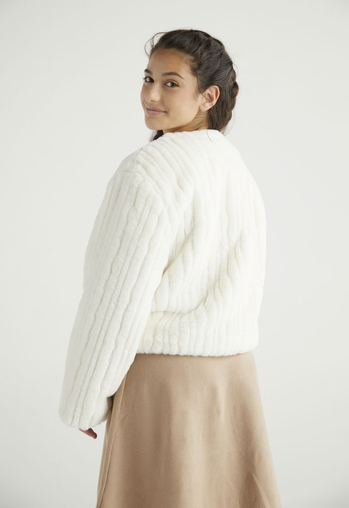 A luxurious jacket that features a puff faux fur design and front buttons.