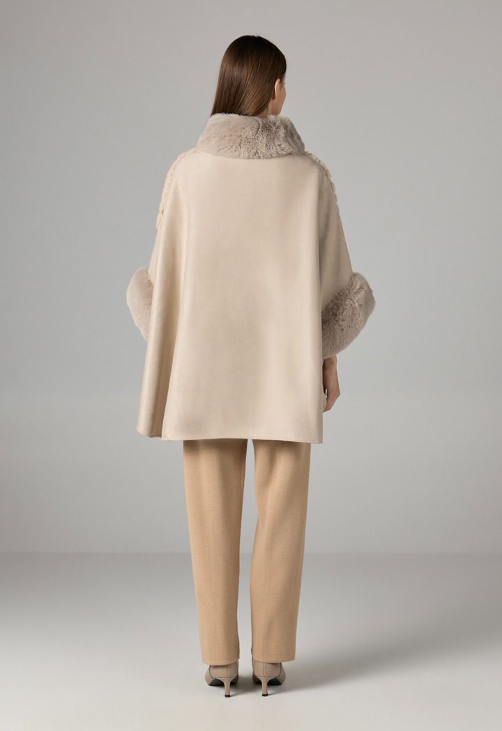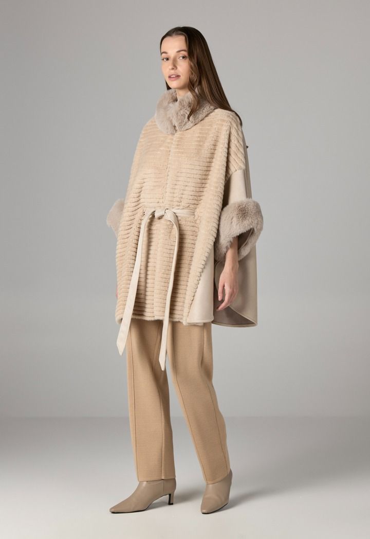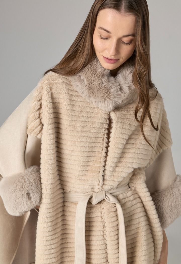 Unique poncho combining suede and faux fur for an elegant and prestigious look.