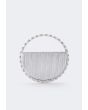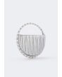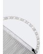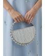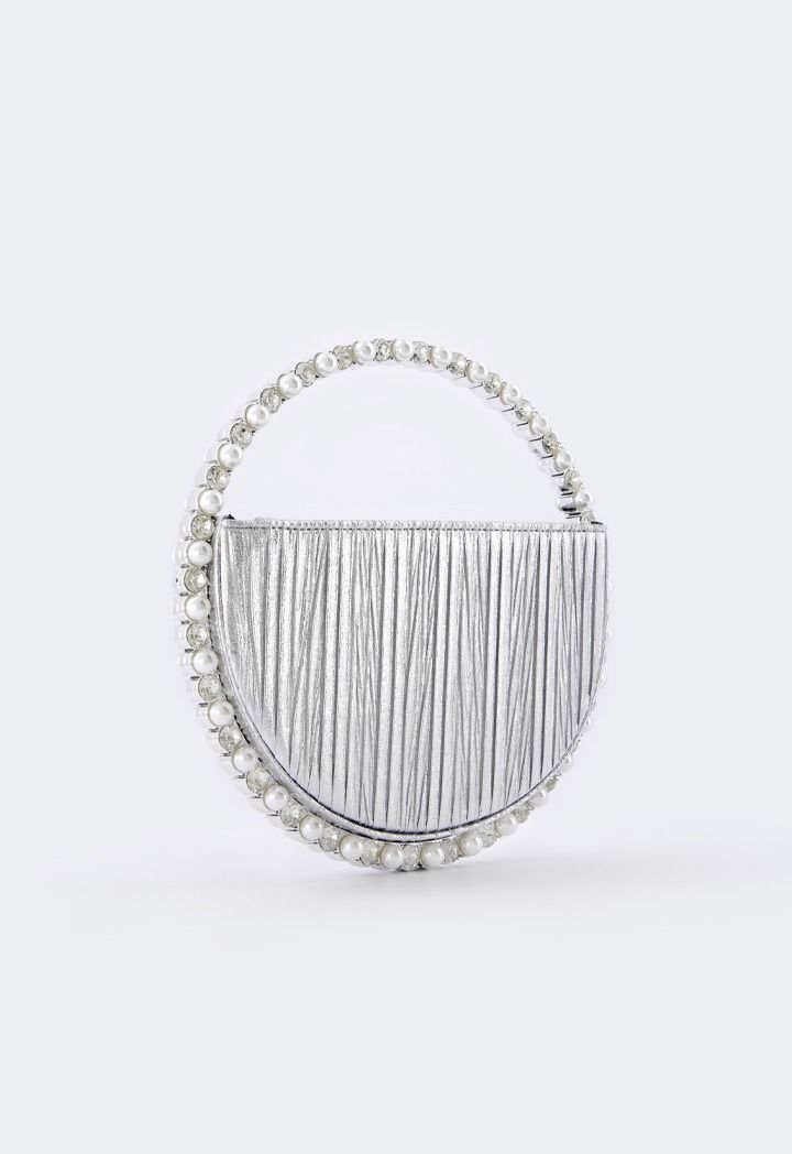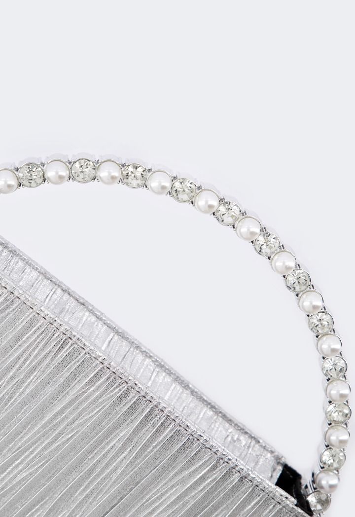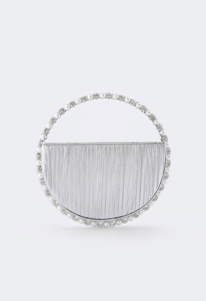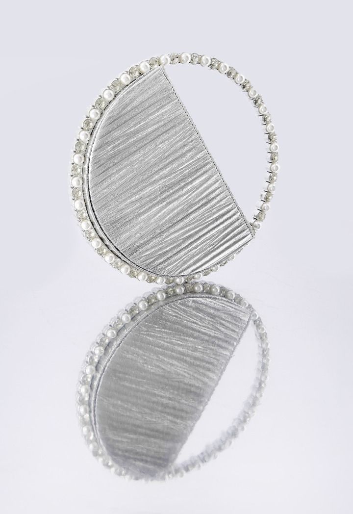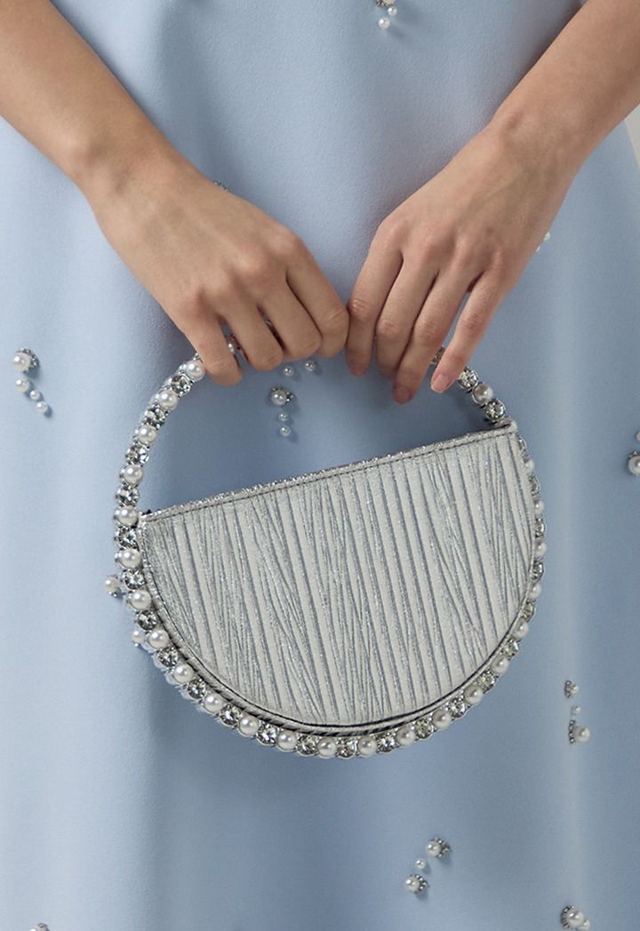 This half moon hand bag is sure to steal the lights of anywhere and everywhere that you go, with its crystal and faux pearls embellished all around handle and textured PU Leather.