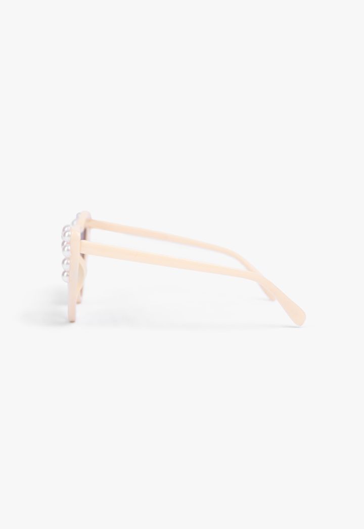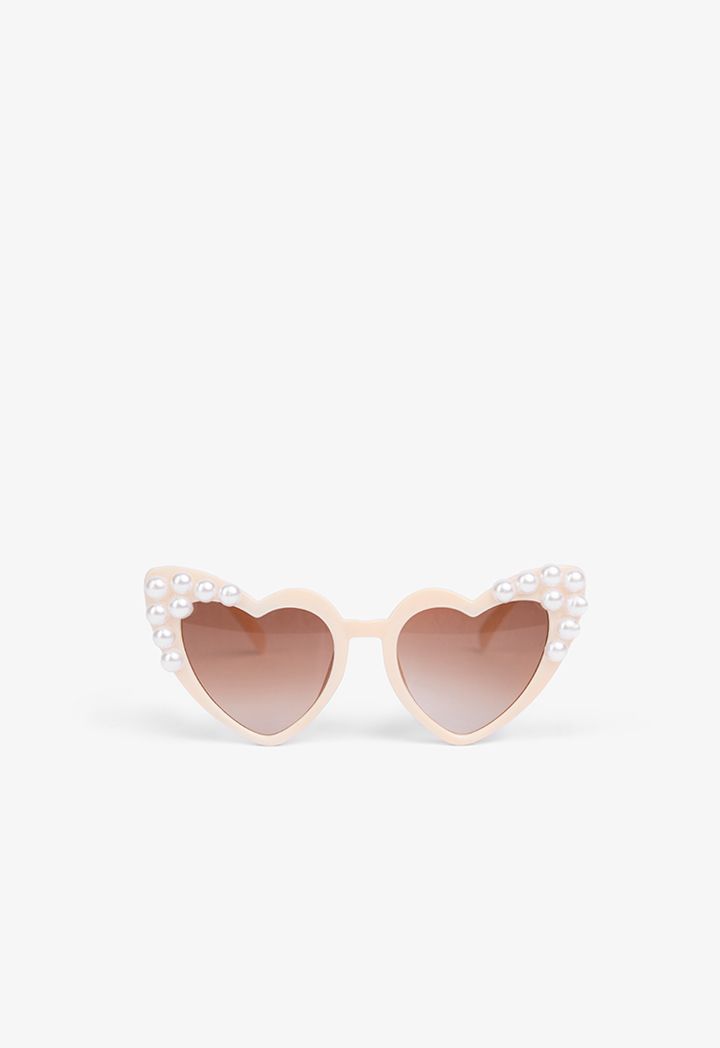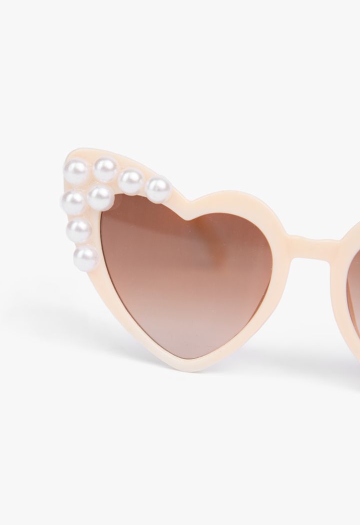 A unique pair of sun glasses for the unique girls, featuring a cute design of heart shapes frames with faux pearls embellishment for an extra touch.