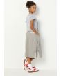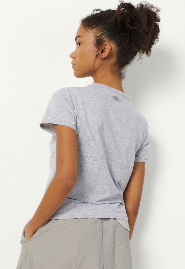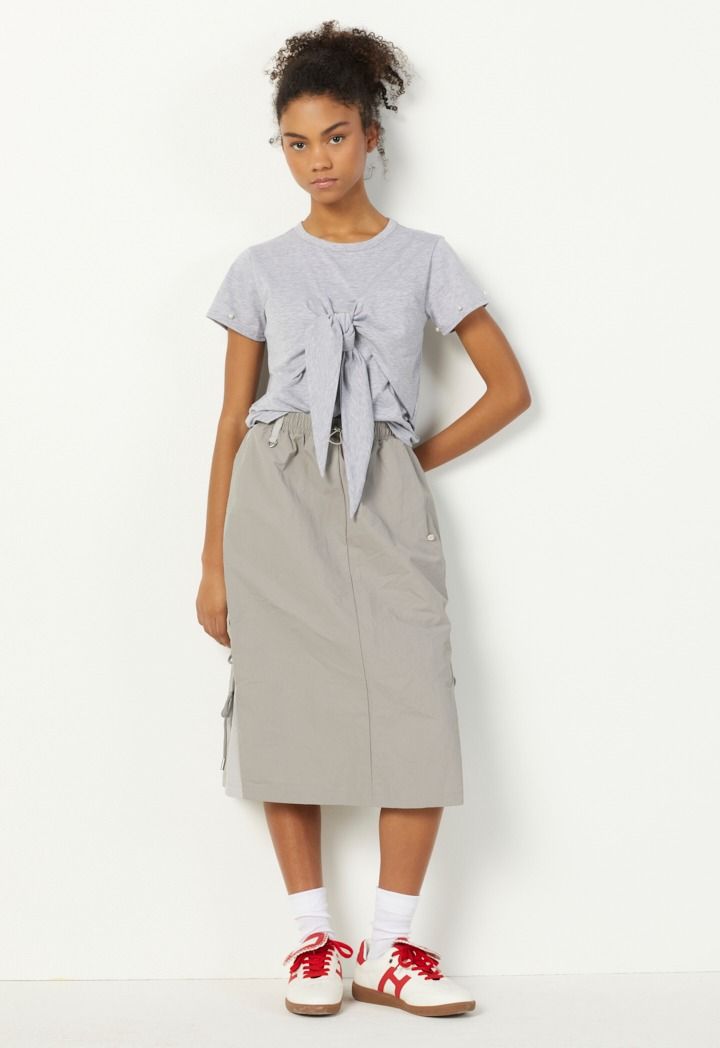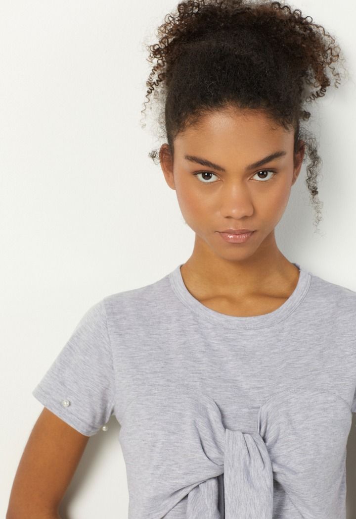 Add a touch of elegance with a plain t-shirt adorned with artificial pearls and a stylish knot at the waist, blending simplicity and charm