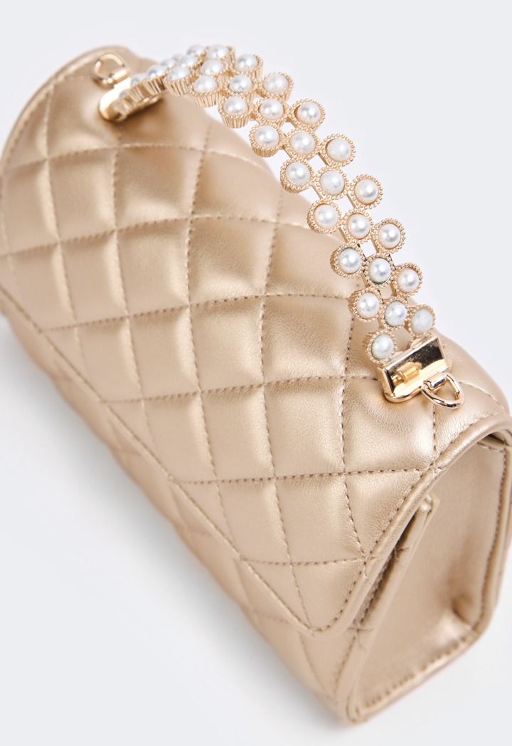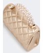 A luxurious handbag that features a faux pearl handle and a quilted design.