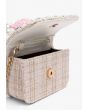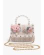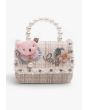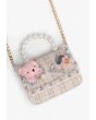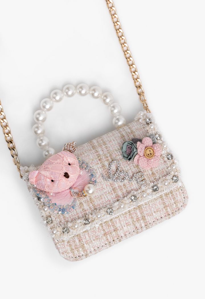 A crossbody bag that features a crystal and faux pearls embellished tweed design and a shoulder chain.