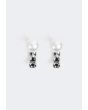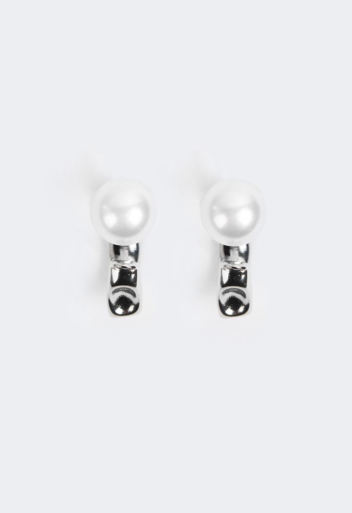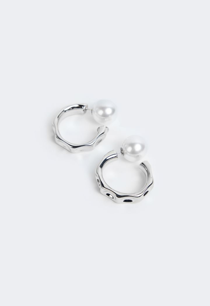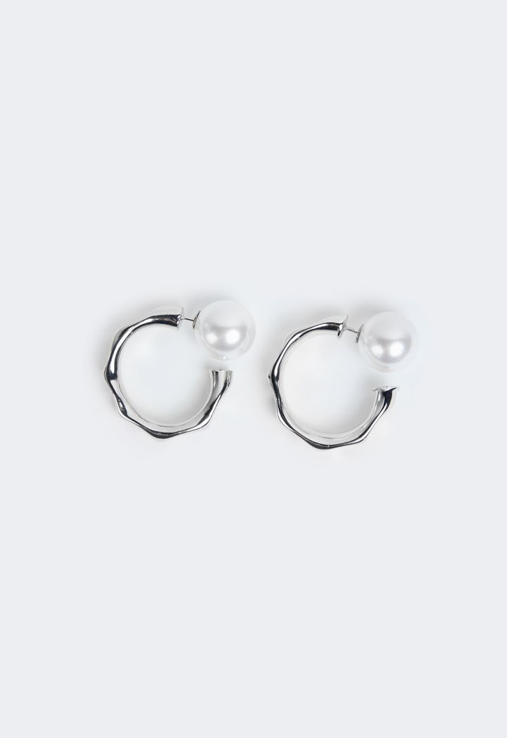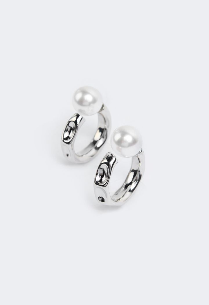 This pair of earrings carries the classic faux pearls design with a modern hoop look.