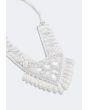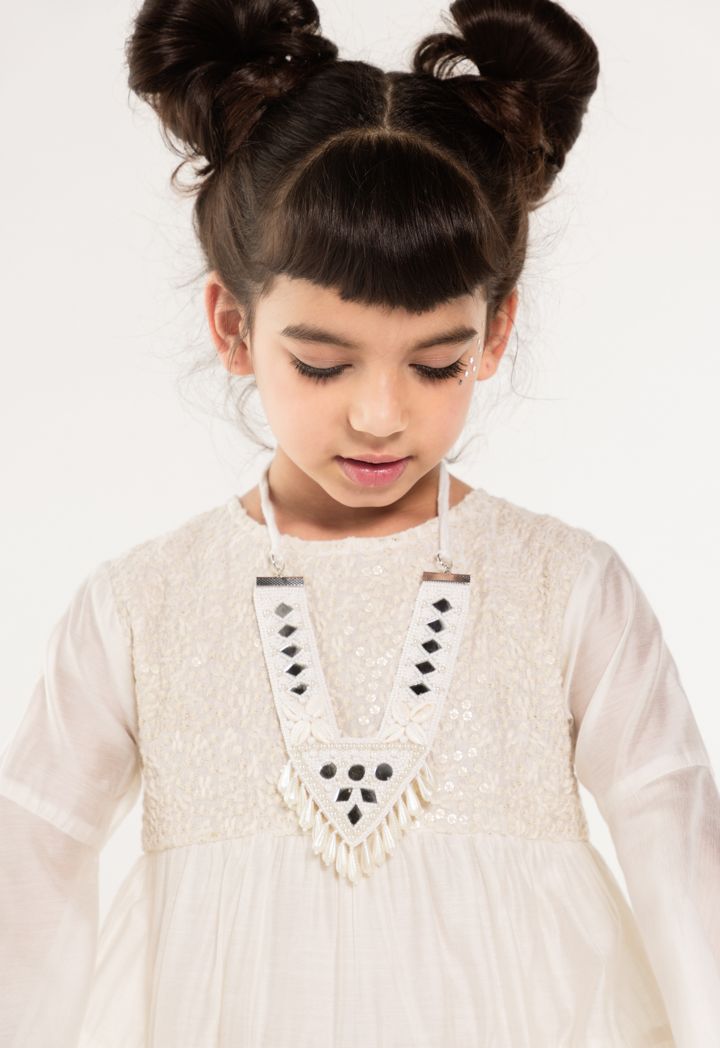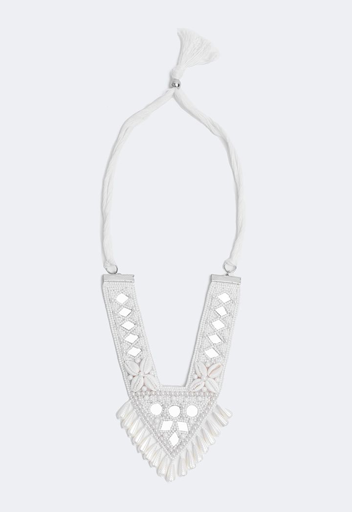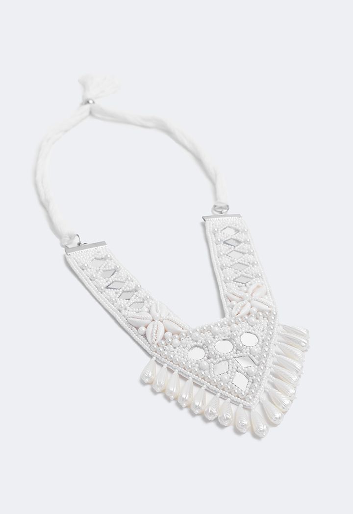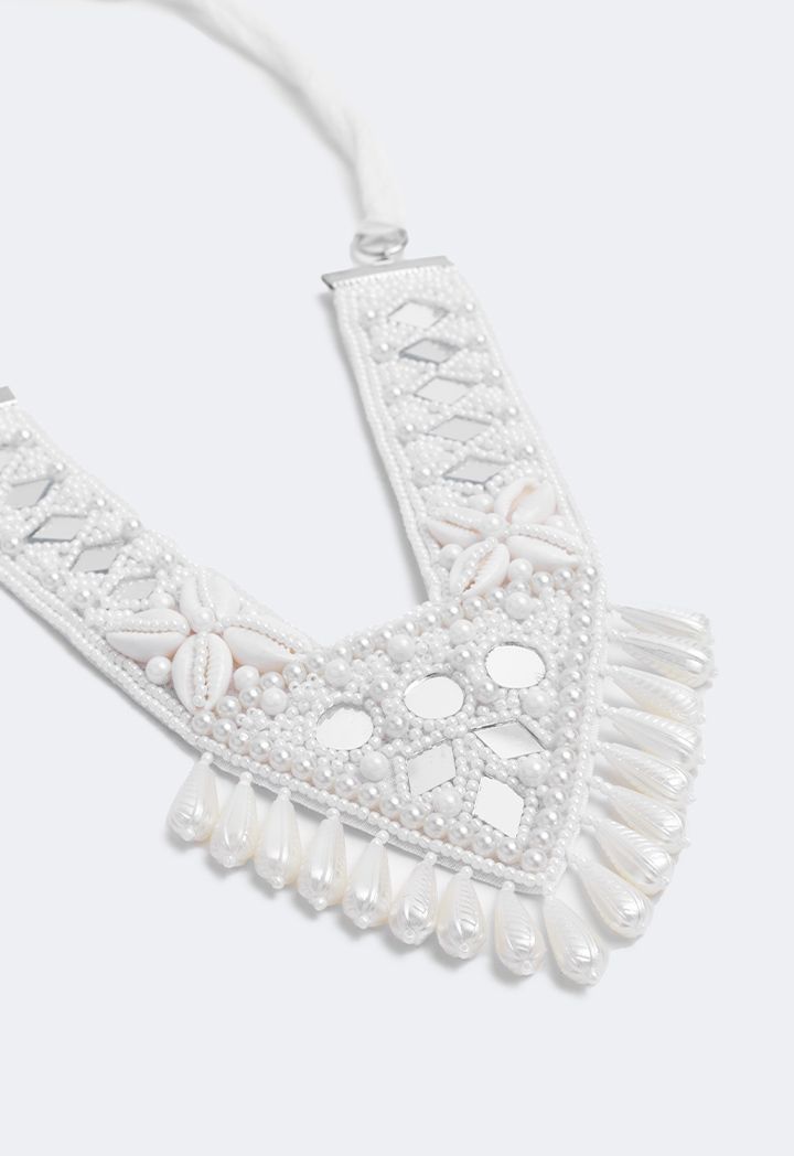 An ivory necklace that combines the details of the various sizes of faux pearls with a final touch of the seashells.