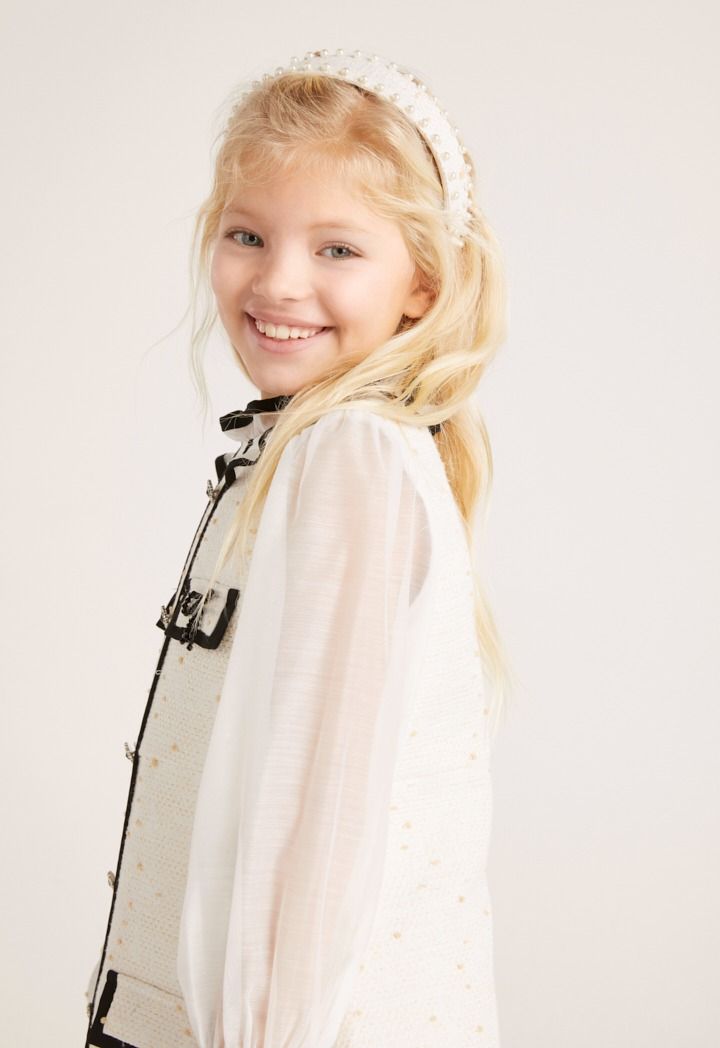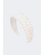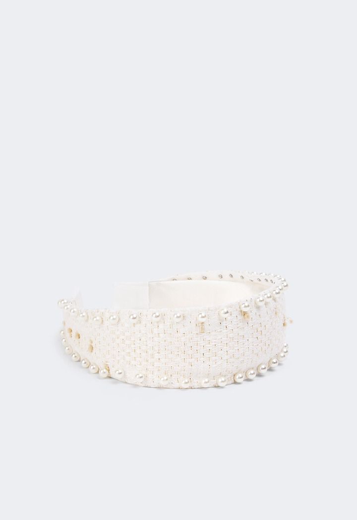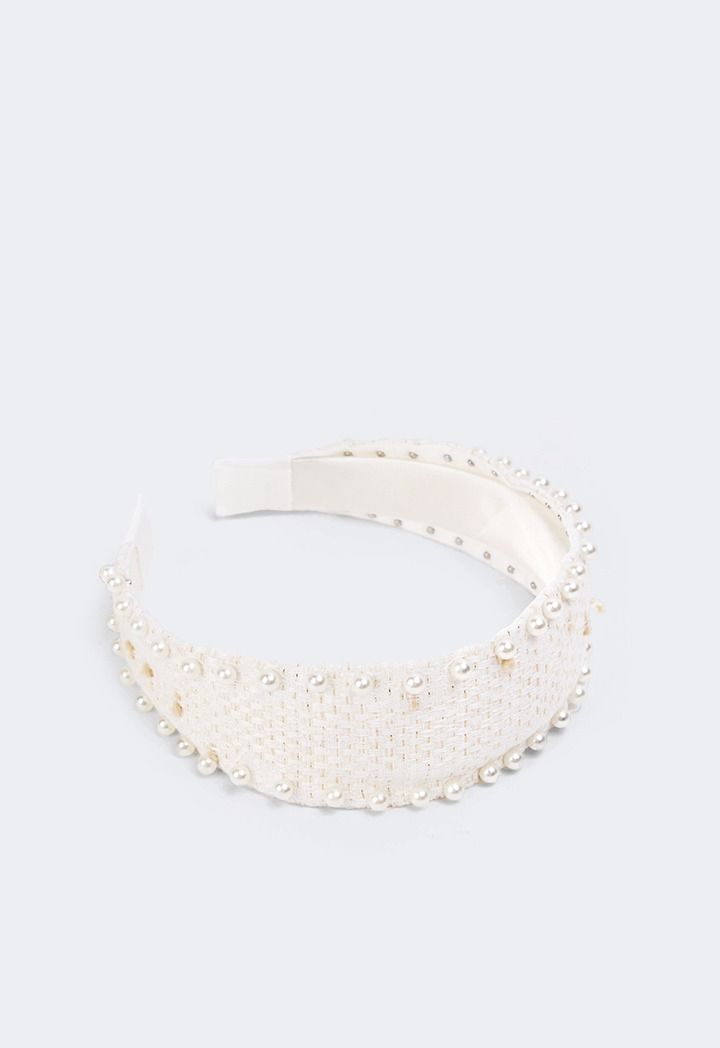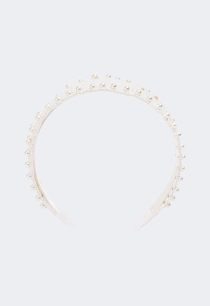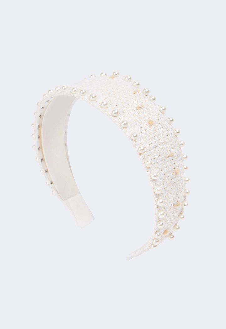 Shine bright with this mixed pearls and rhinestones headband with a final touch of a tweed band.