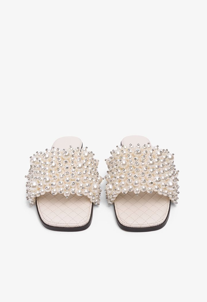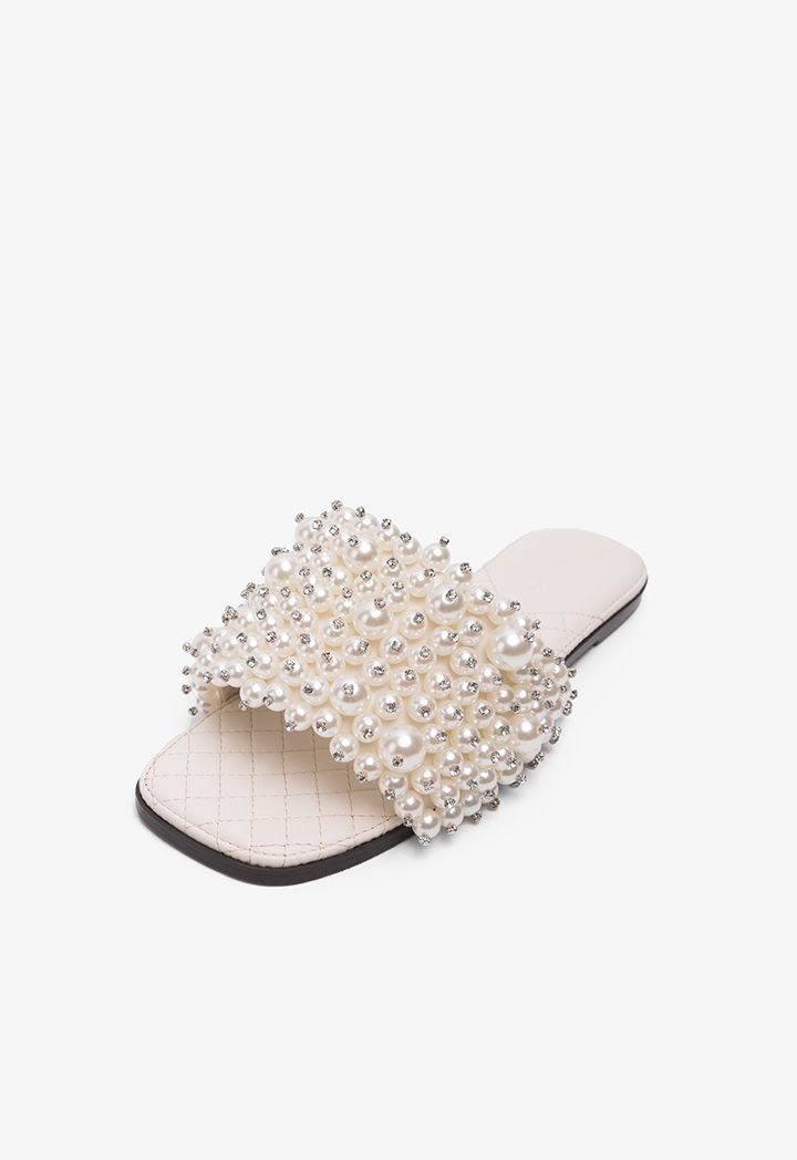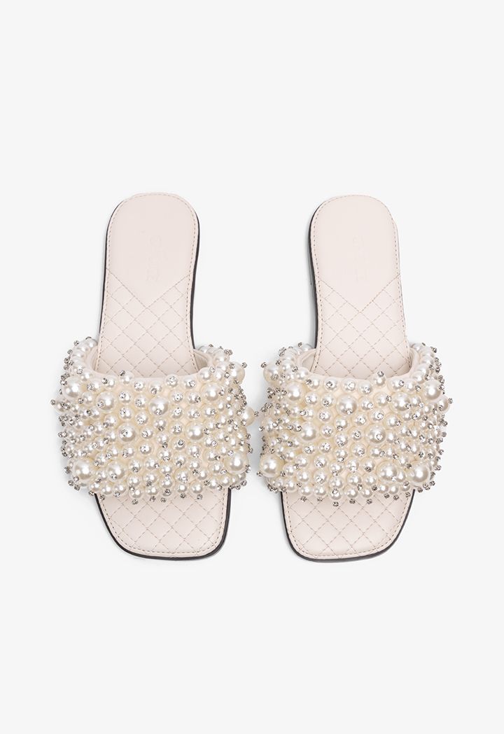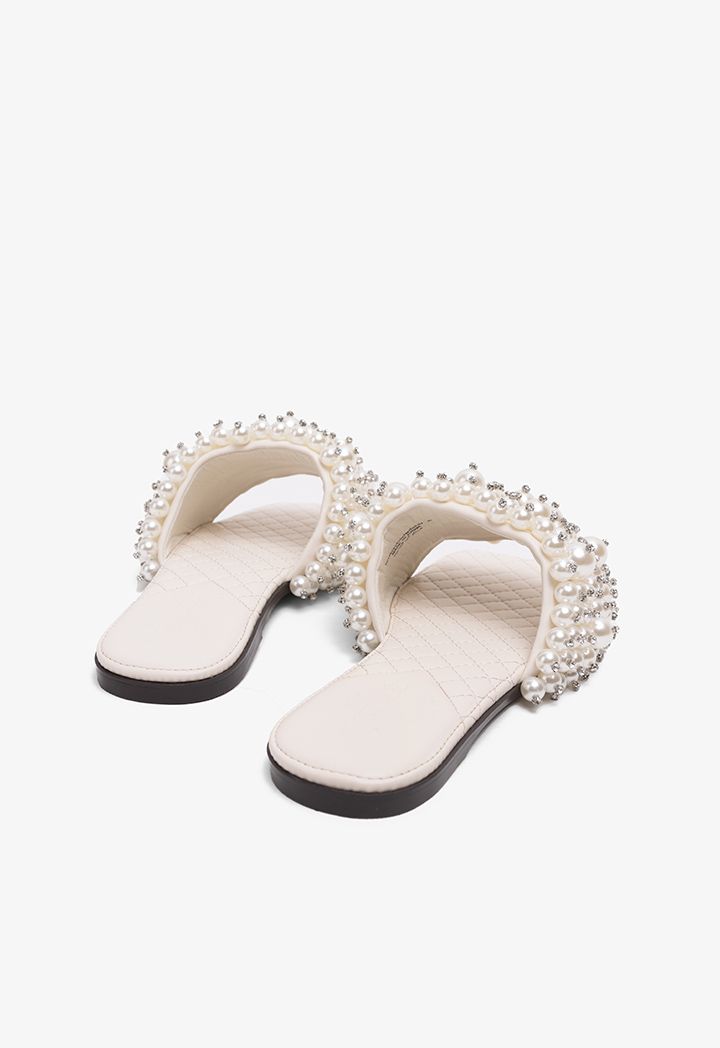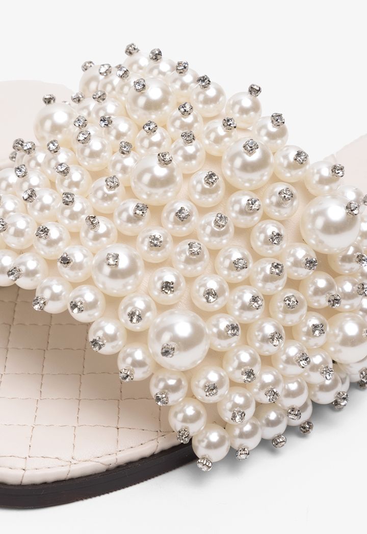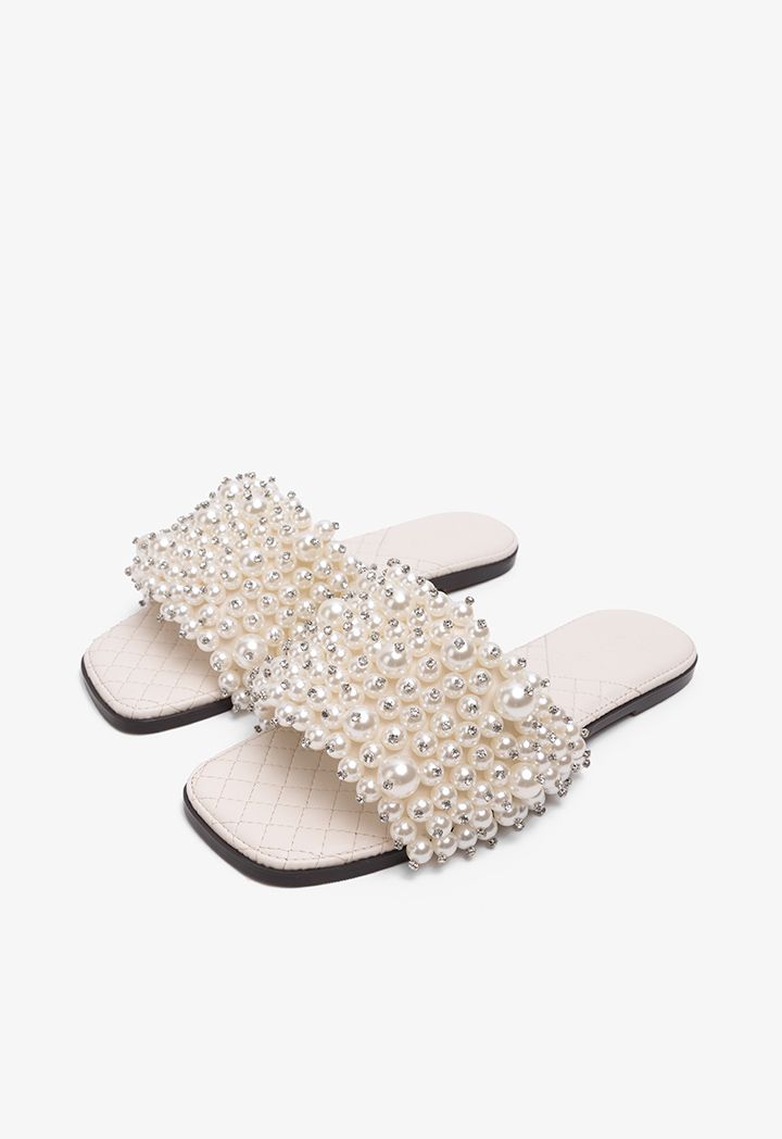 Faux Pearls Wide Strap Flats |