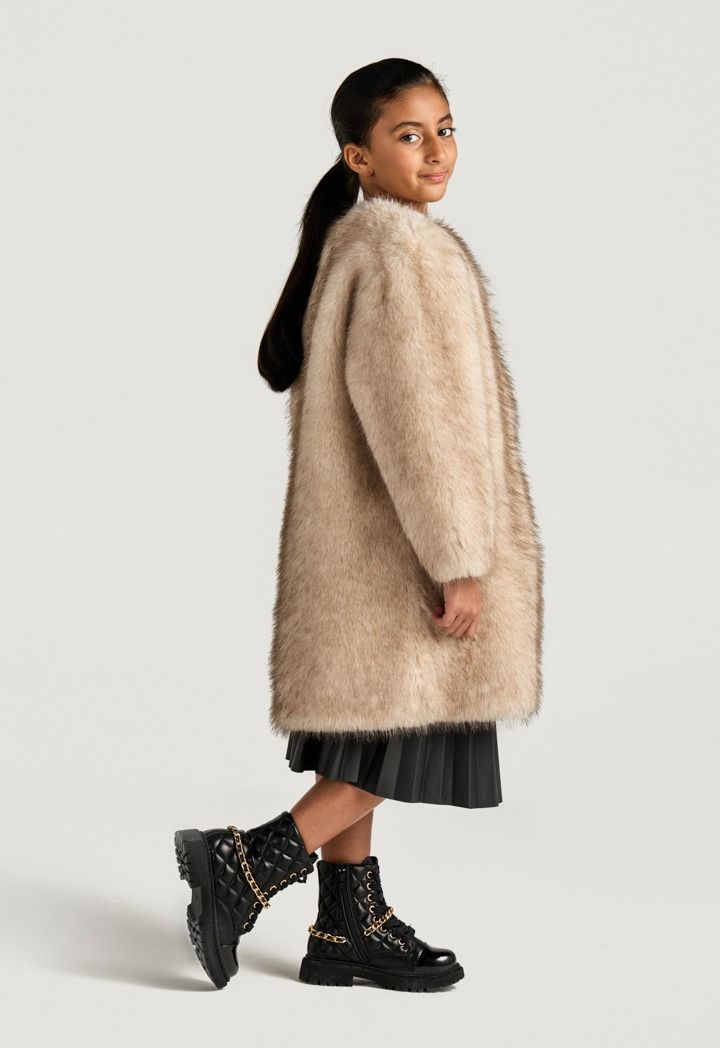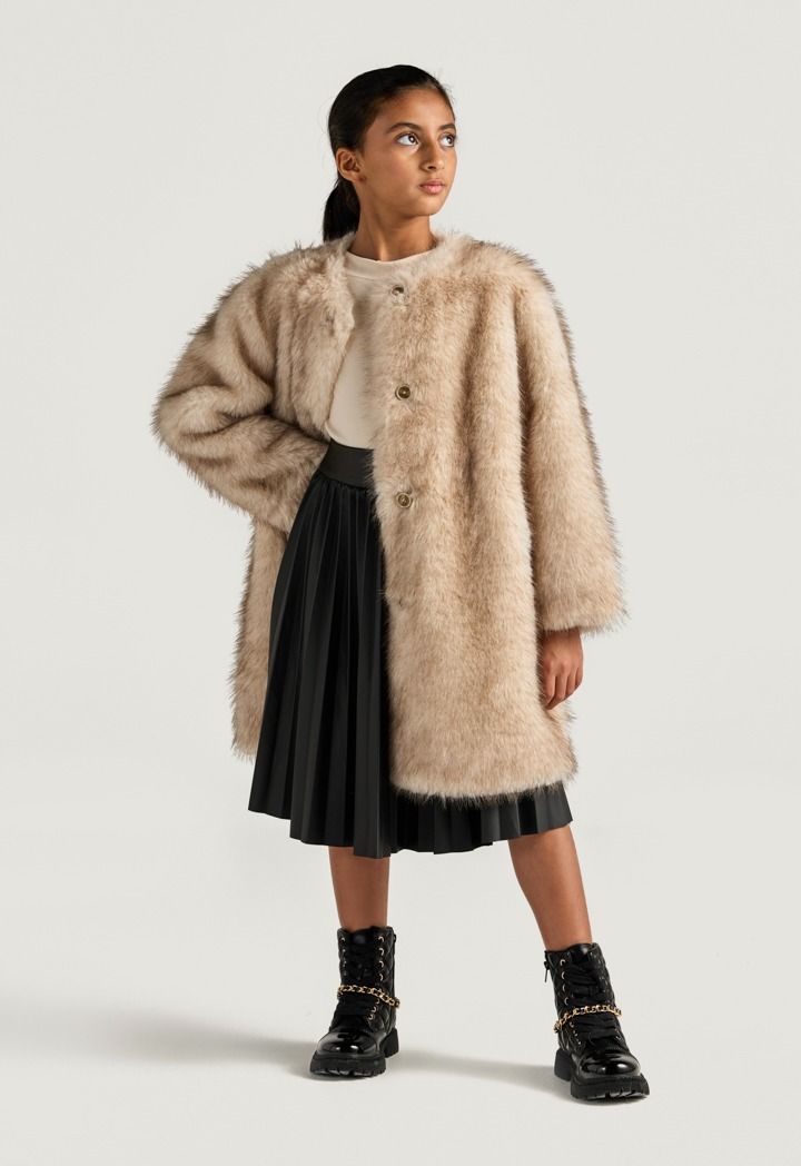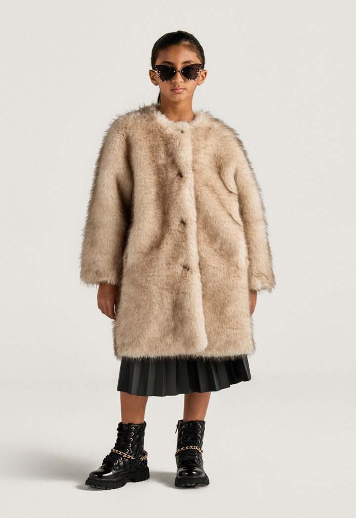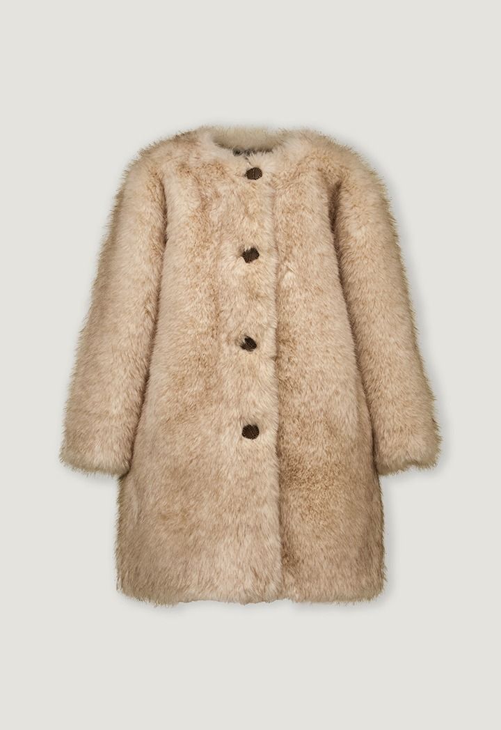A unique coat that features a solid faux rabbit hair design and front buttons.