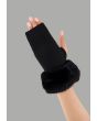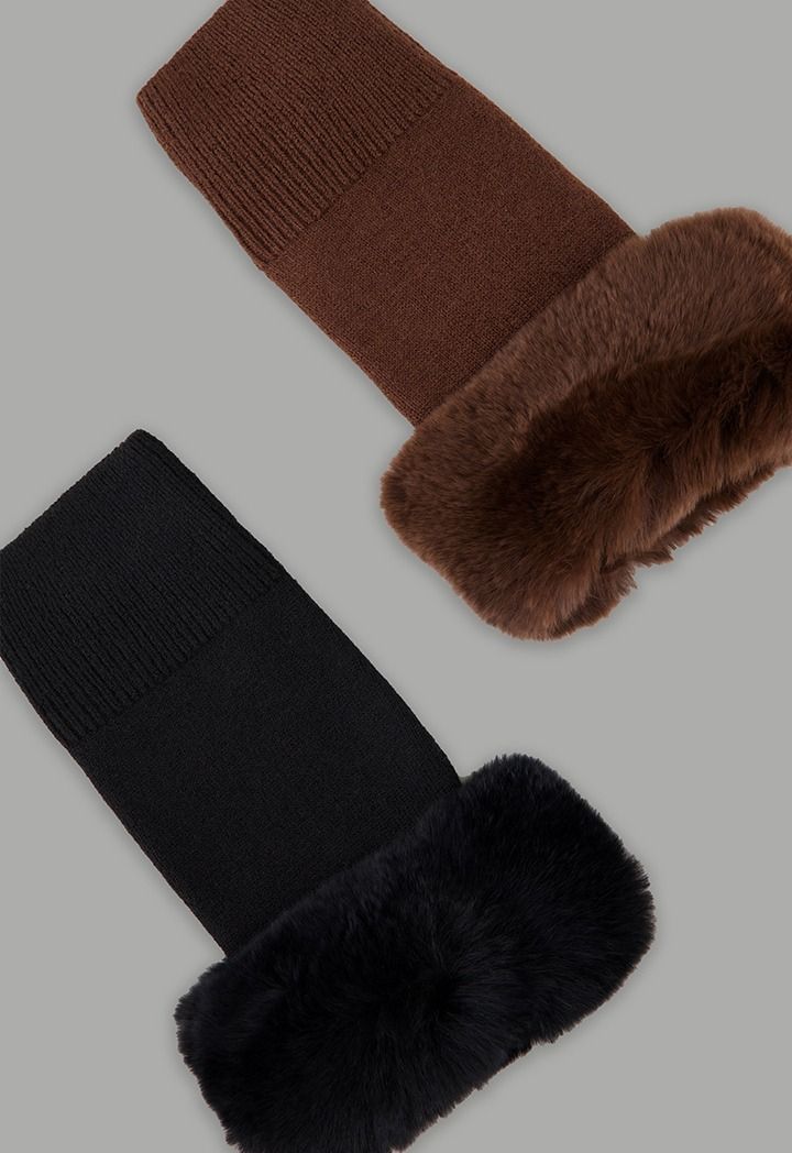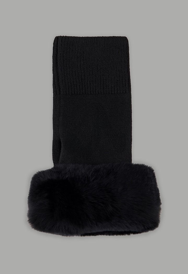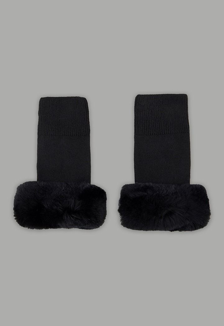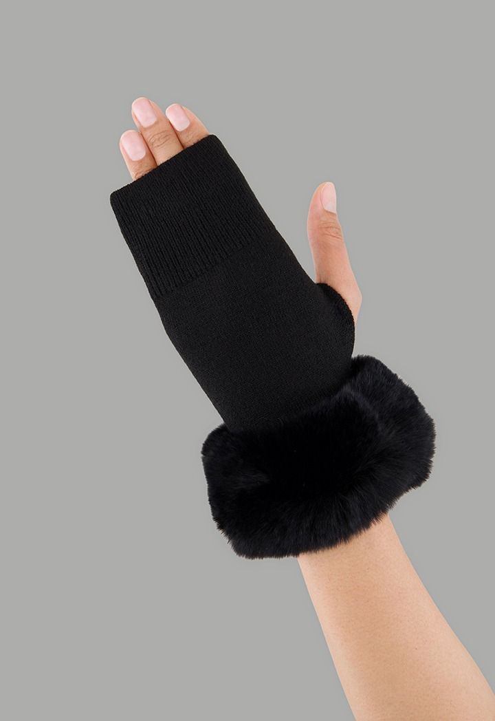 A pair of fingerless knitted faux fur embellished gloves that will keep you warm.