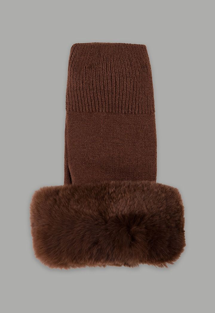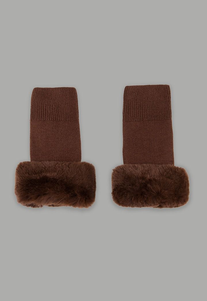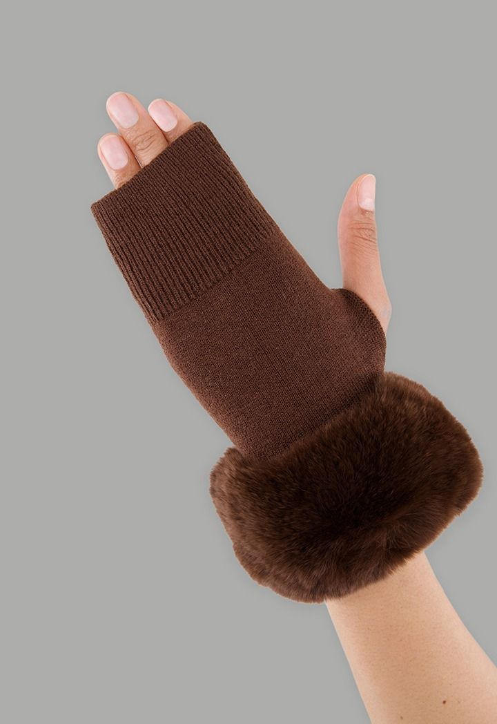 A pair of fingerless knitted faux fur embellished gloves that will keep you warm.