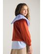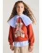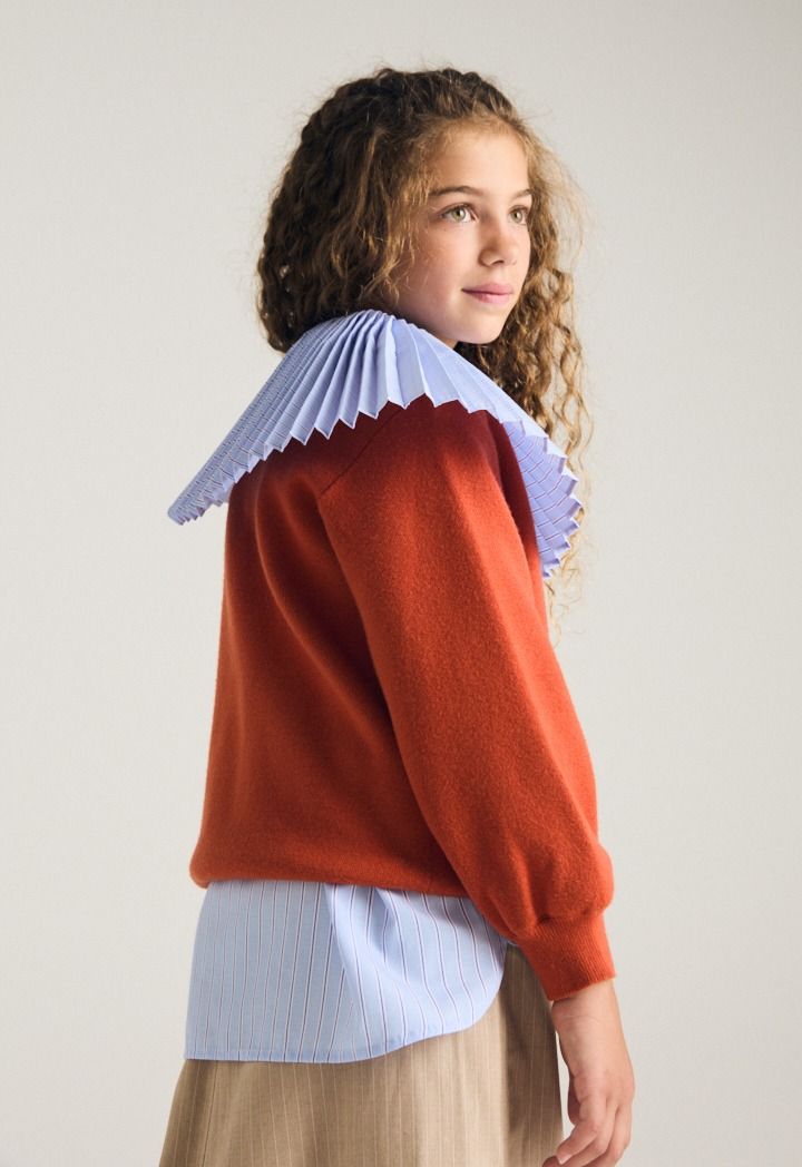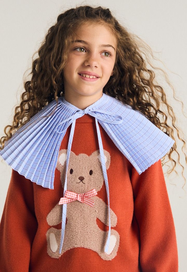 A knitted sweater that features a cute fleece bear embellished design.