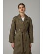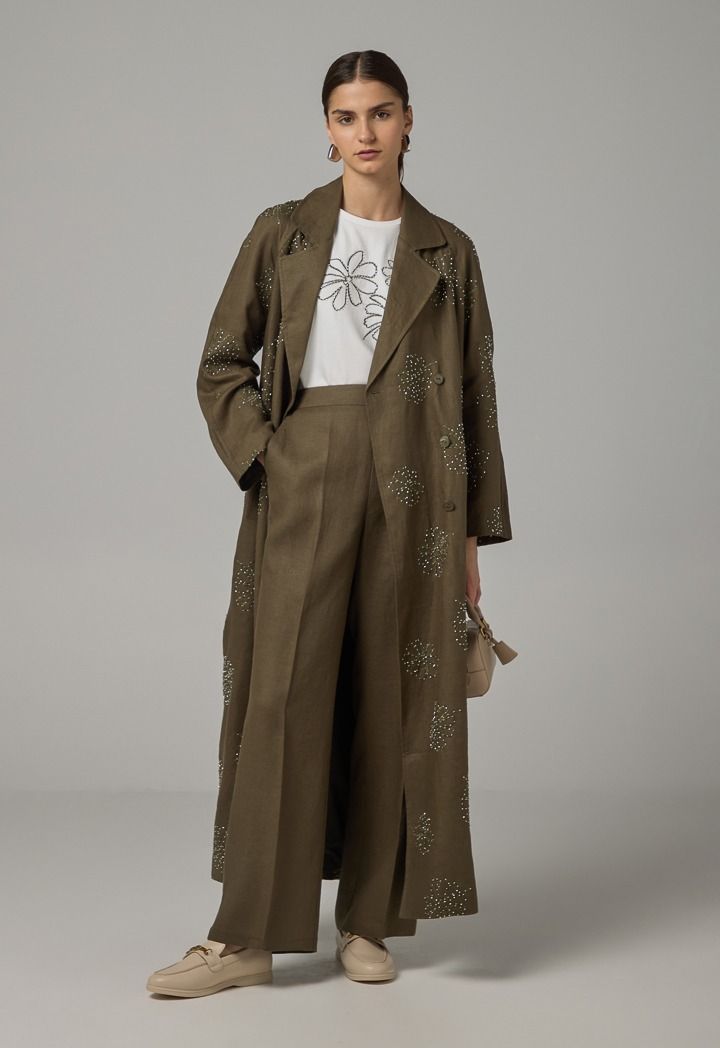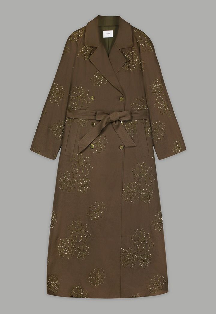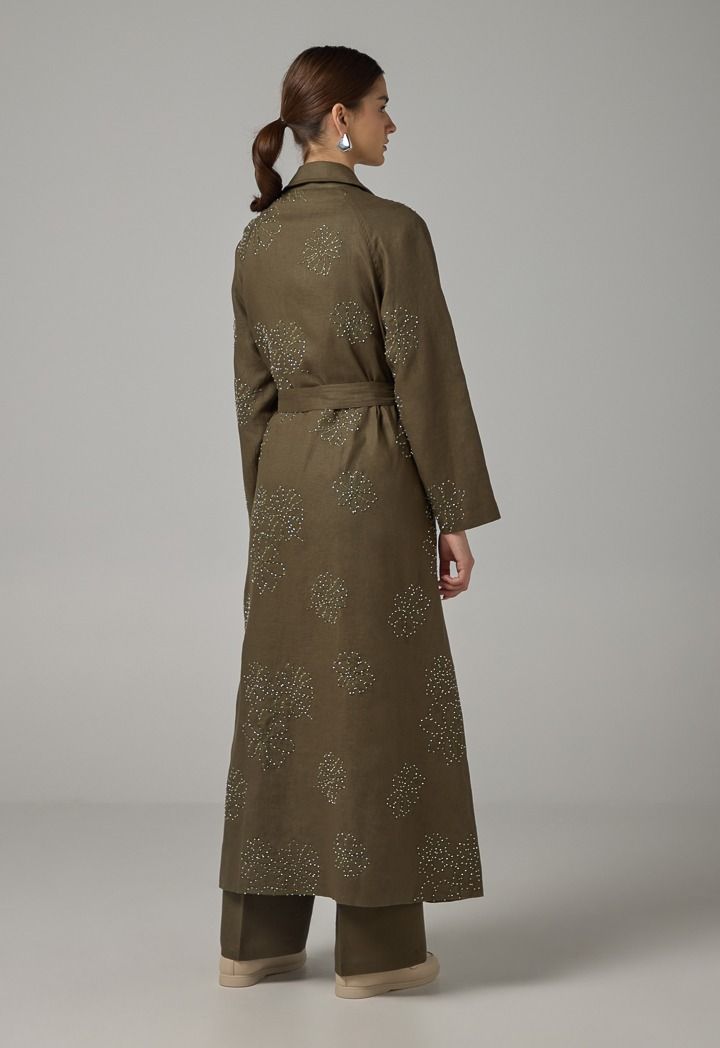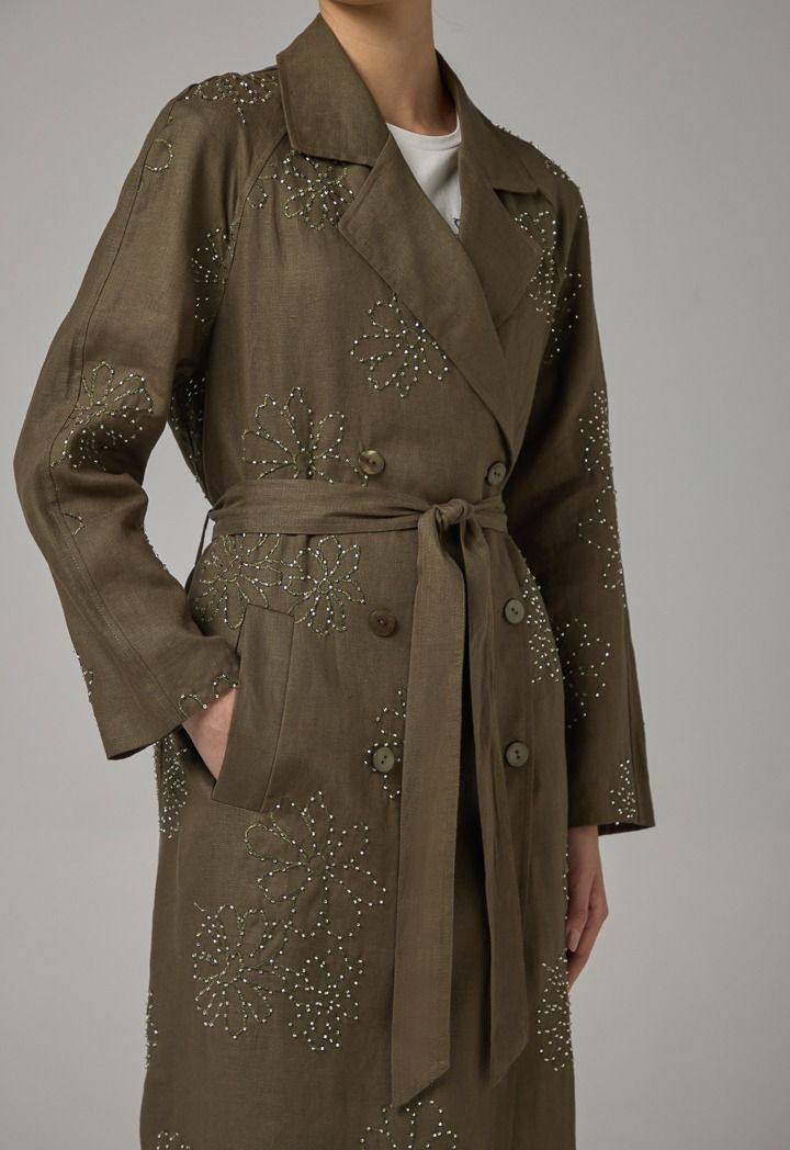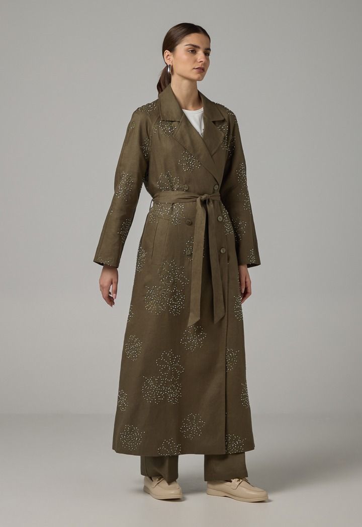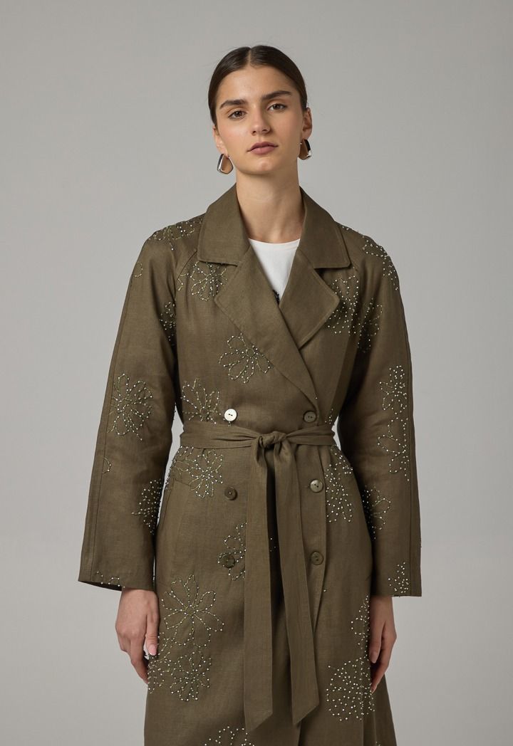 Design: Solid, Floral Embroidered, Attached Lining, Beads Embellished, Belt, Pockets, Double Breasted