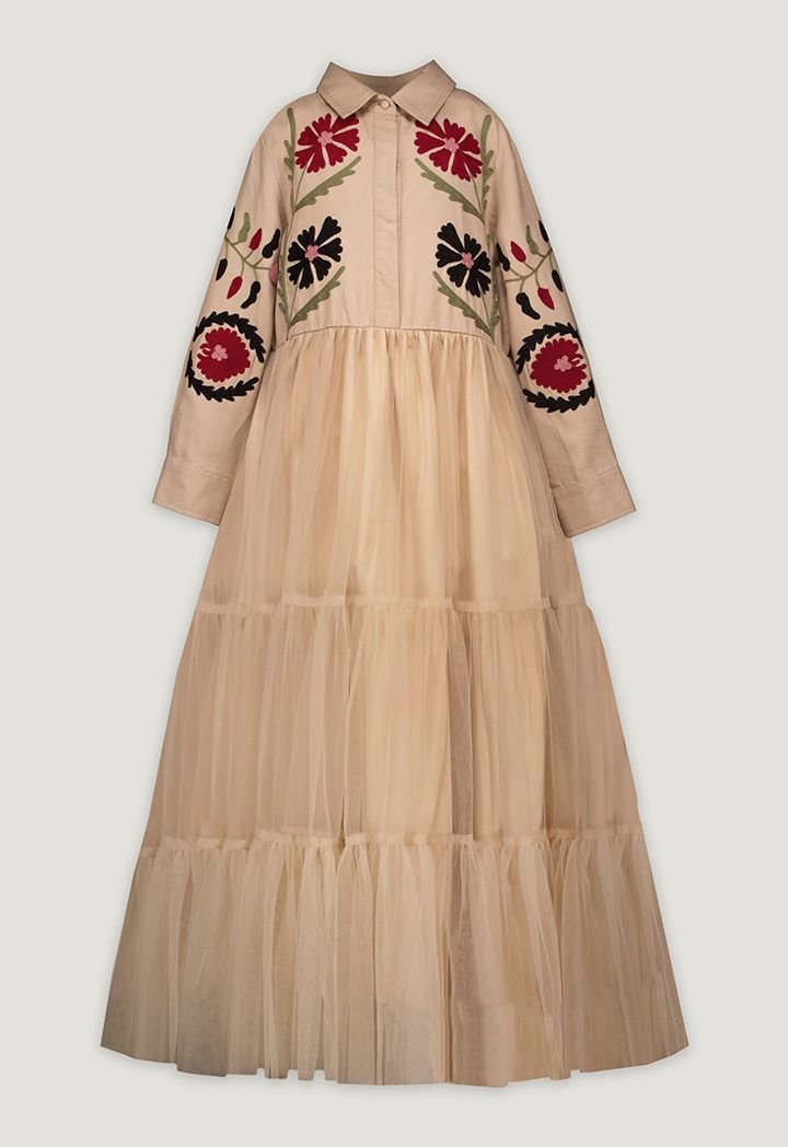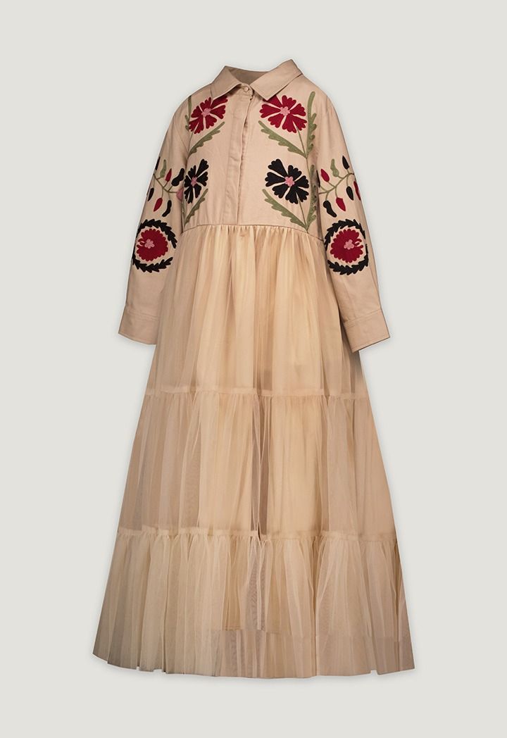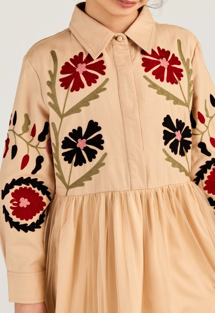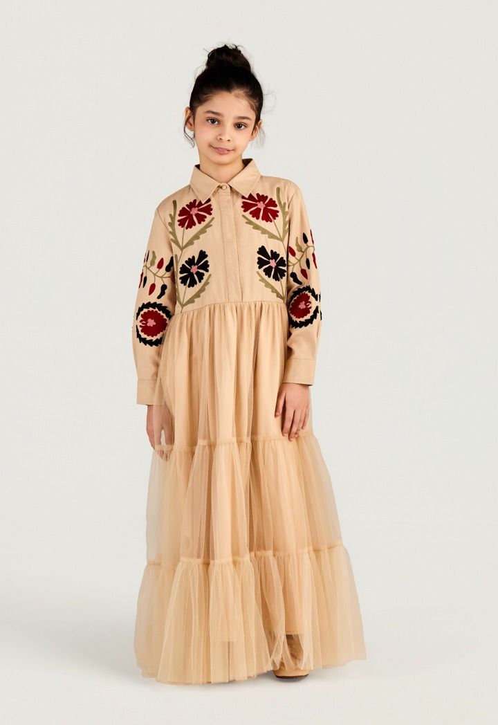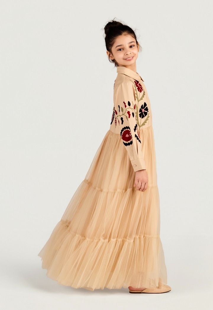 Delicate embroidery blooms over tulle layers-enchanting whimsy for your little girl festive evenings and joyful gatherings.