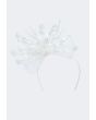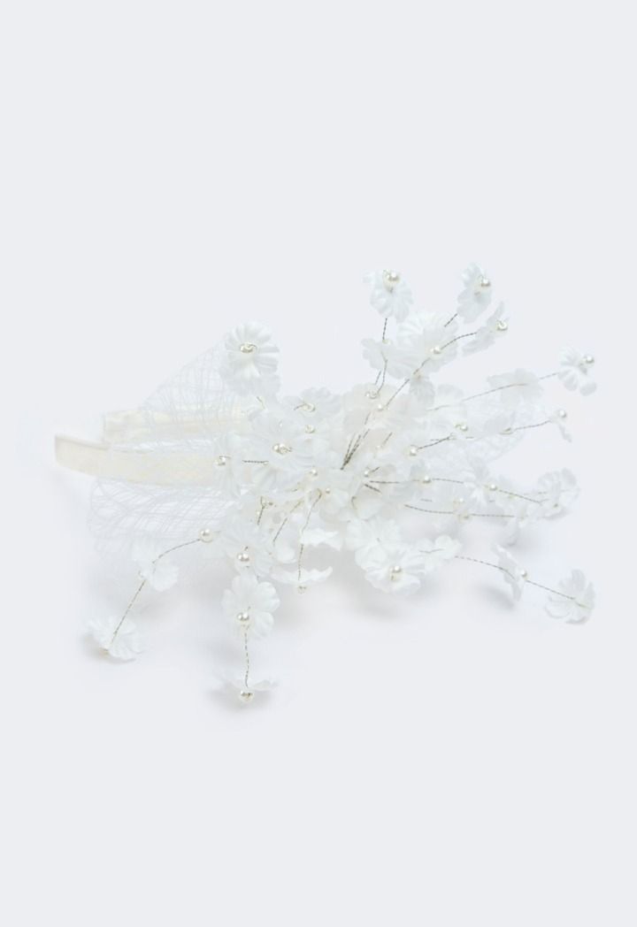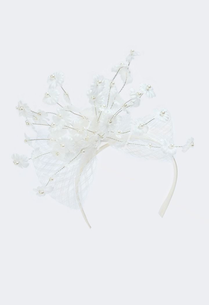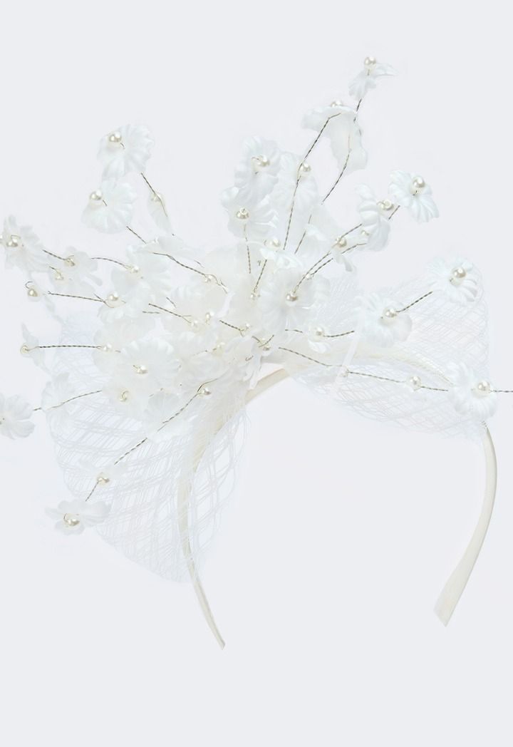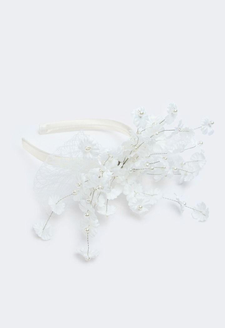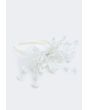 A true and unique design with a headband covered completely with flower petals displaying a true image of the spring look.