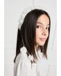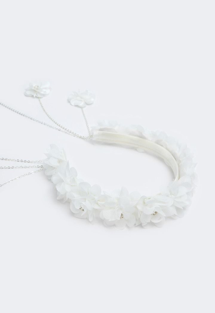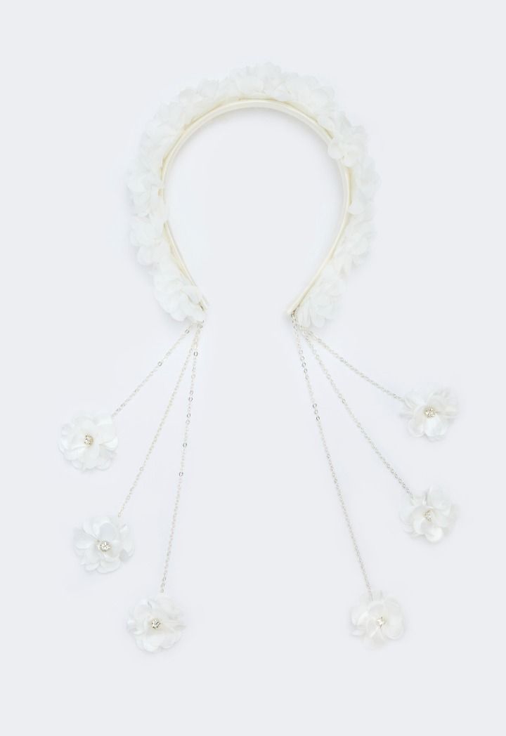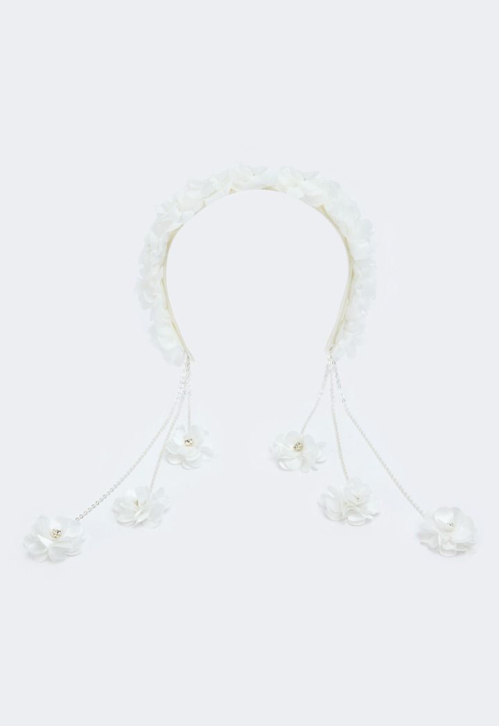 A true and unique design with a headband covered completely with flower petals displaying a true image of the spring look.