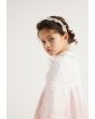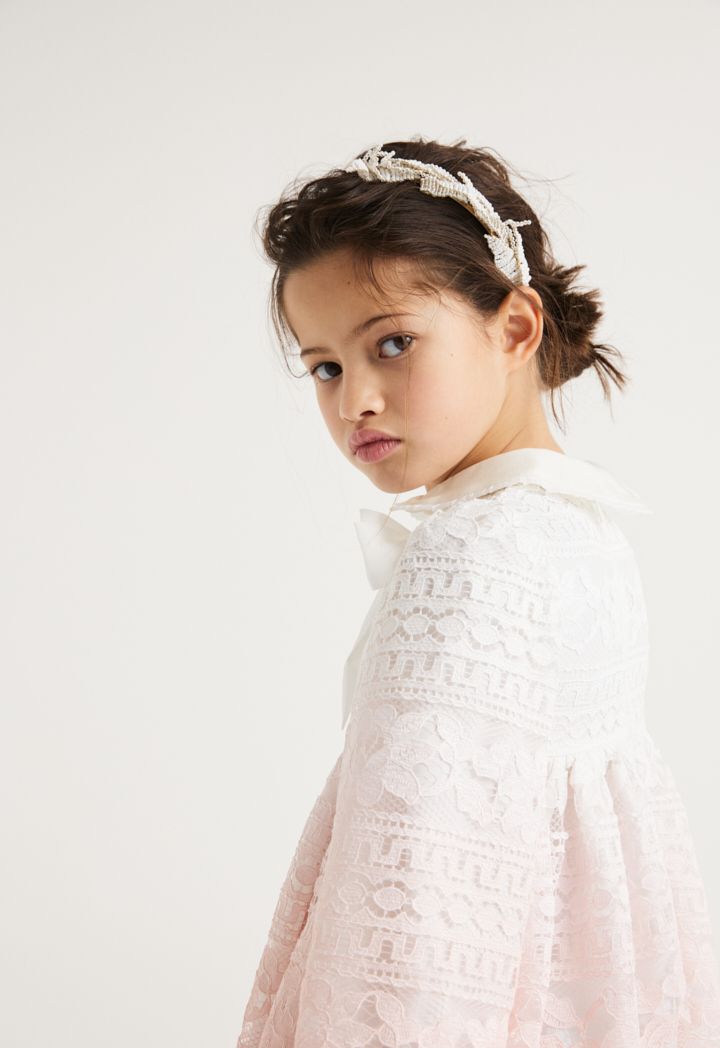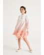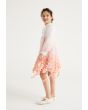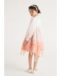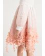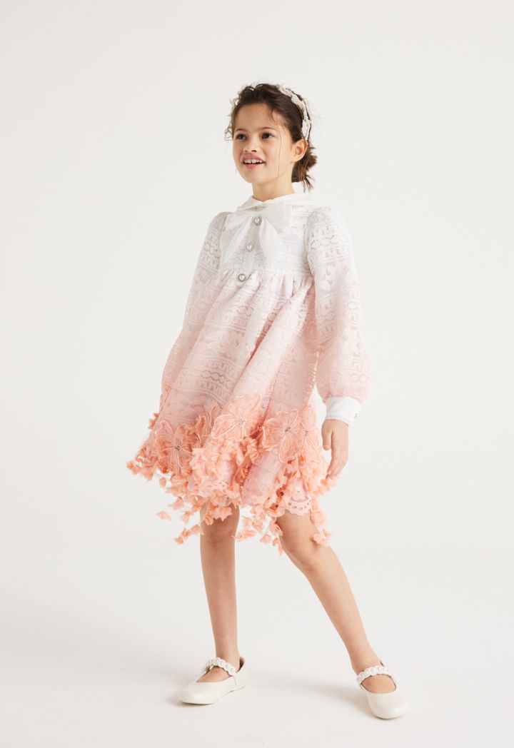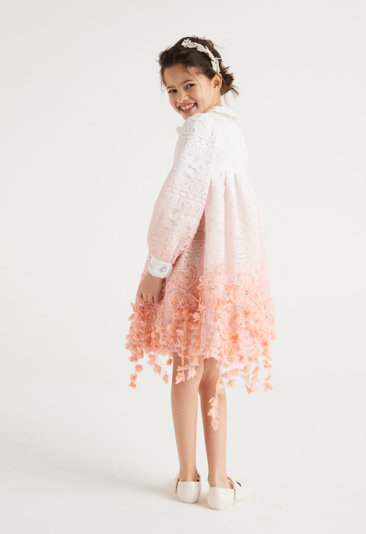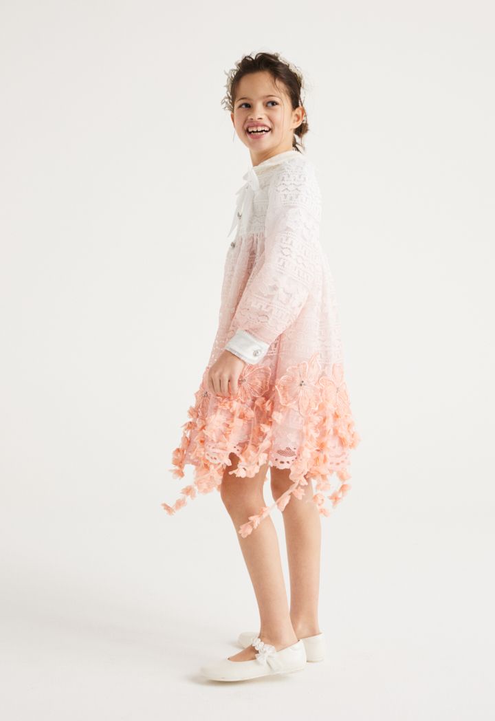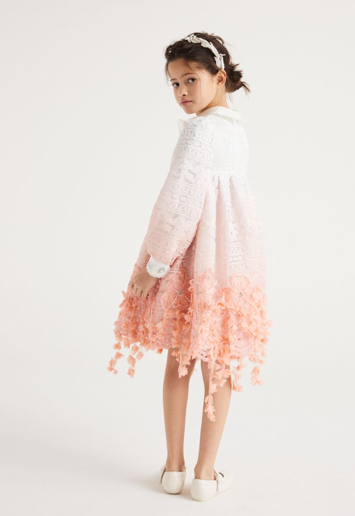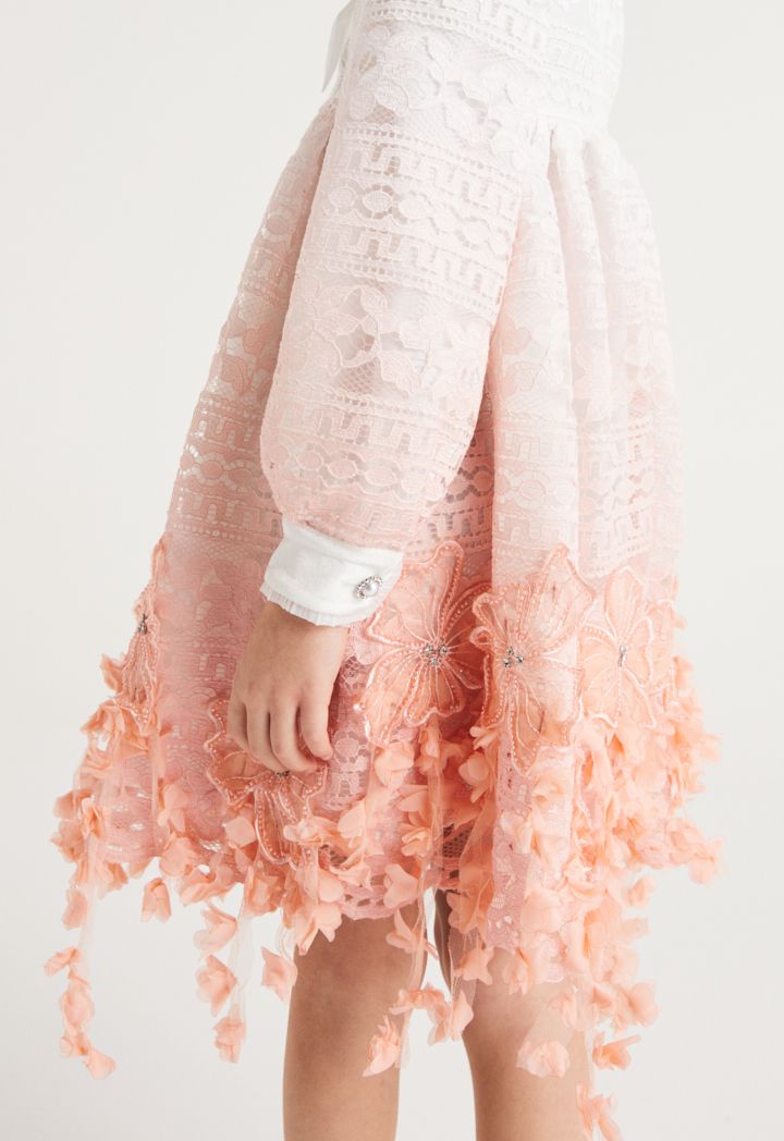 A modern design of a dress featuring floral fringes along the front and the back with lace touches.