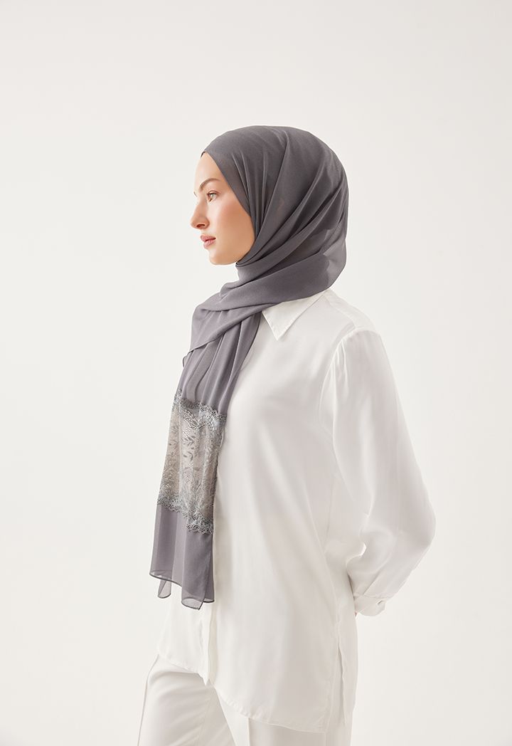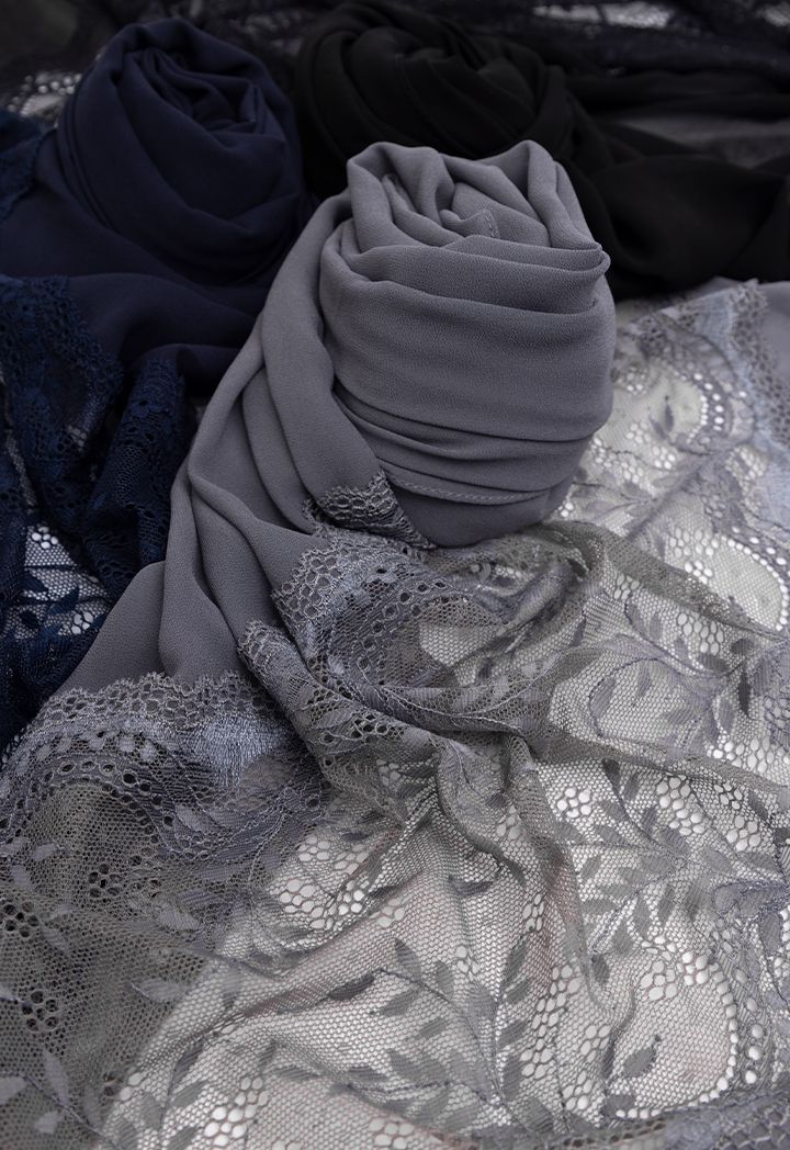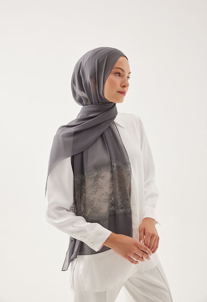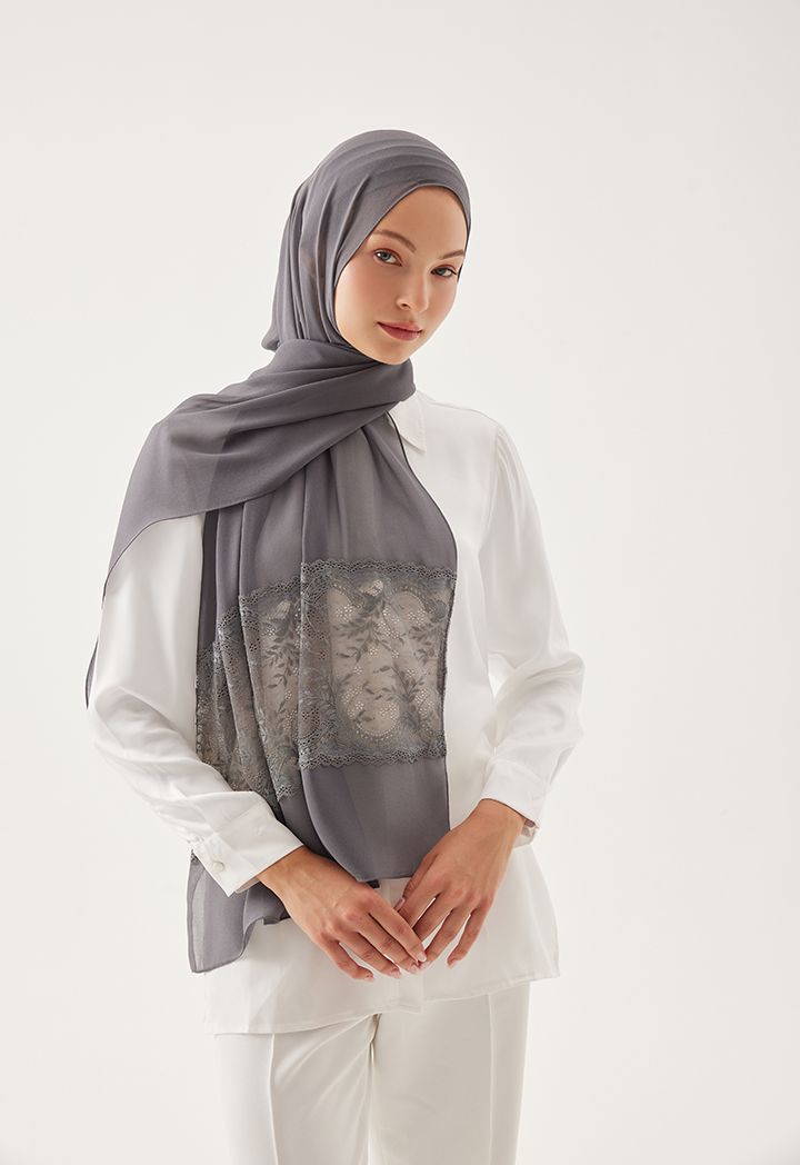 Expand your hijab collection with this extravagant design that features stylish floral lace touches.