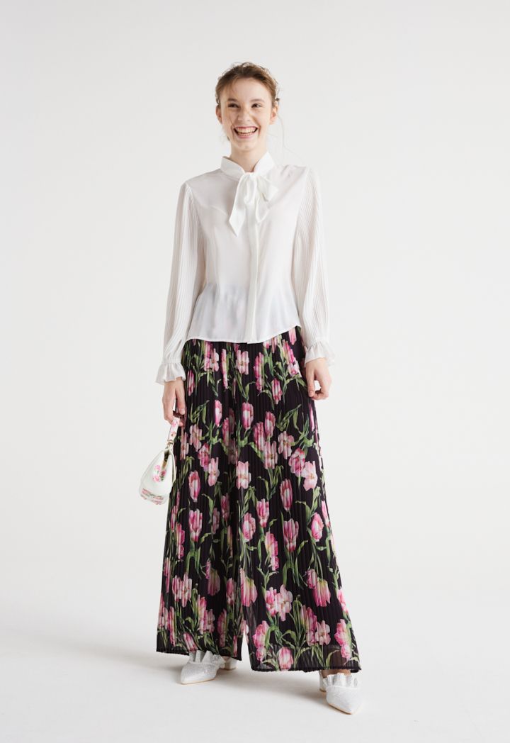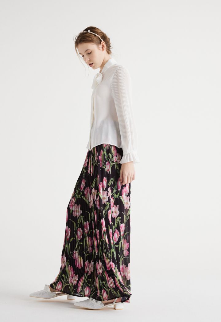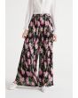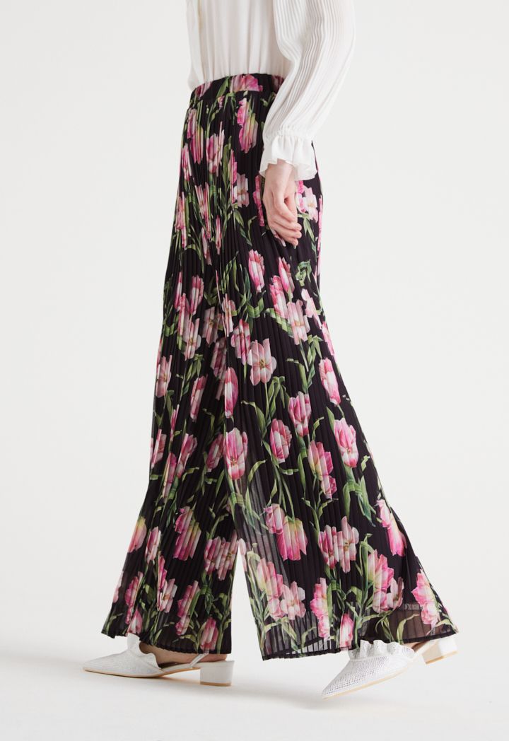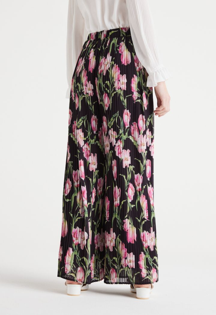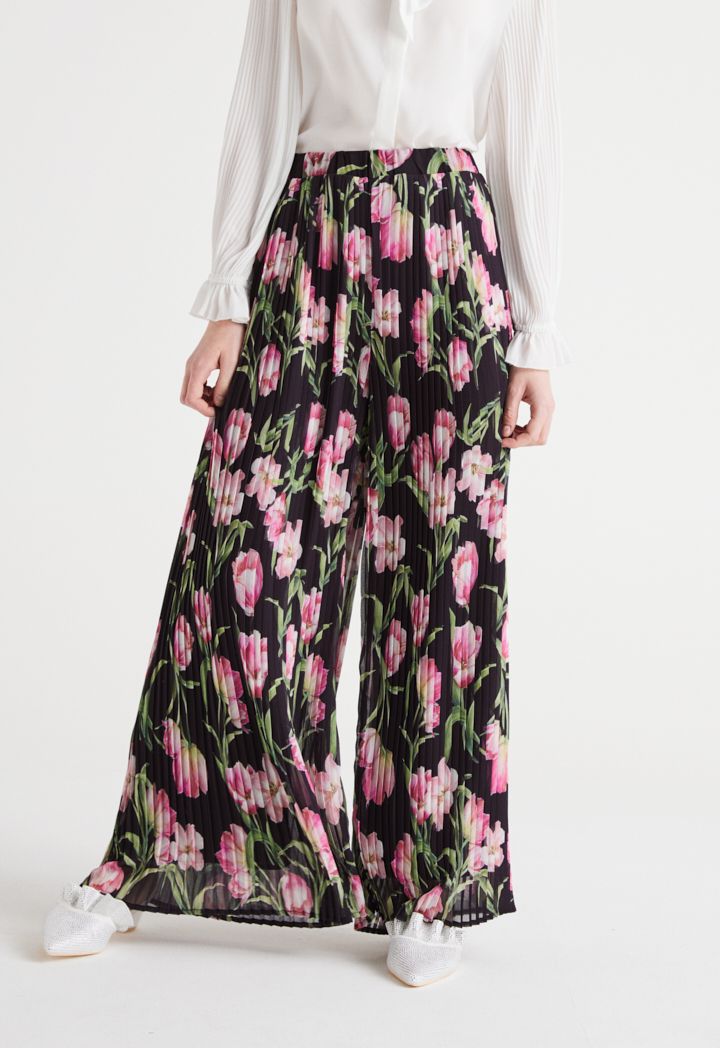 A floral pleated palazzo pair of trousers that features an elastic waist and an attached inner lining.