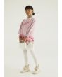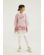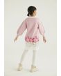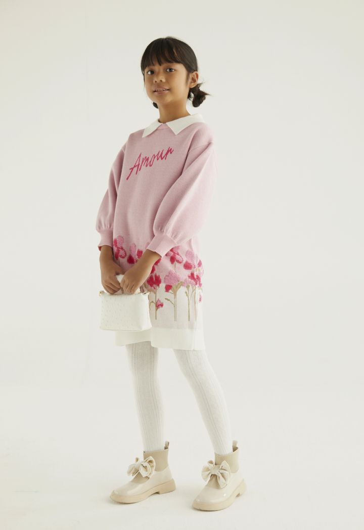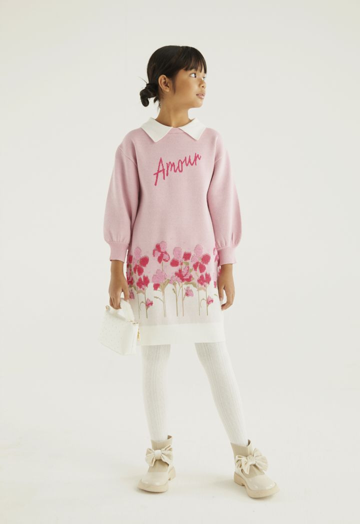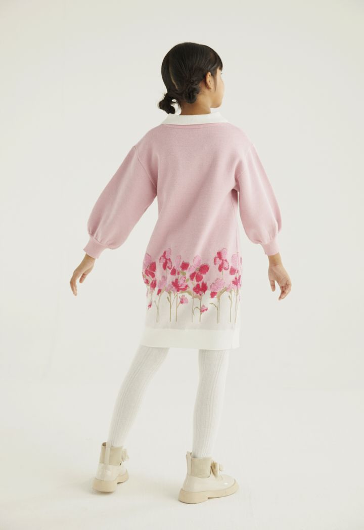 A vibrant sweater dress that features a printed floral design and long sleeves.