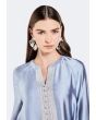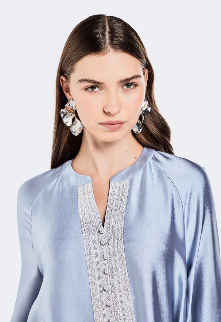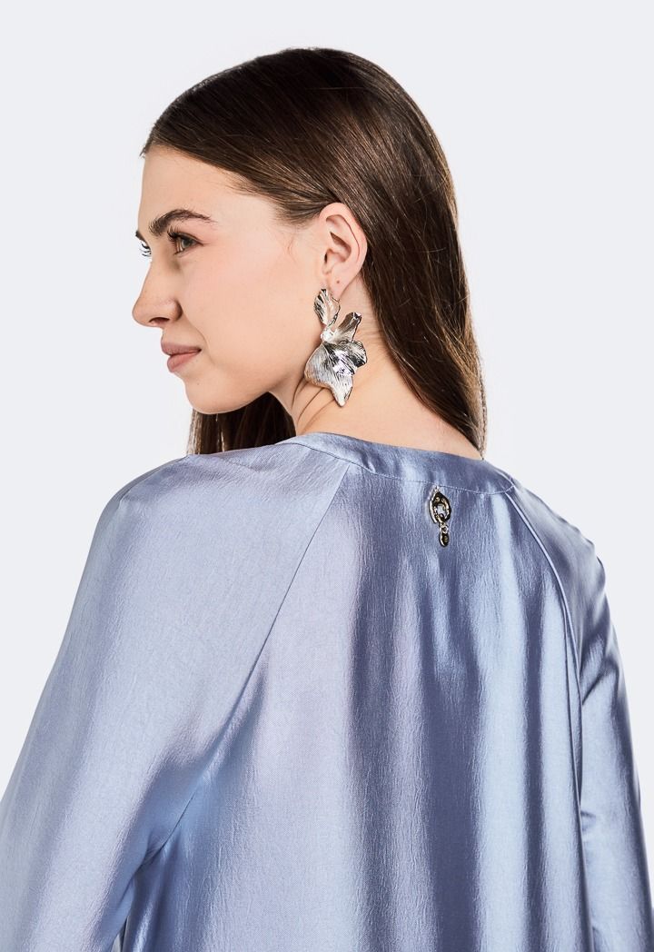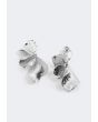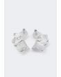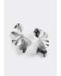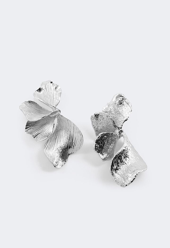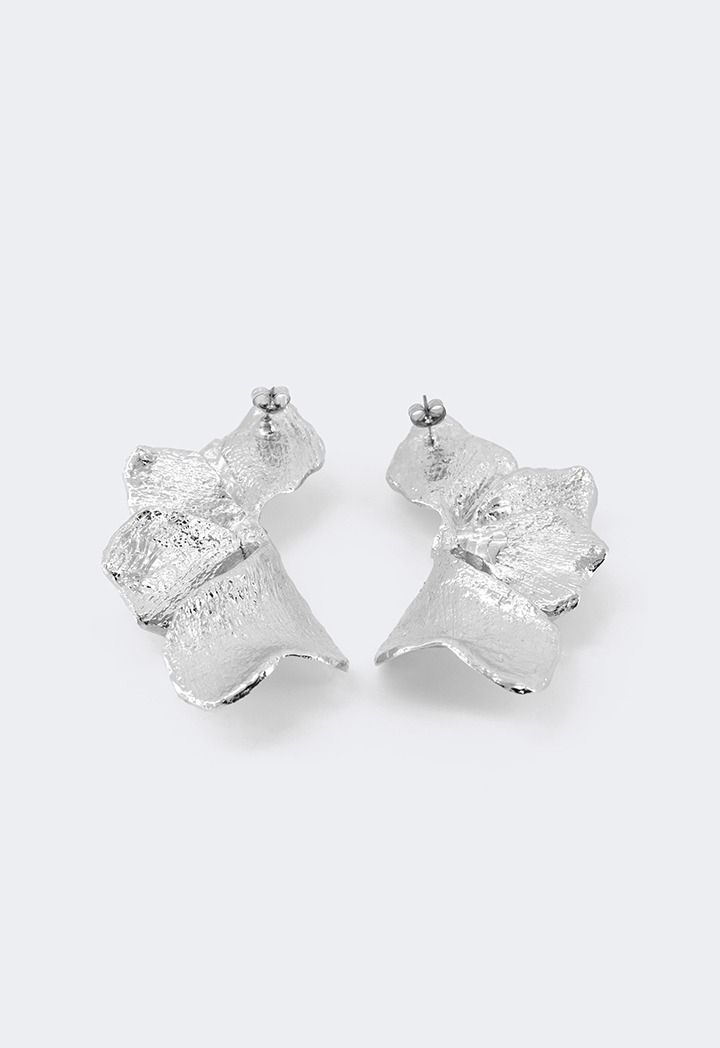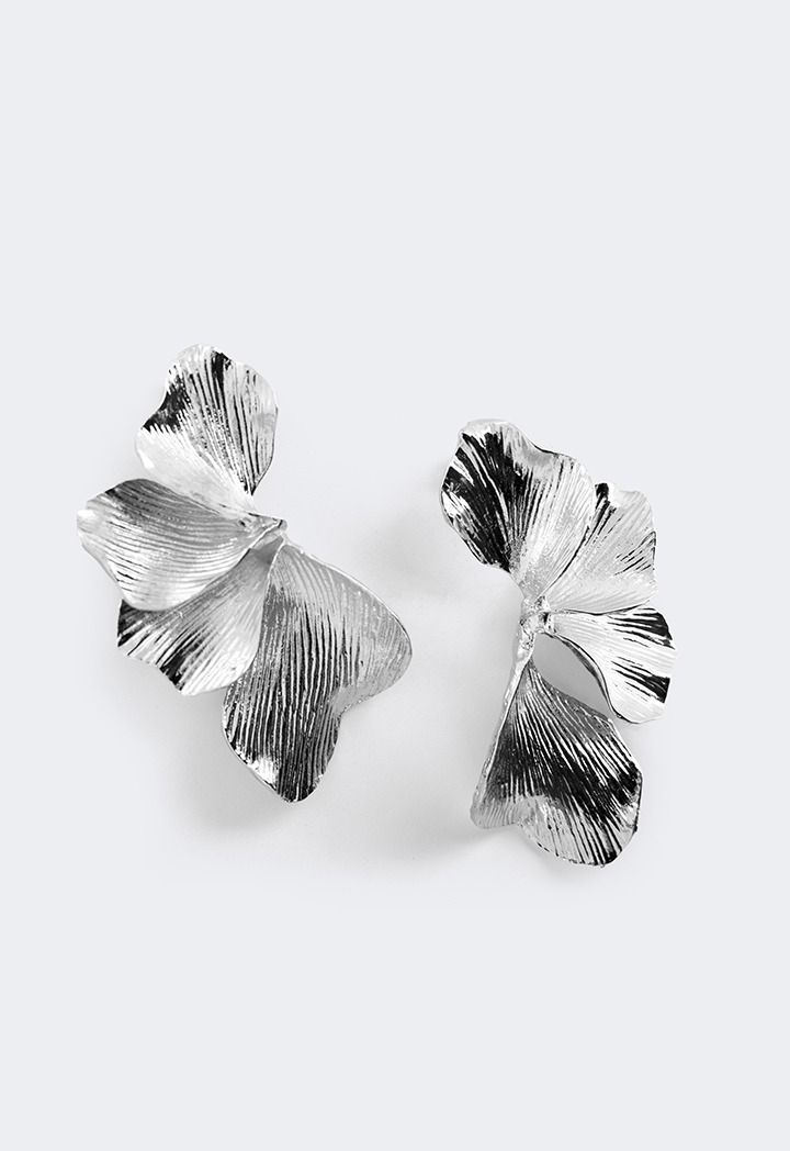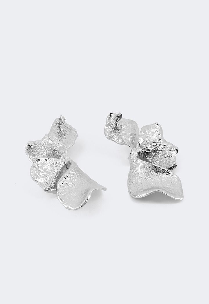 A unique pair of earrings that features a metallic floral petal design inspired by the poppy flower.