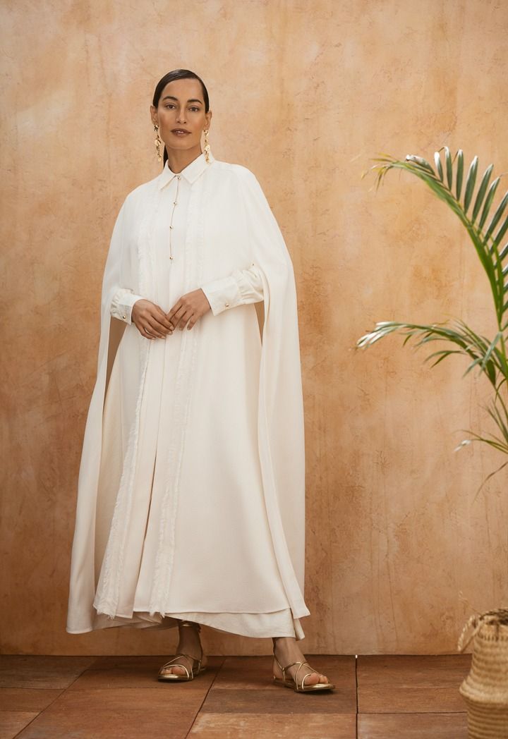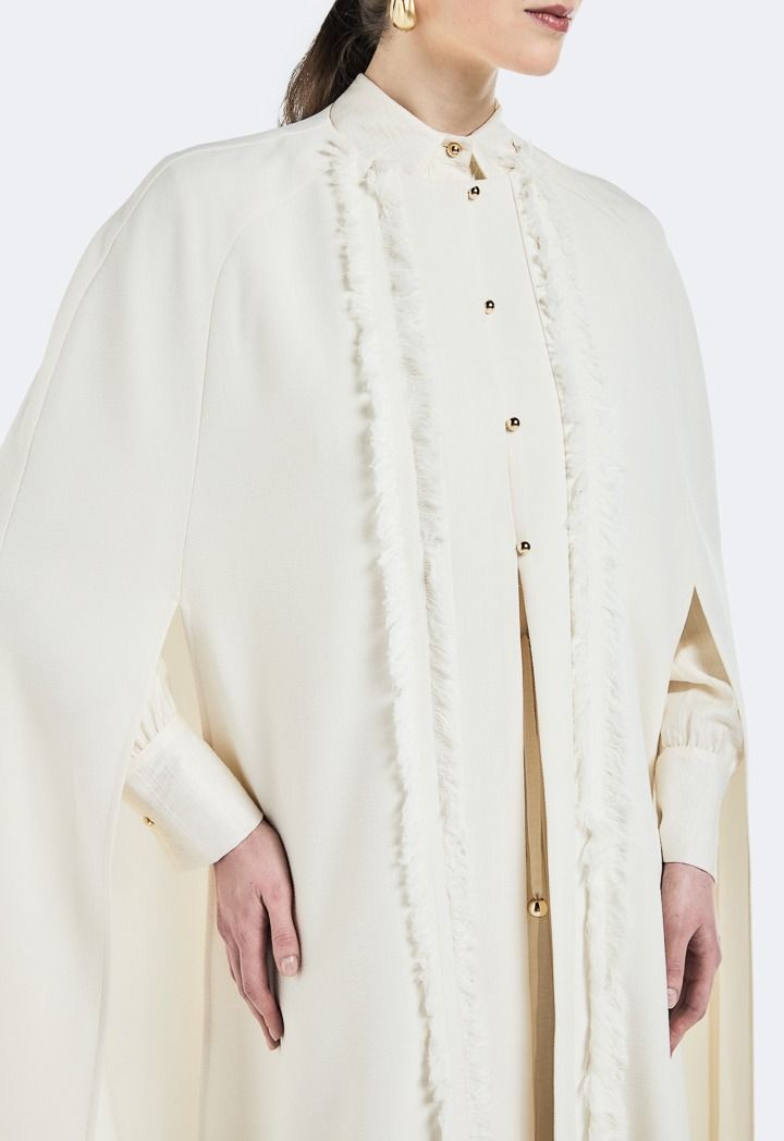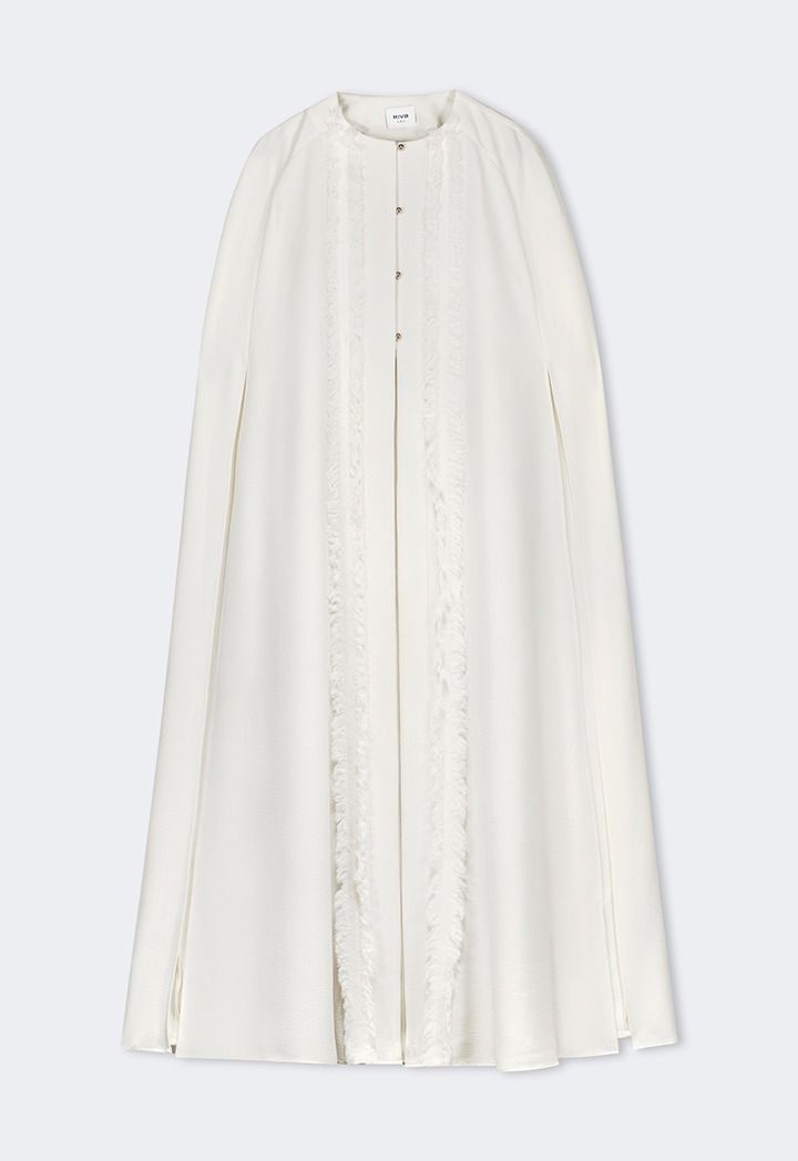 This cape is an exquisitely crafted piece. The cape is designed with frayed details for a sophisticated look.