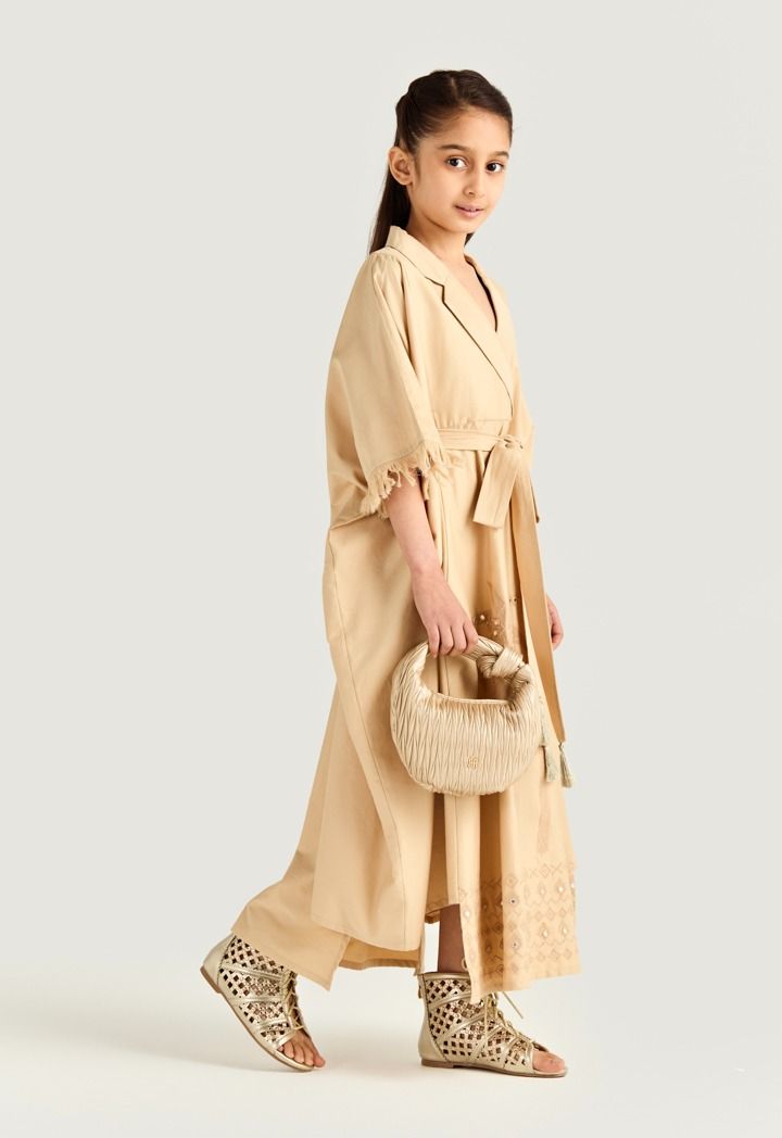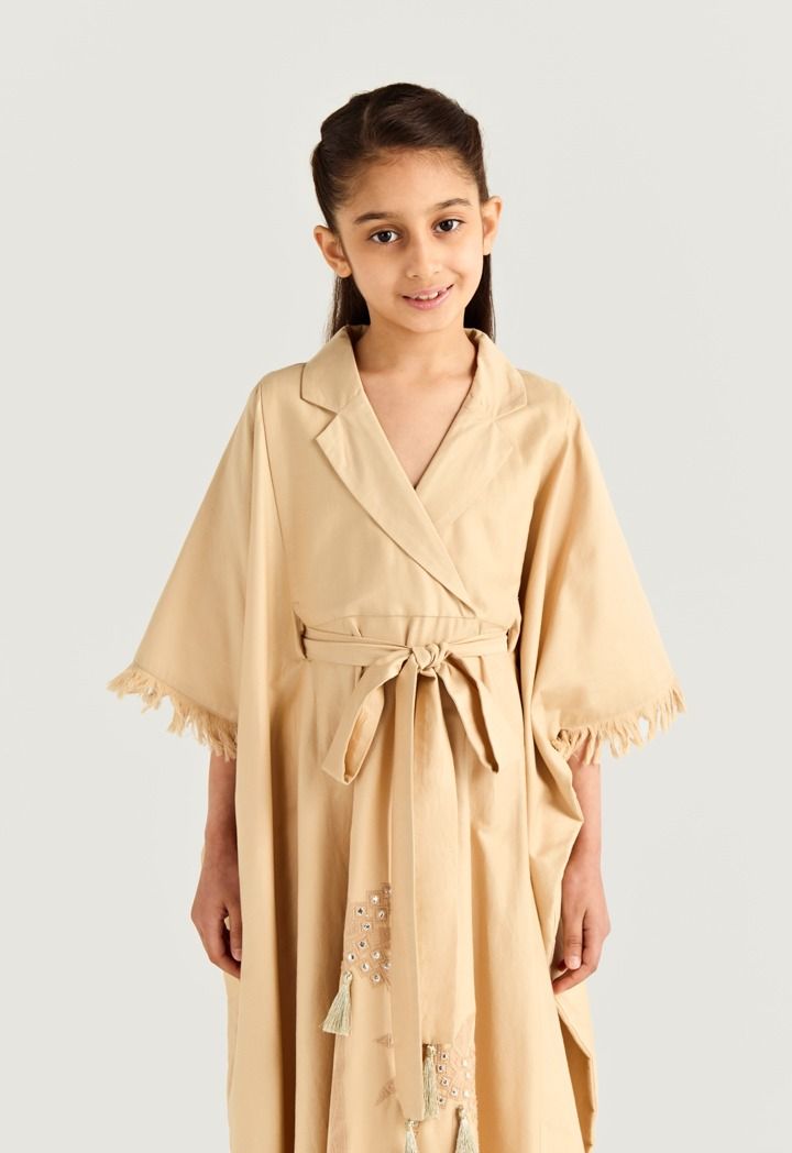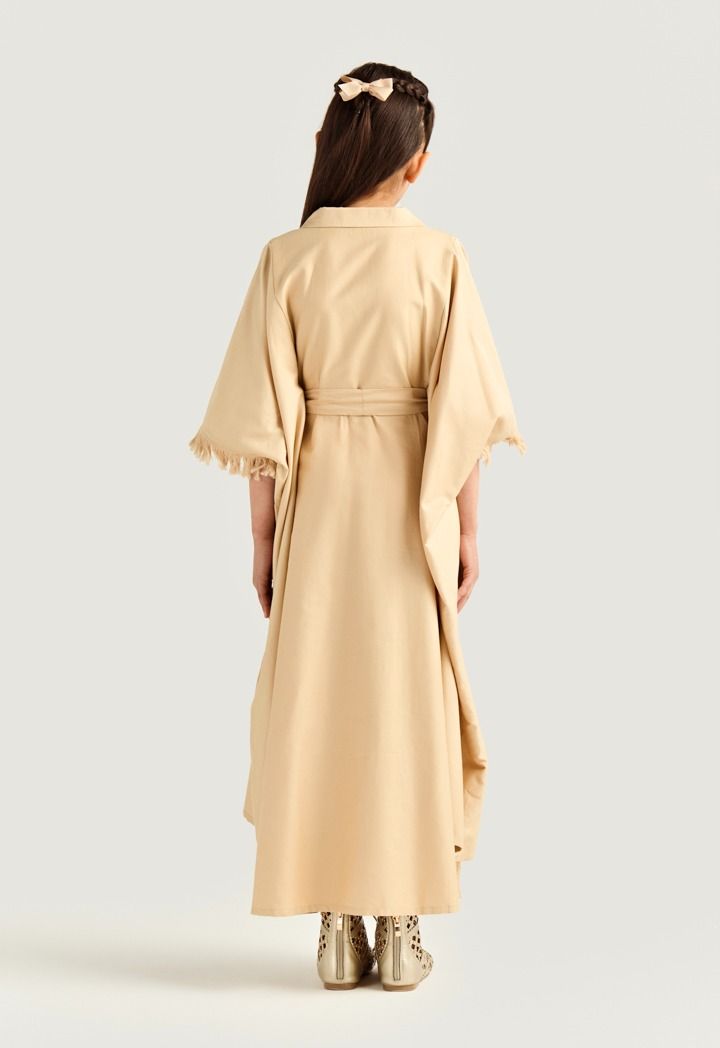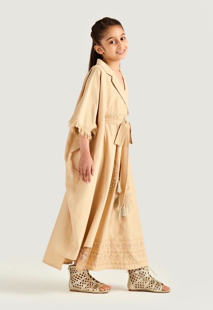 Fringed sleeve embroidered kaftan brings playful sparkle and flow to your little girl special moments.