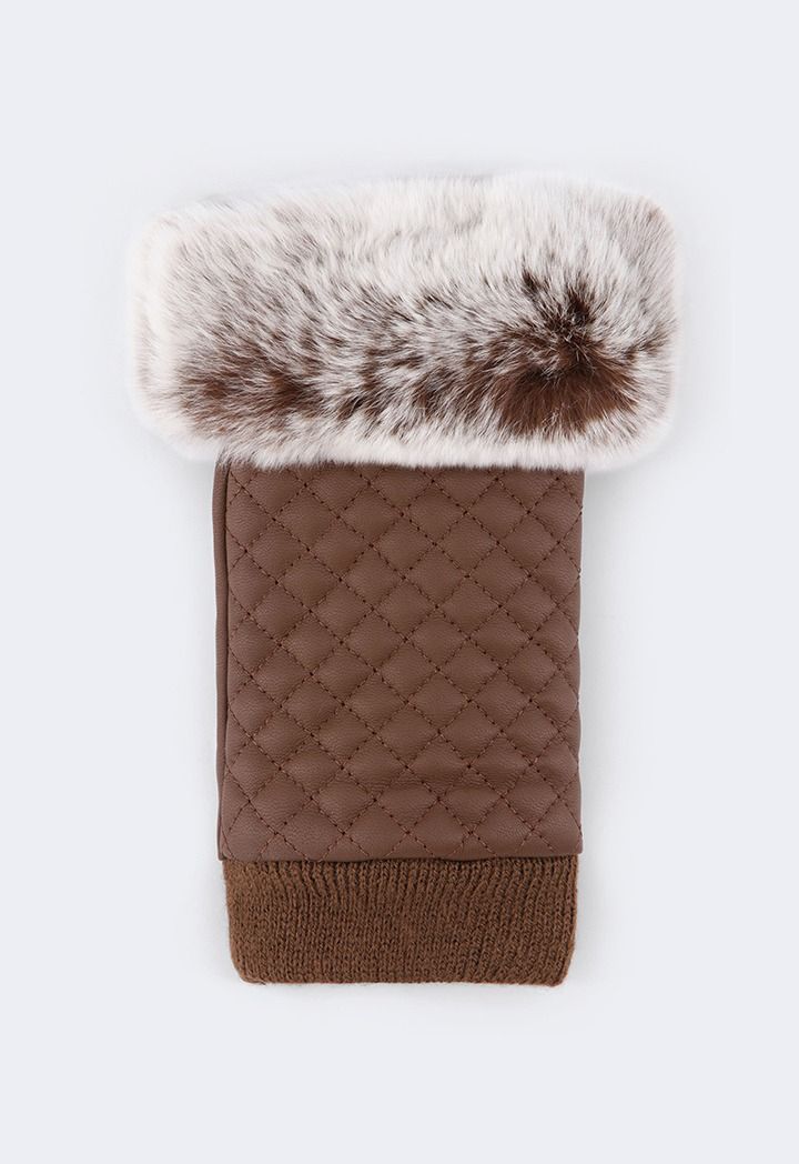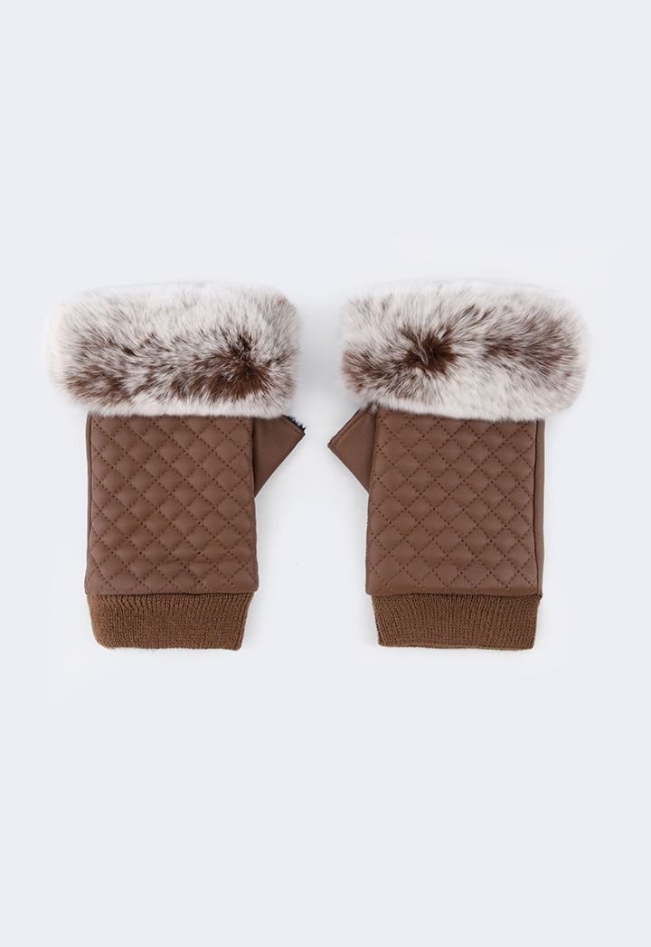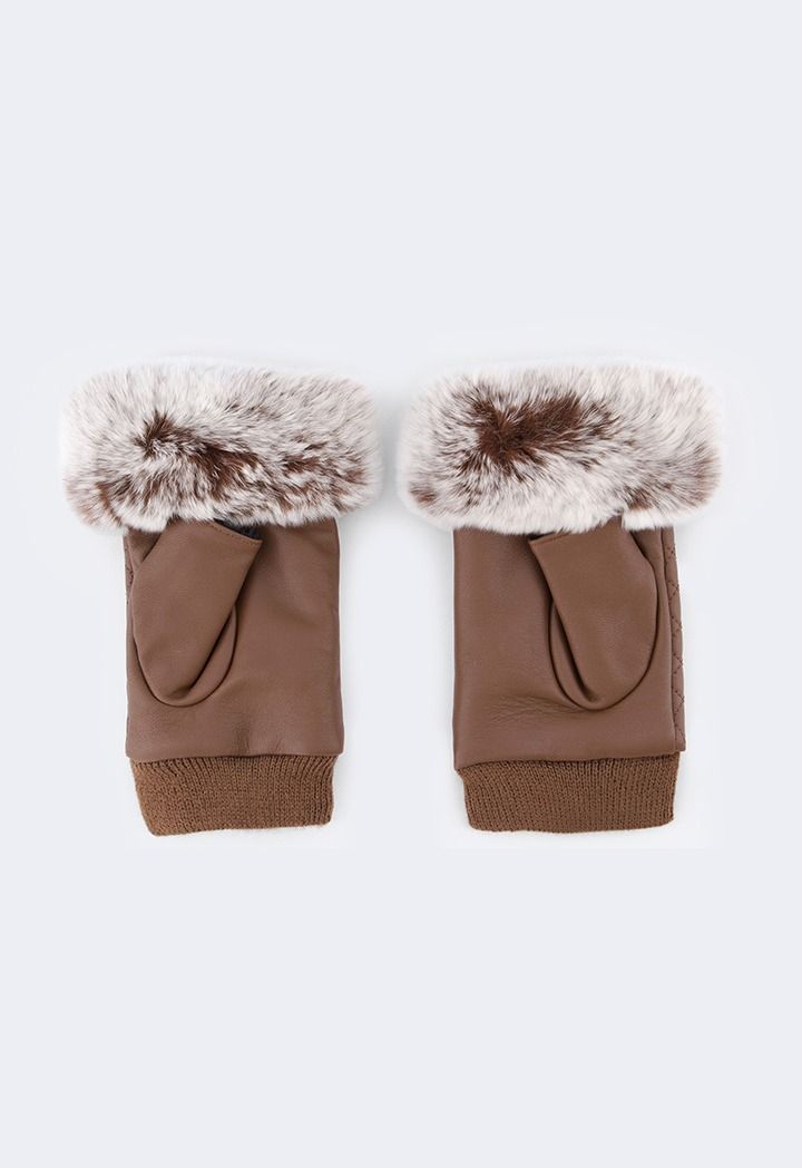 A pair of fingerless solid genuine leather mittens, offering warmth while keeping your electronics within easy reach.