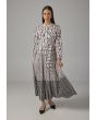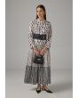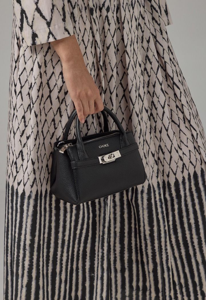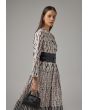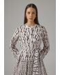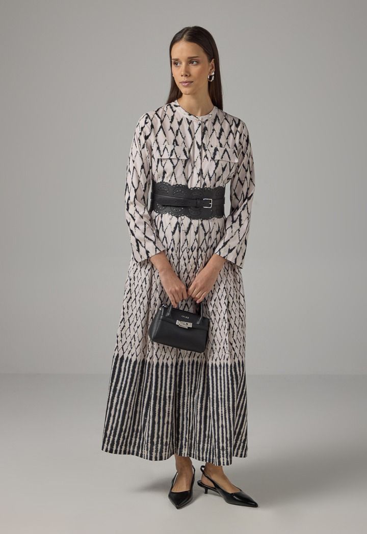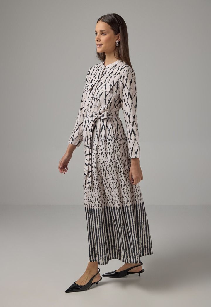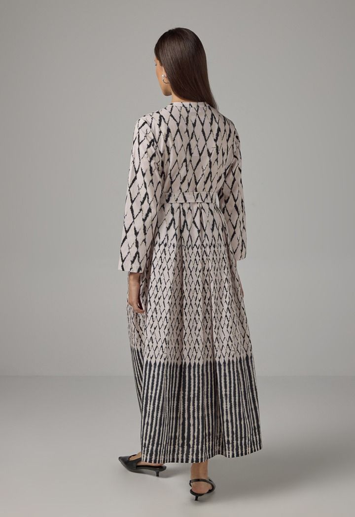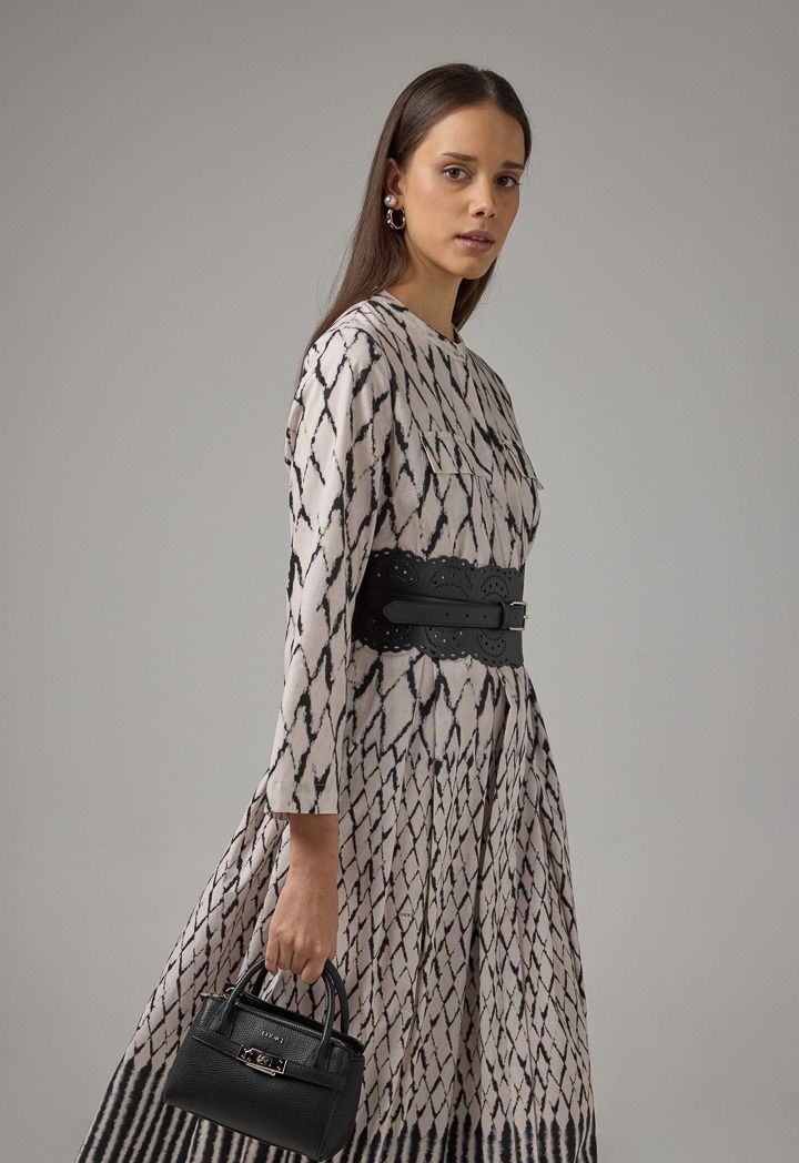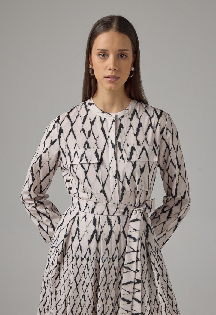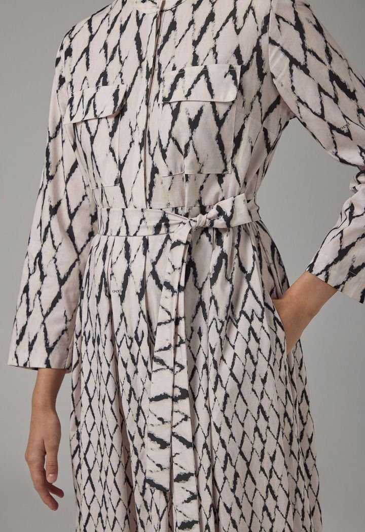 Design: Geometrical Print, Front Flap Pockets, Self Fabric Belt, Pleated, Logo Details