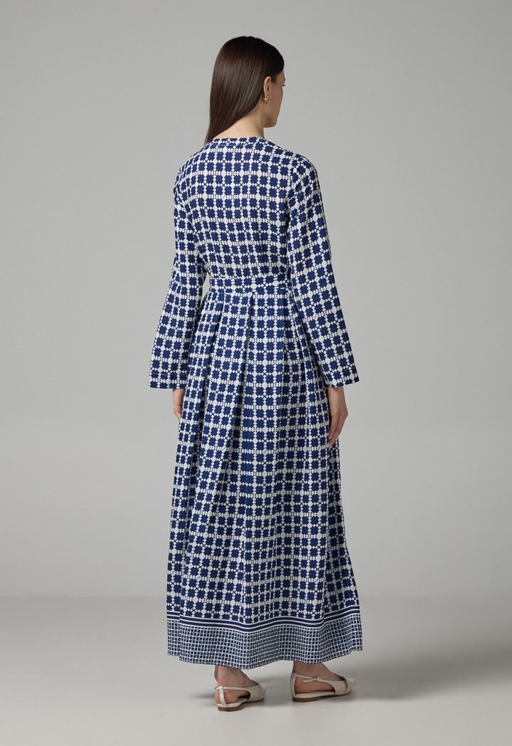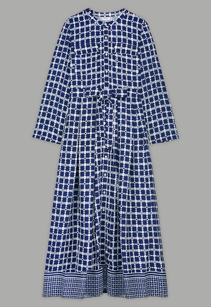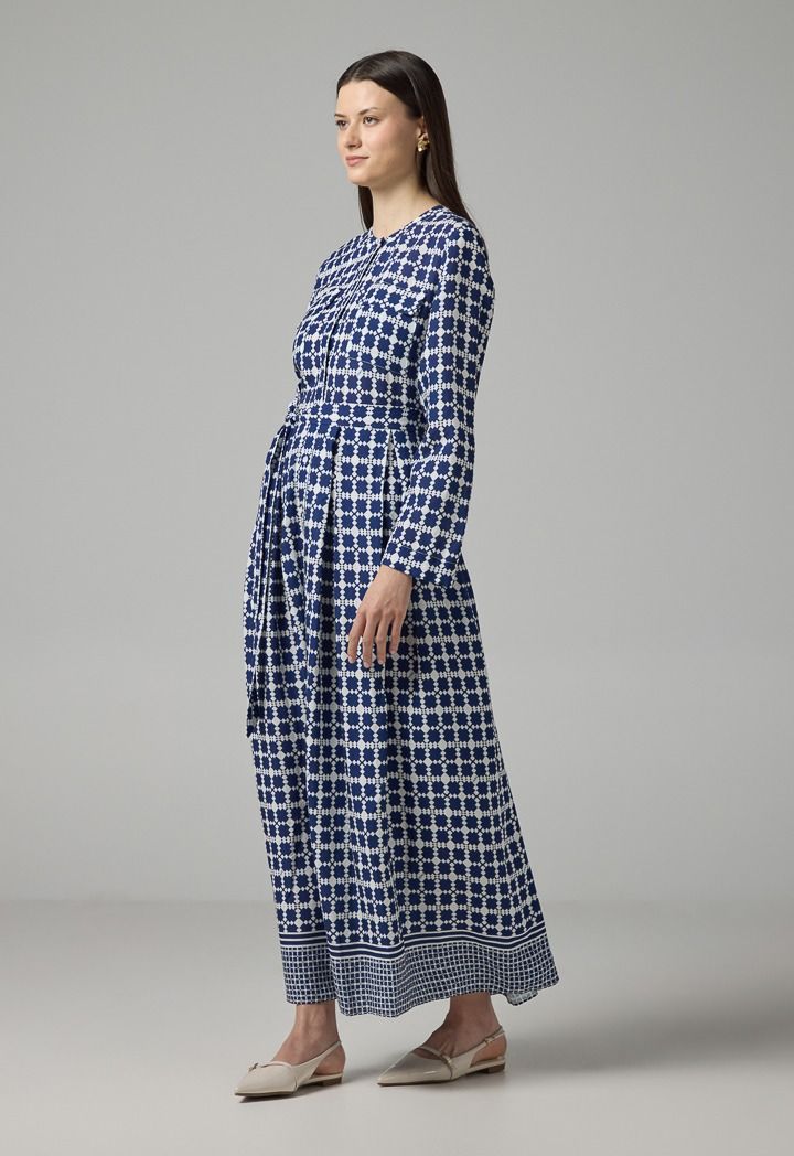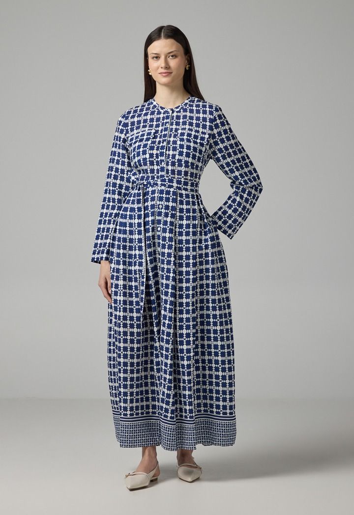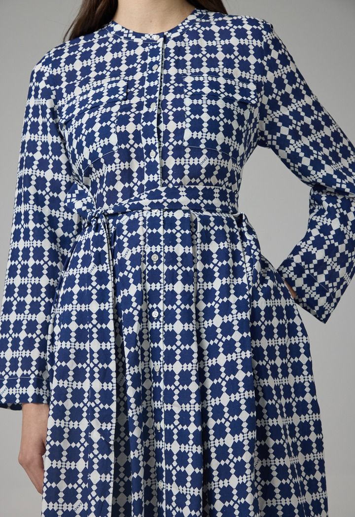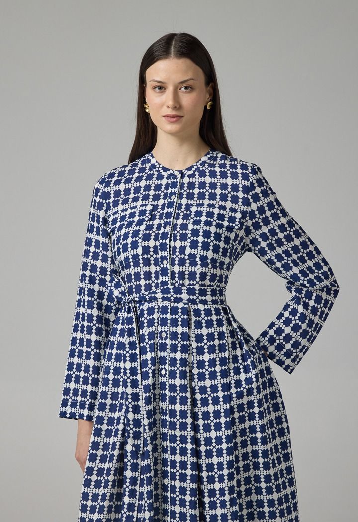 Design: Geometrical Print, Self-Fabric Belt, Pleated, Front Flap Pockets, Flared, Logo Details