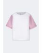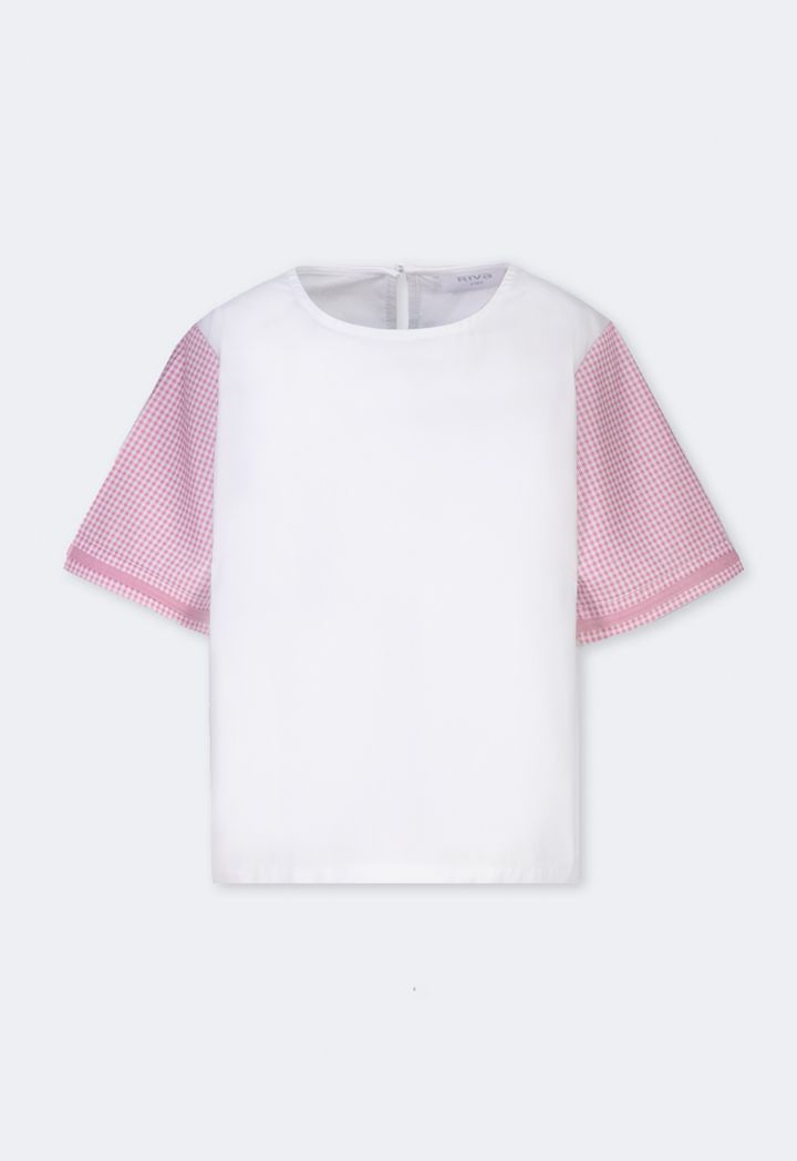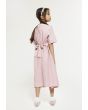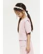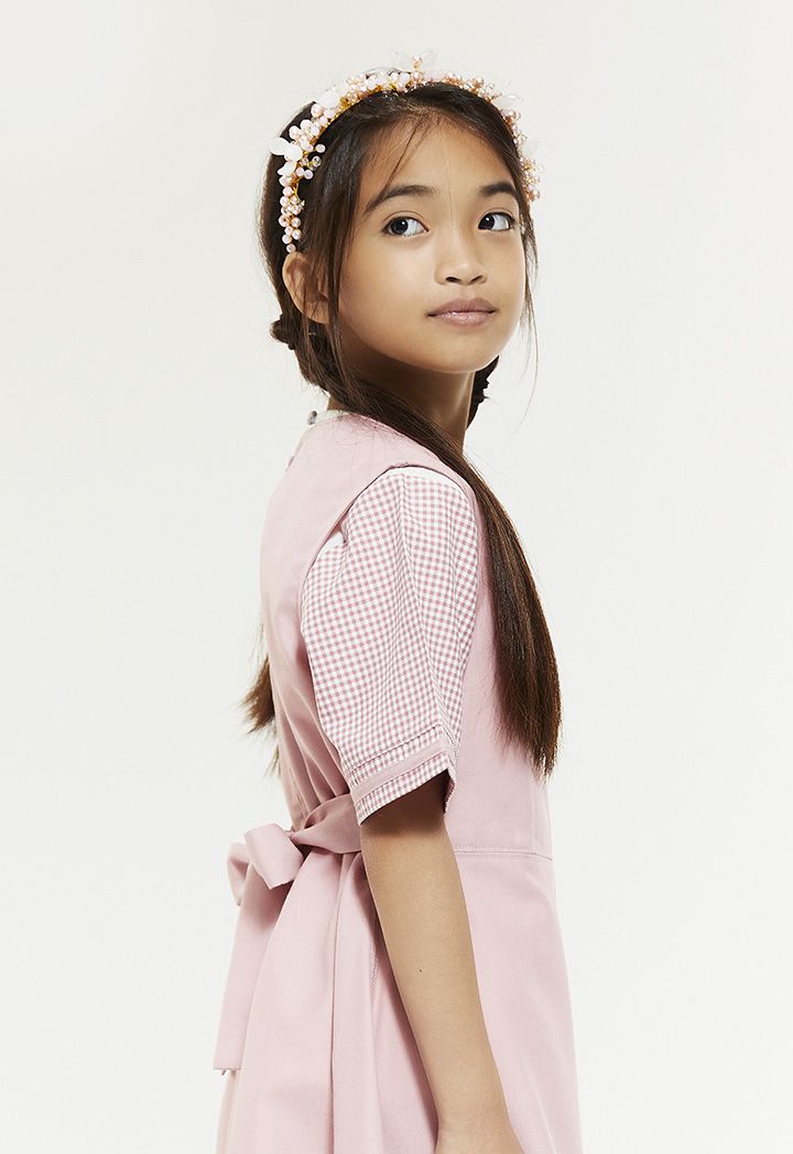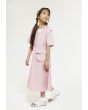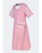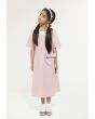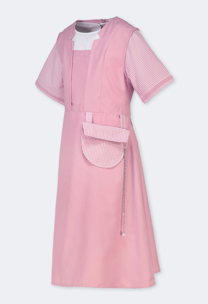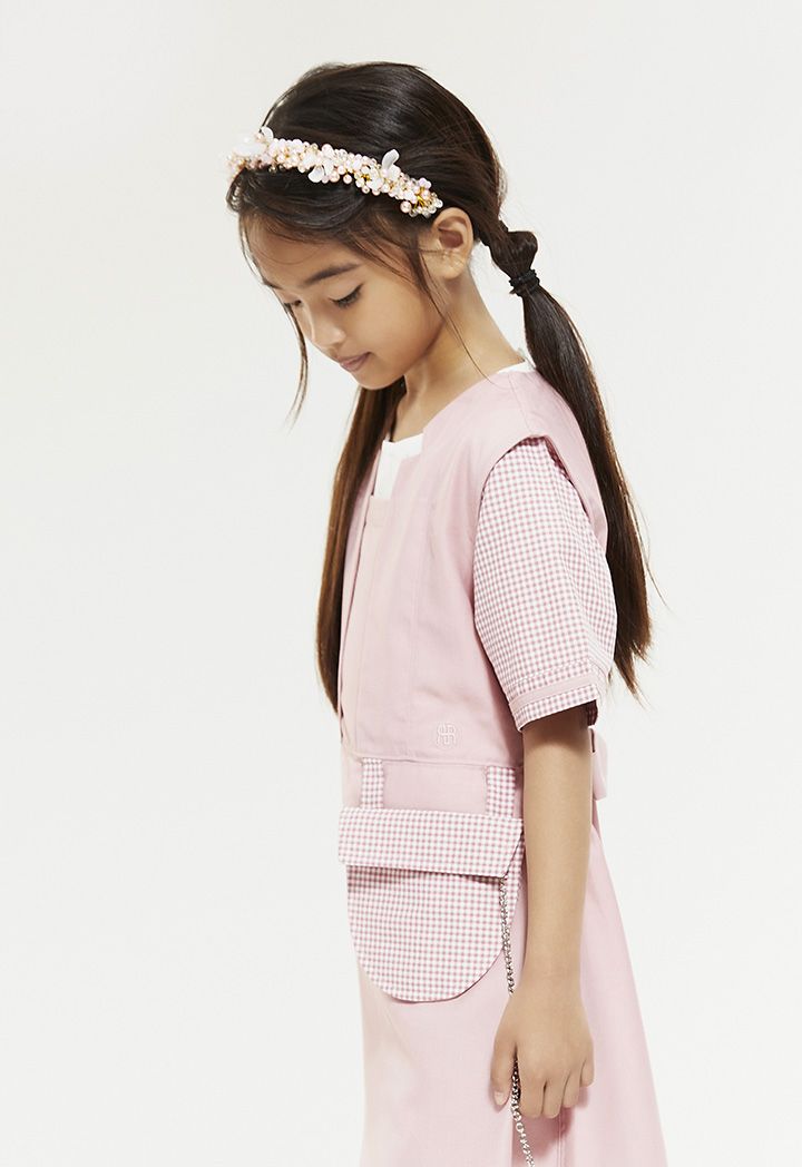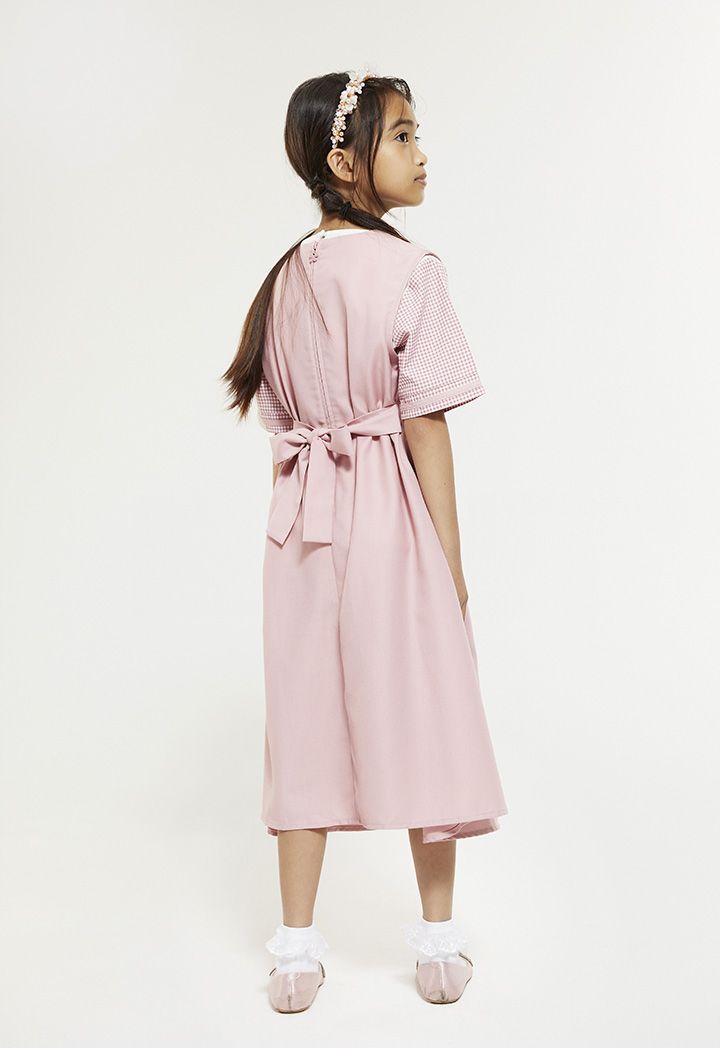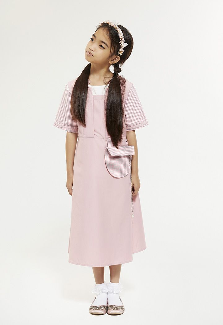 A school uniform set that features a short sleeves top and a sleeveless dress with a waist bag.