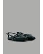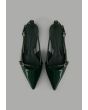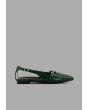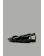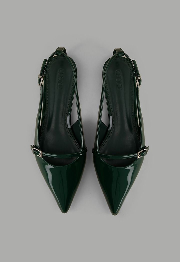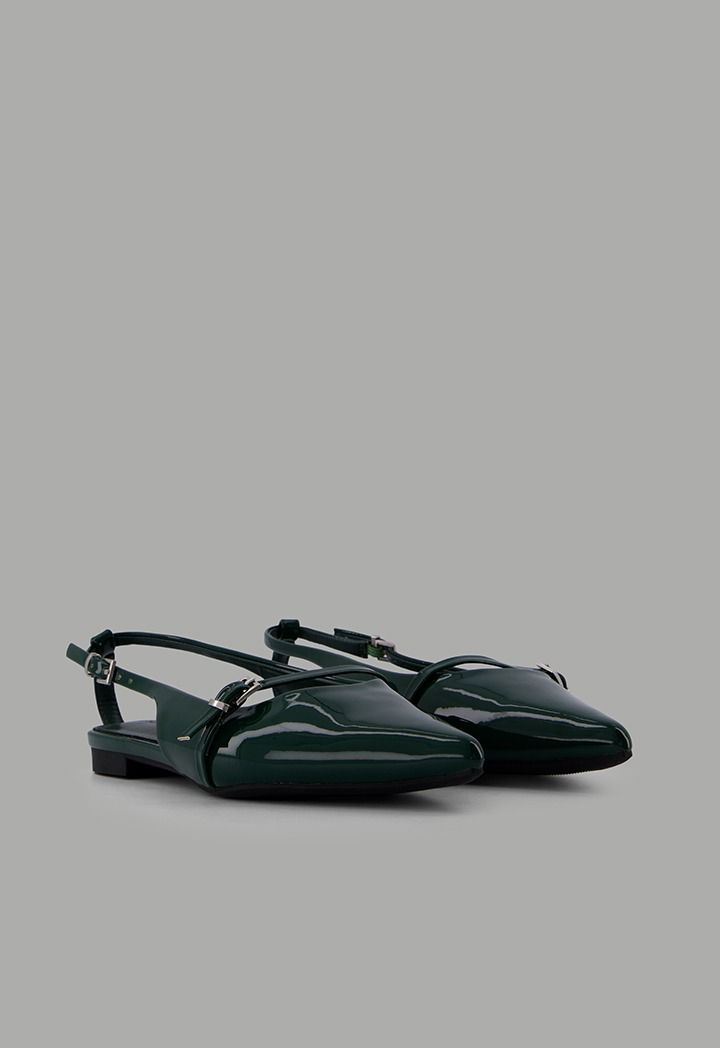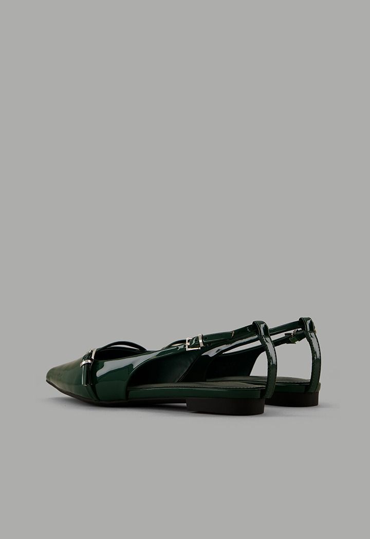 A pair of modern flats that features a glossy buckled strap design that is on trend.