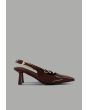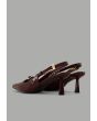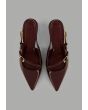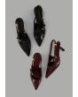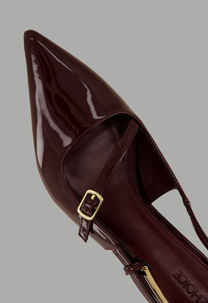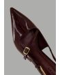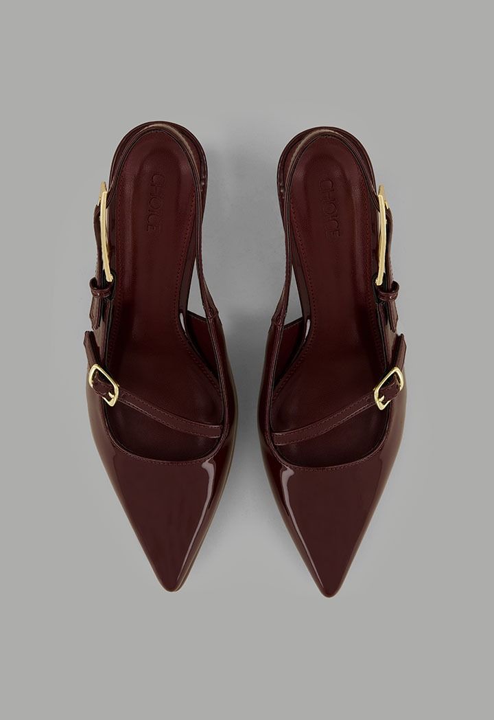 A pair of modern heels that features a glossy buckled strap design that is on trend.
