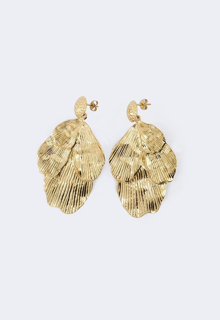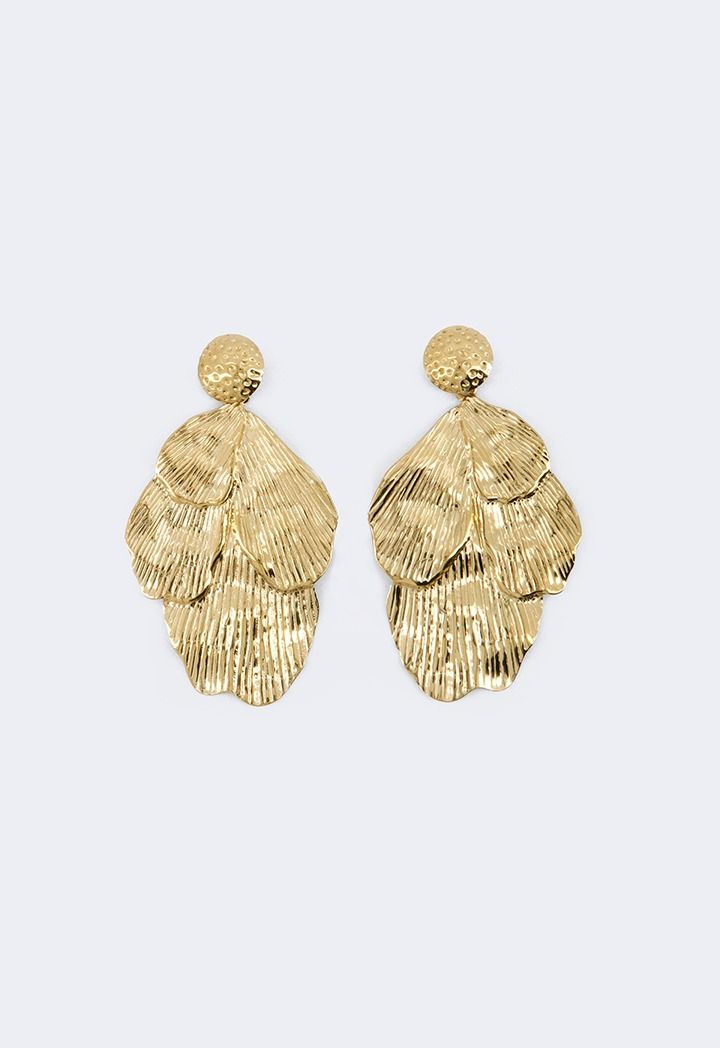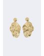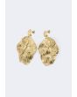 A pair of metallic earrings that feature a hammered floral design.