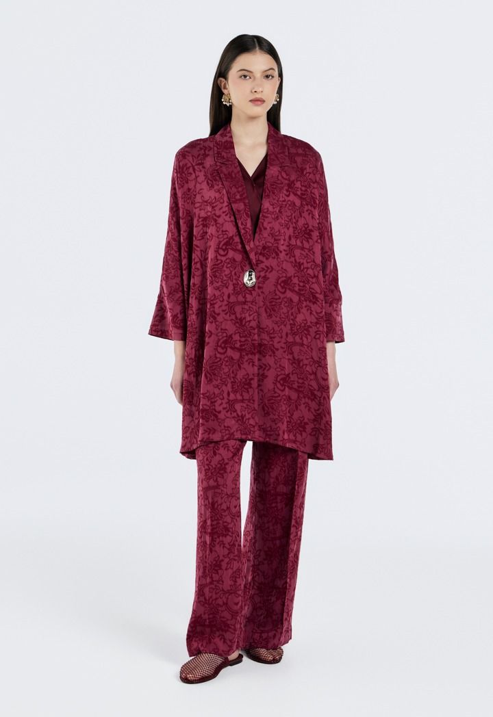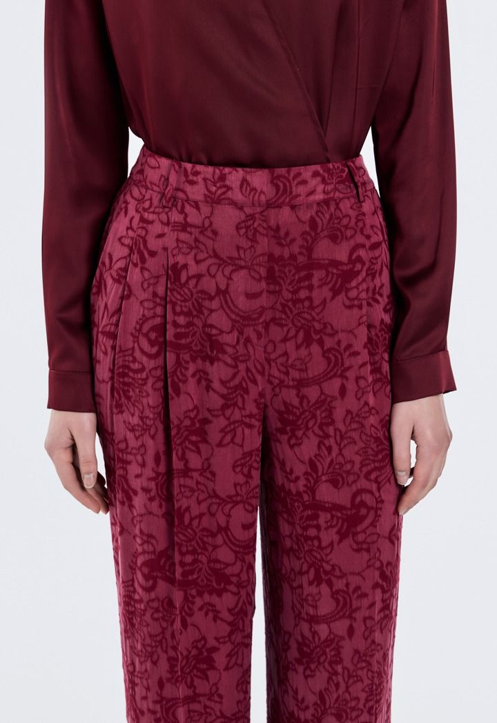 Statement style, jacquard fabric elevates classic trousers with luxurious detail.